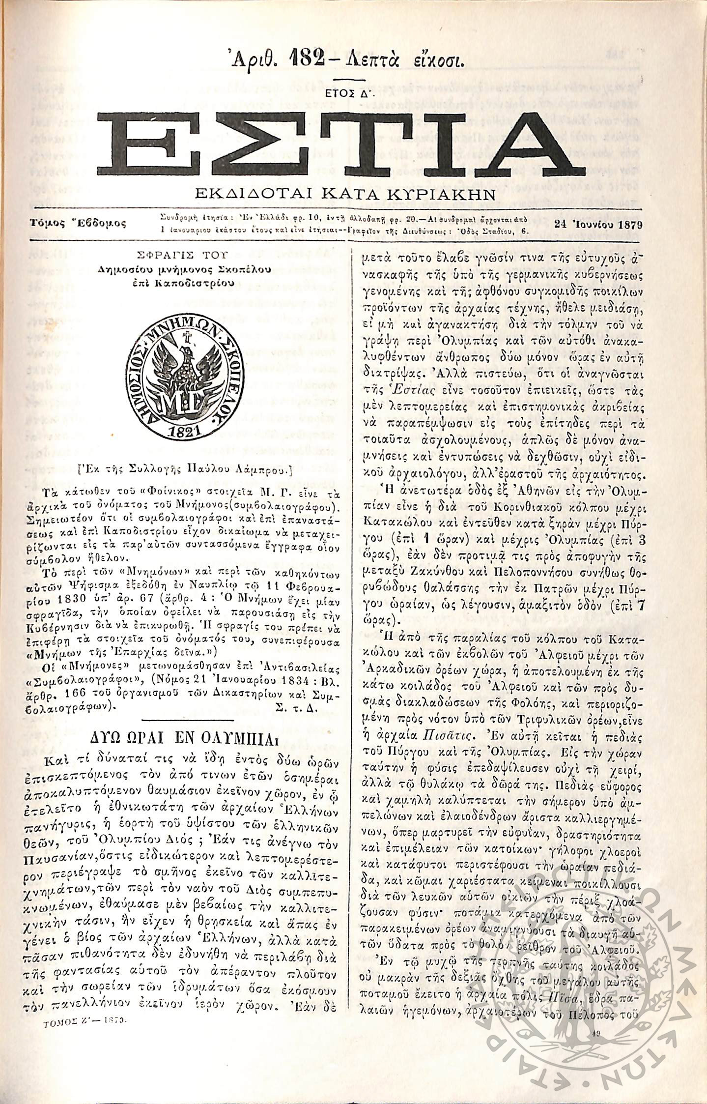 Εστία : Εκδίδοται κατά Κυριακήν - Τόμ. 7 / τχ. 182