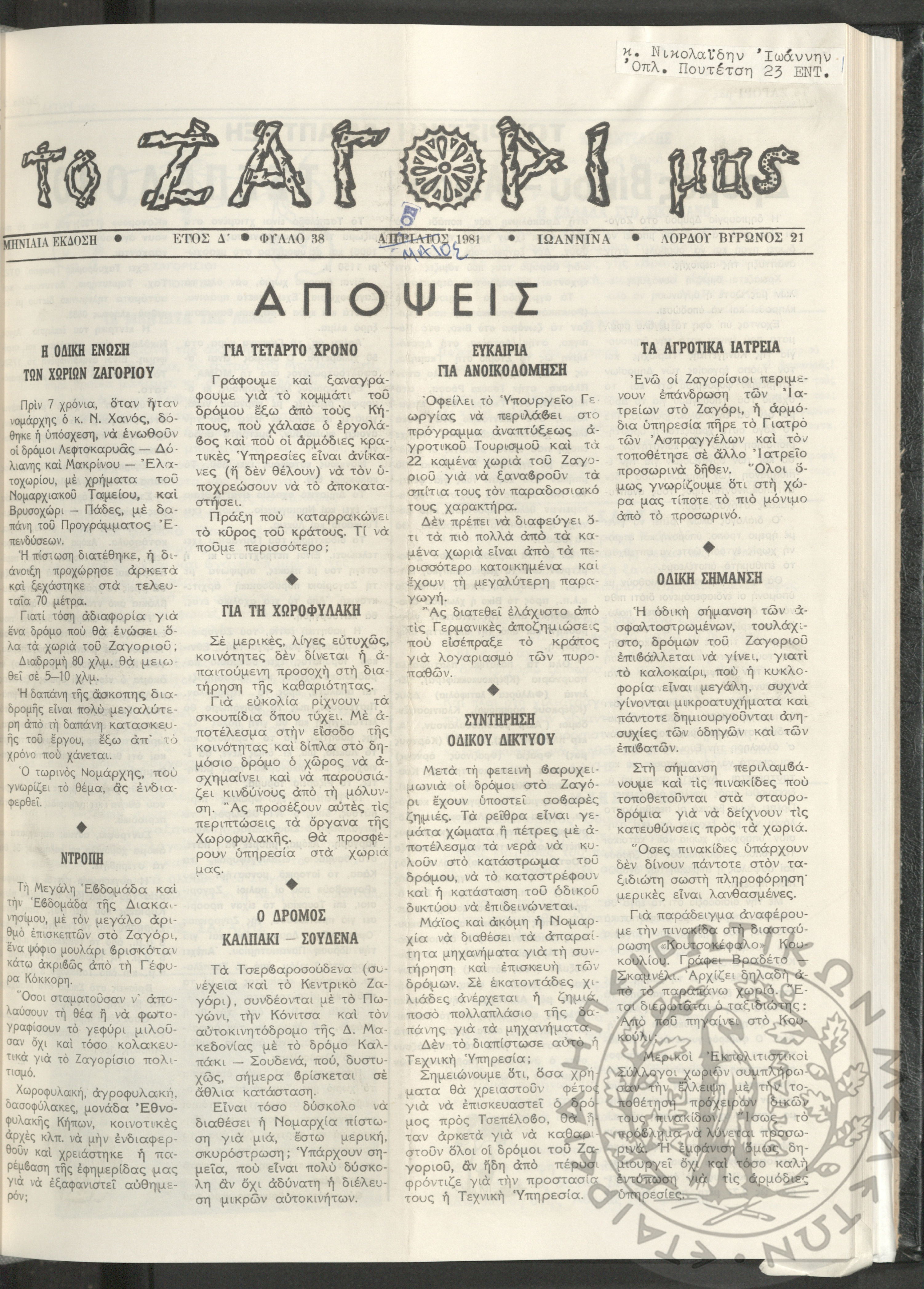 Το Ζαγόρι μας: μηνιαία έκδοση, 1981, φ. 38