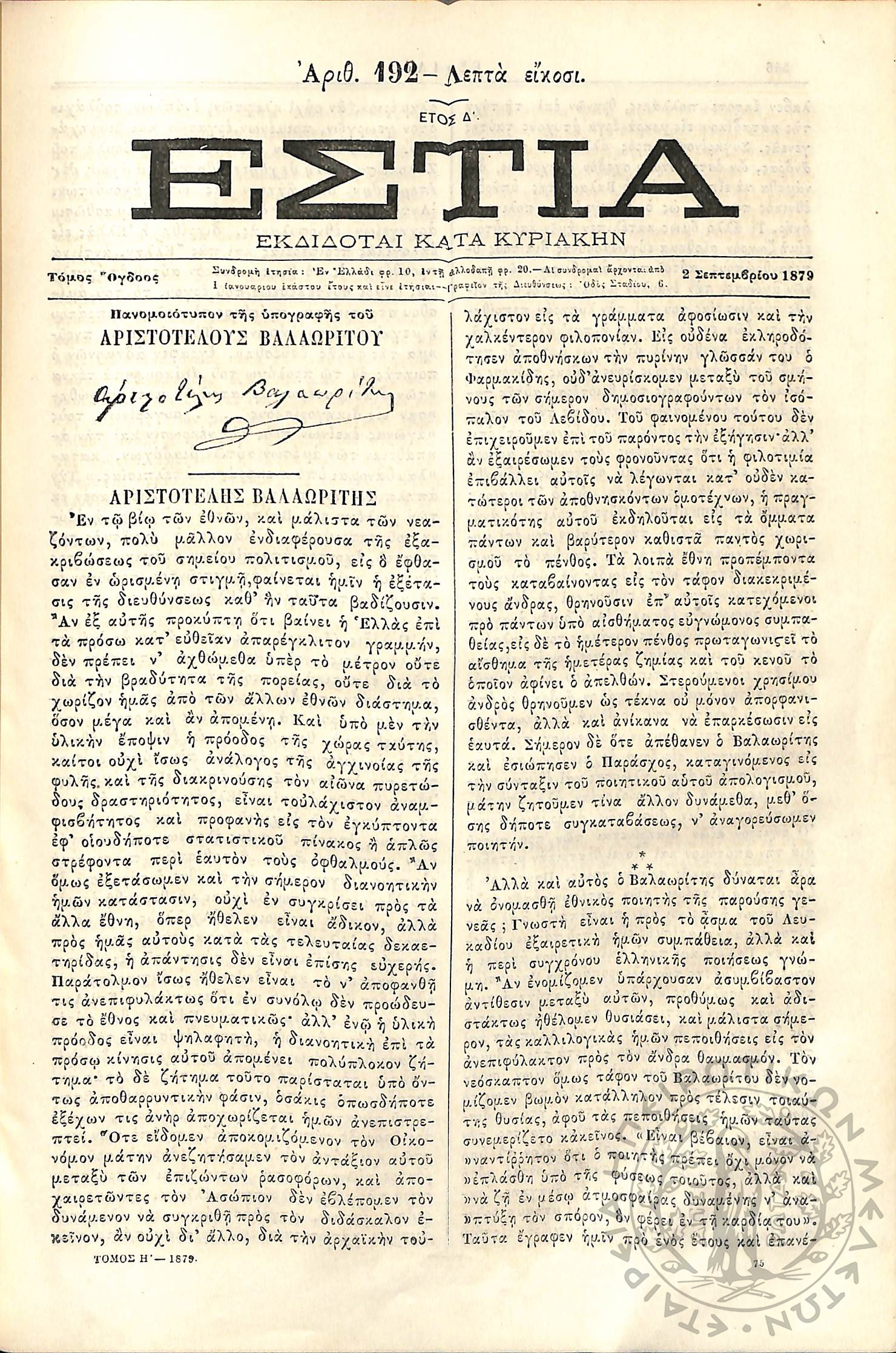 Εστία : Εκδίδοται κατά Κυριακήν - Τόμ. 8 / τχ. 192
