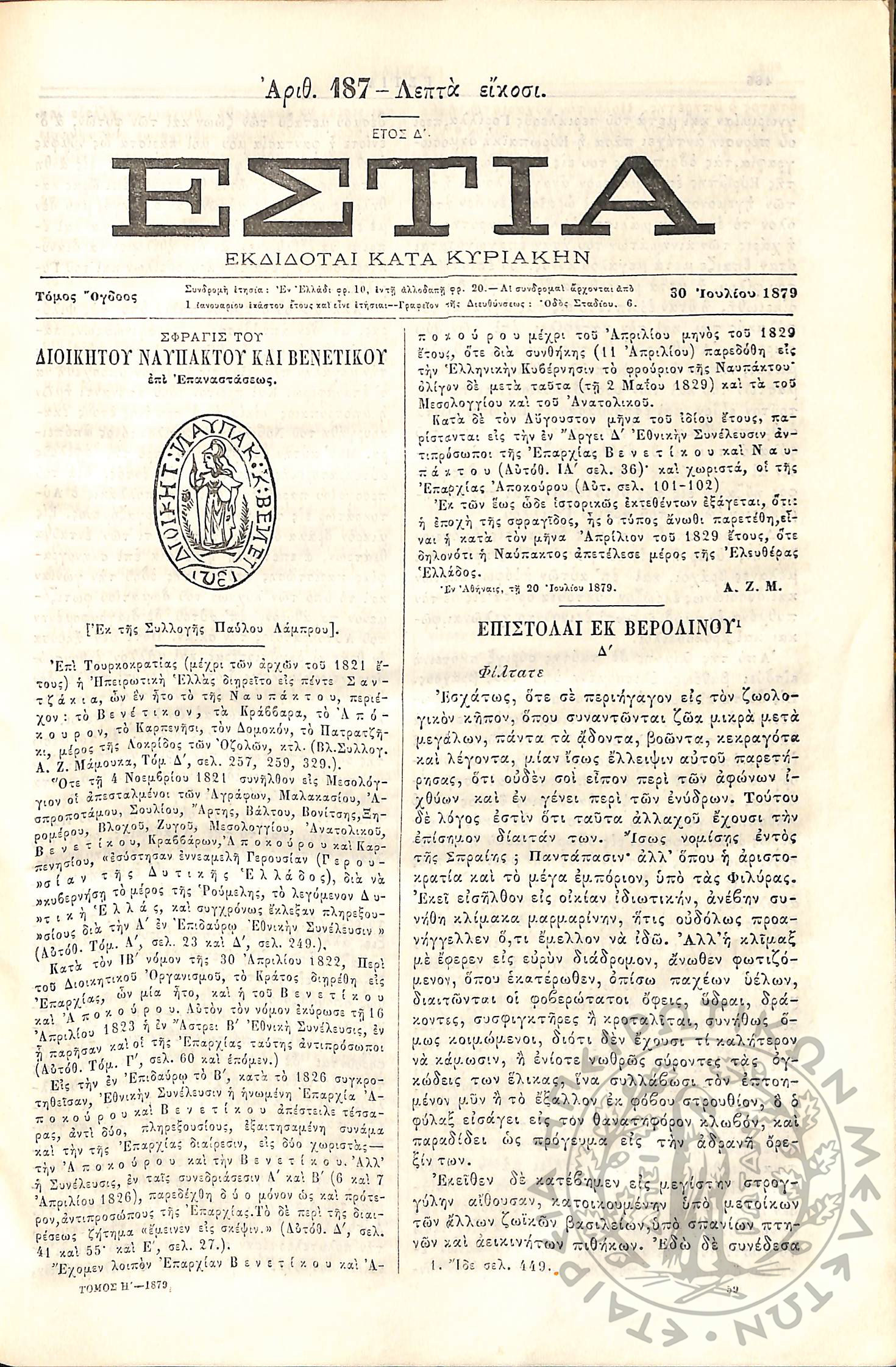 Εστία : Εκδίδοται κατά Κυριακήν - Τόμ. 8 / τχ. 187