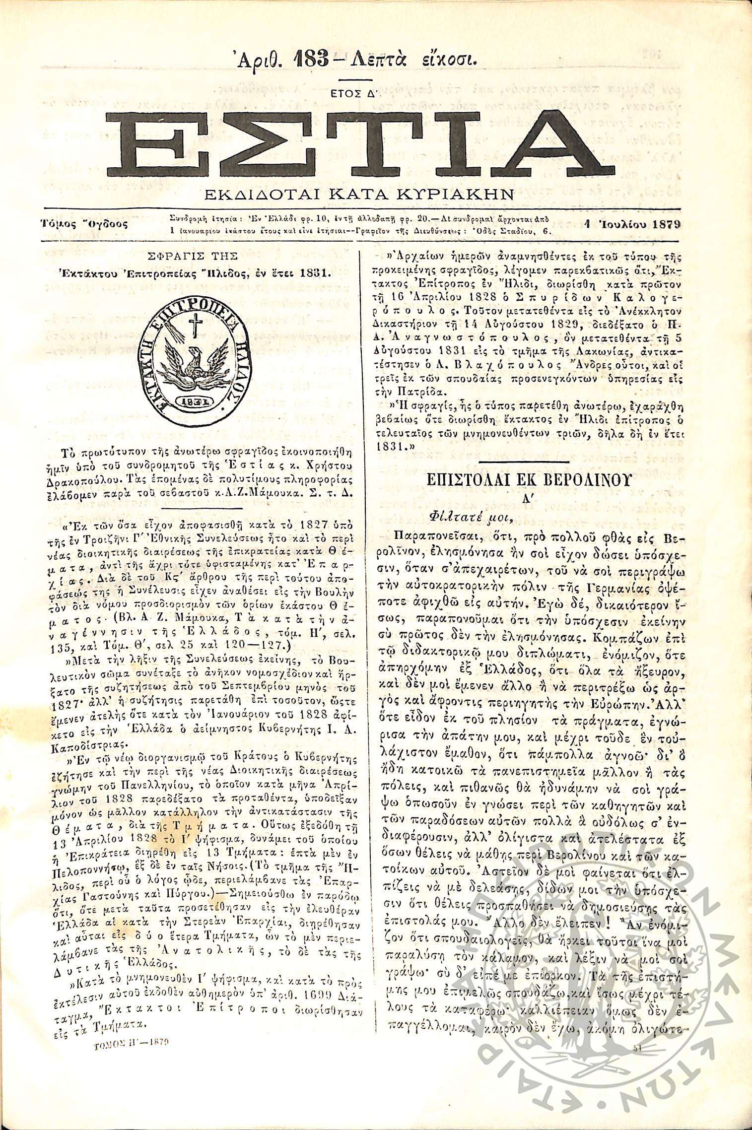 Εστία : Εκδίδοται κατά Κυριακήν - Τόμ. 8 / τχ. 183