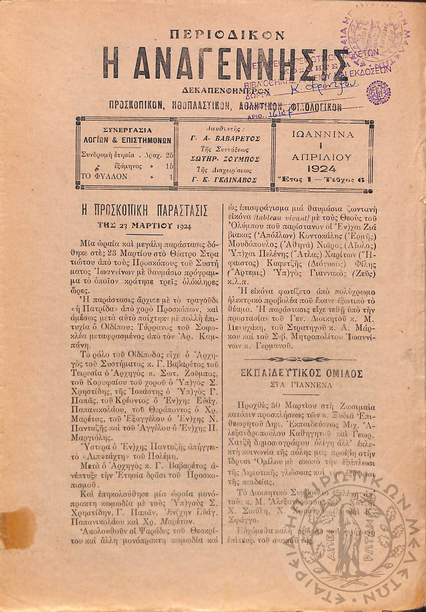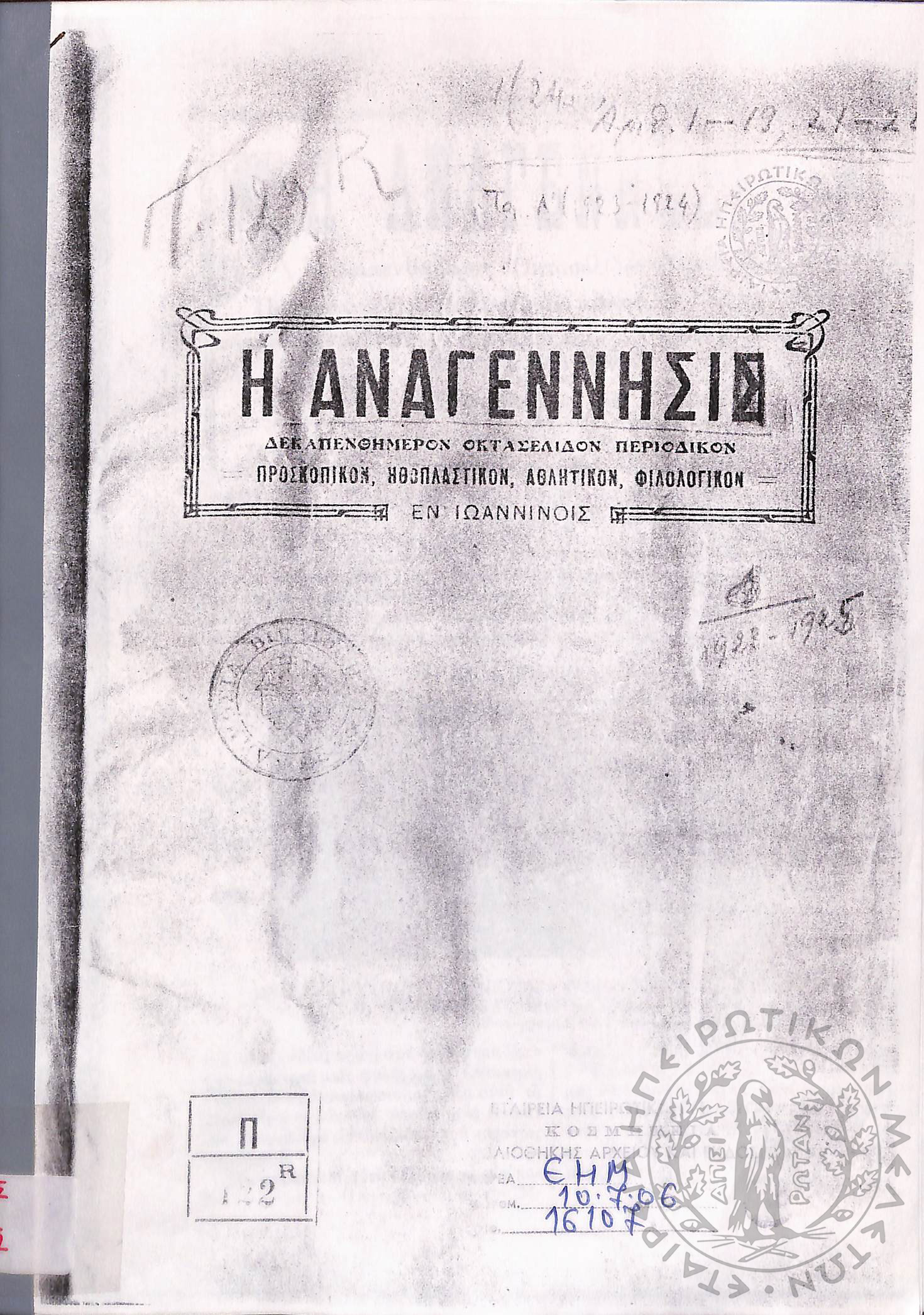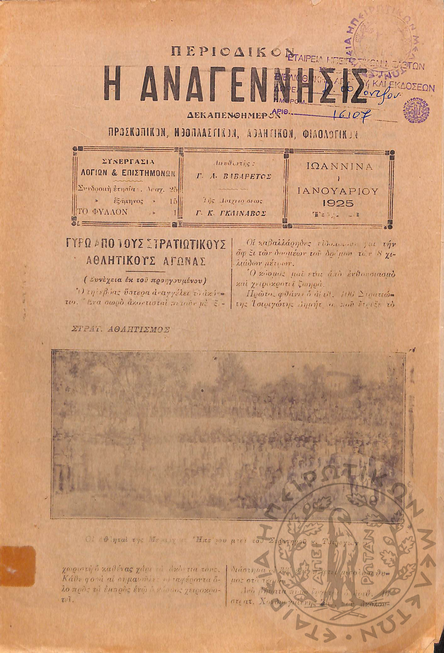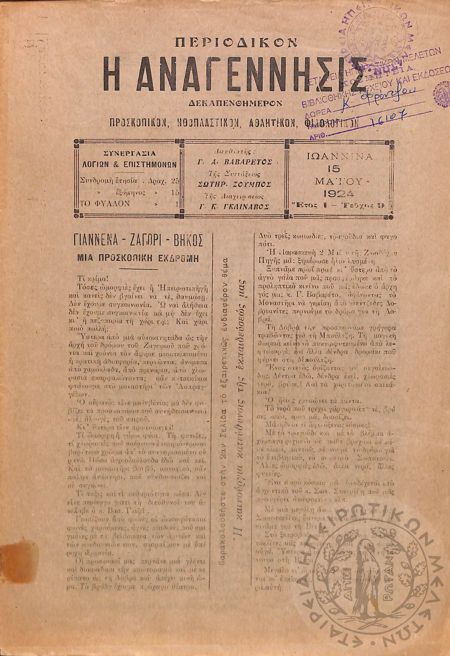 Η Αναγέννησις: δεκαπενθήμερον οκτασέλιδον περιοδικόν προσκοπικόν, ηθοπλαστικόν, αθλητικόν, φιλολογικόν (τεύχ. 1)Έτος 1, τεύχ. 1...