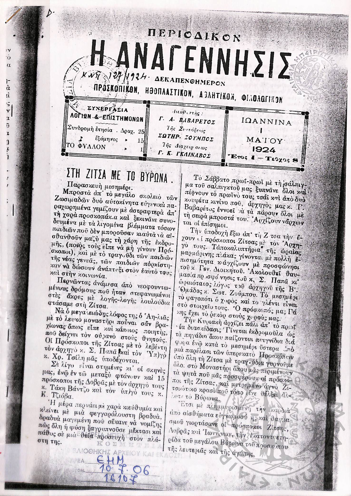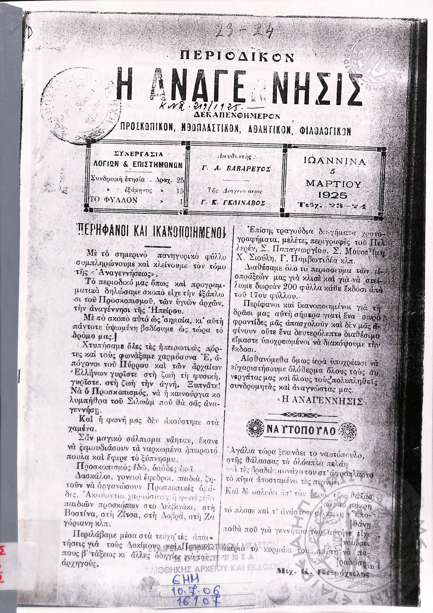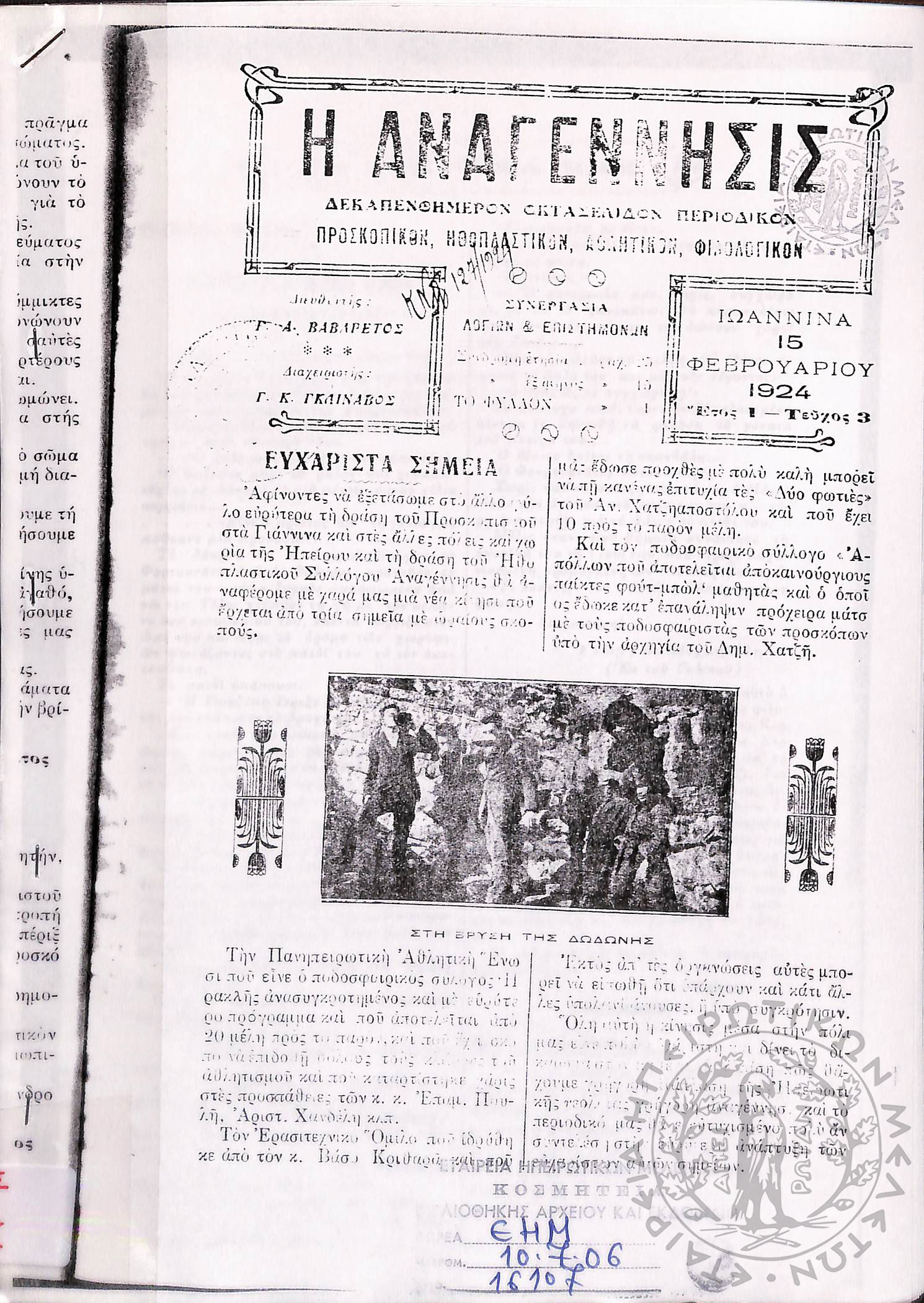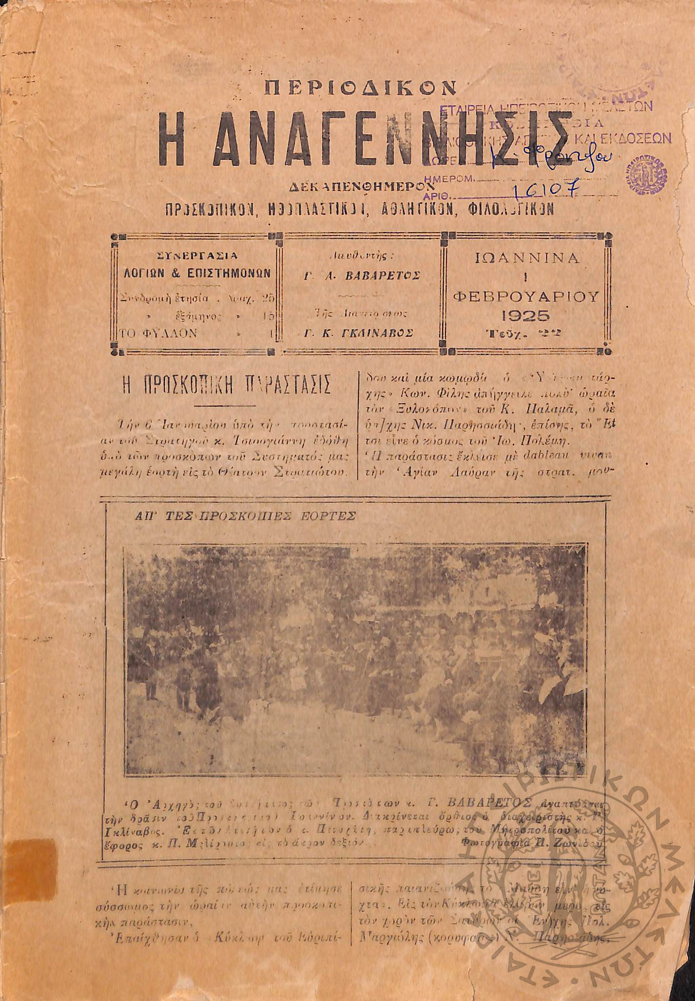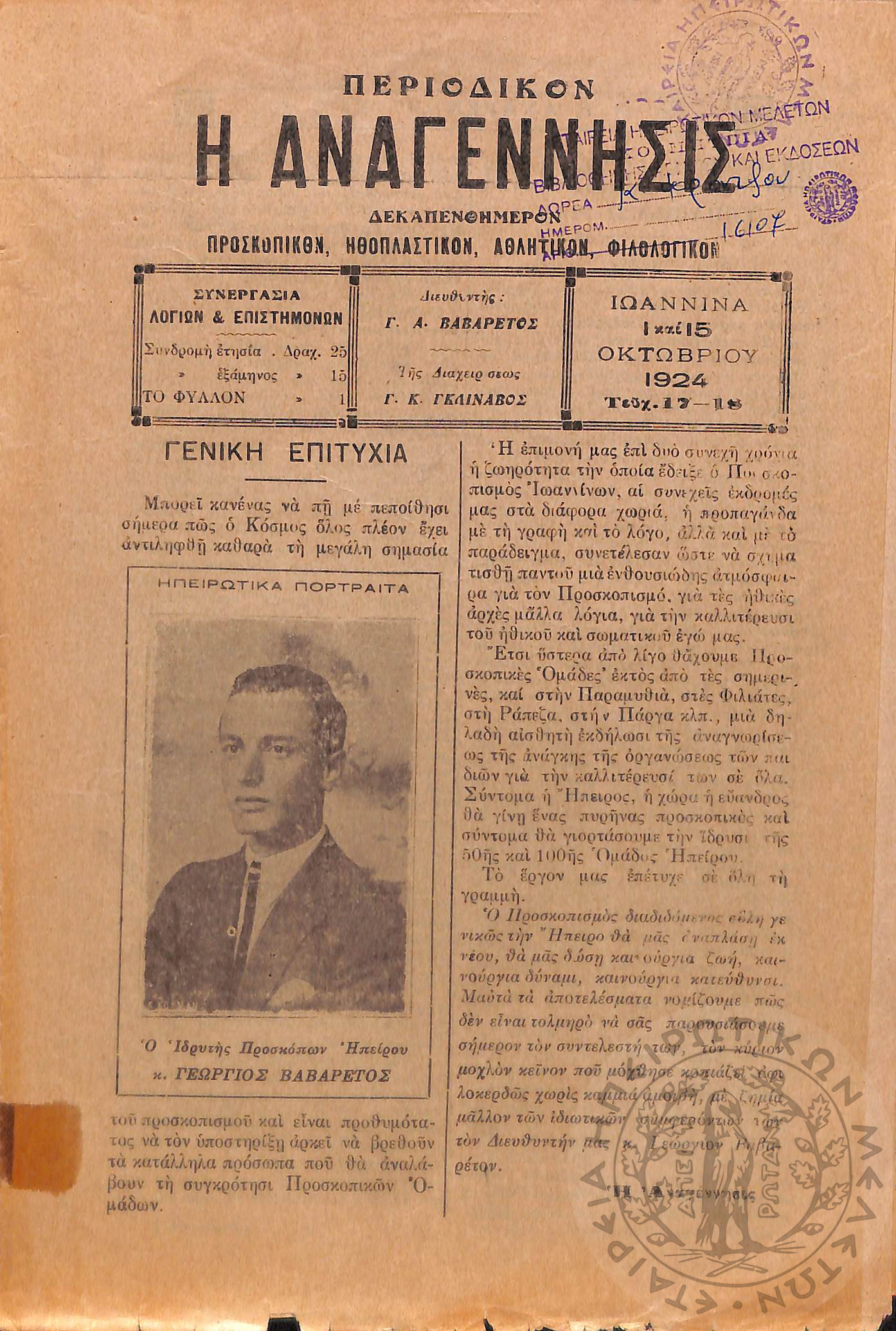 Η Αναγέννησις: δεκαπενθήμερον οκτασέλιδον περιοδικόν προσκοπικόν, ηθοπλαστικόν, αθλητικόν, φιλολογικόν (τεύχ. 1)Έτος 1, τεύχ. 1...