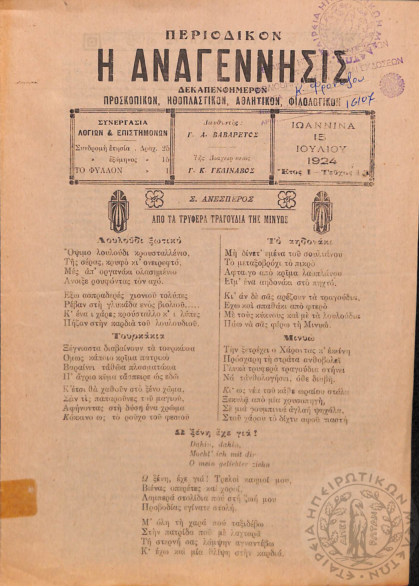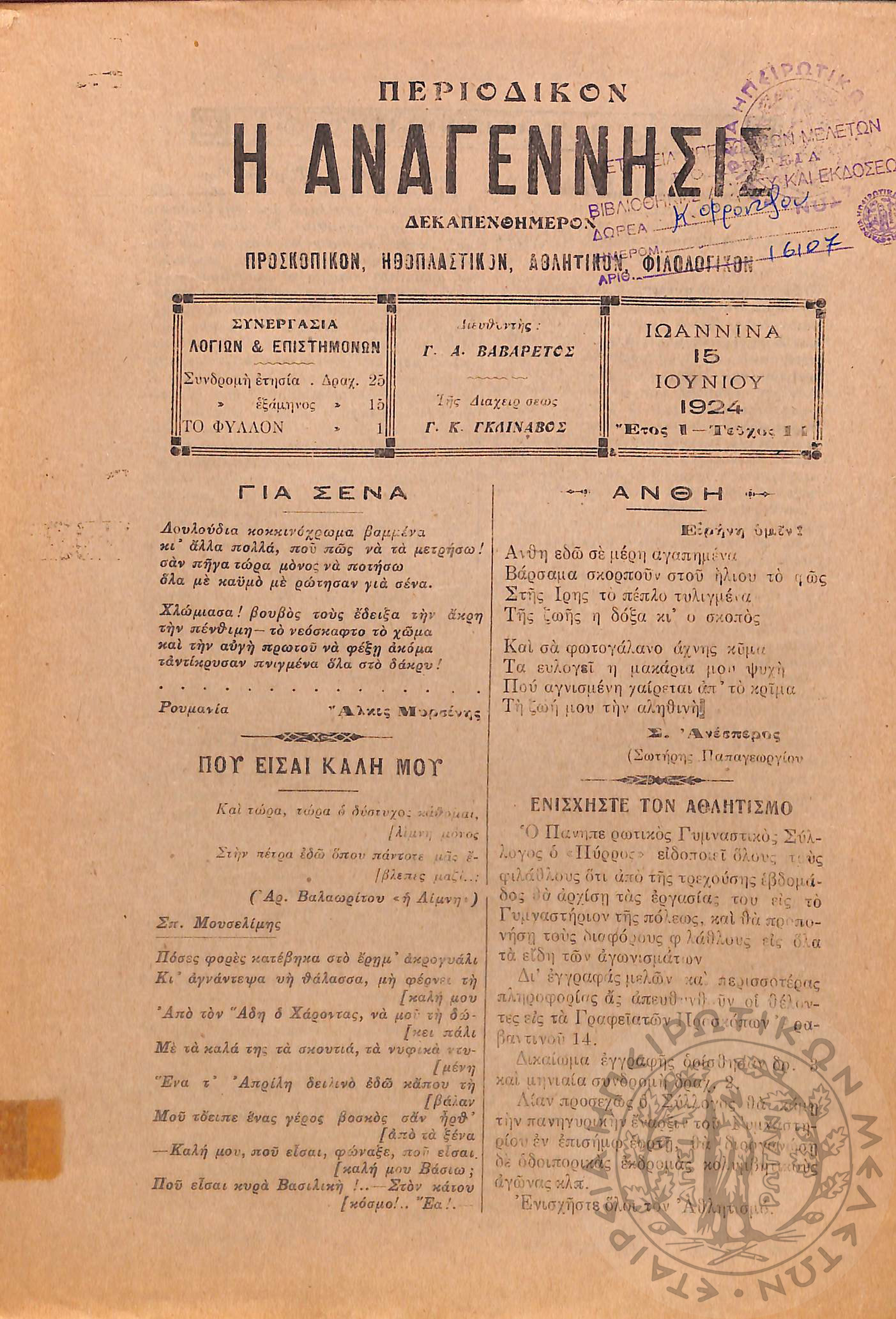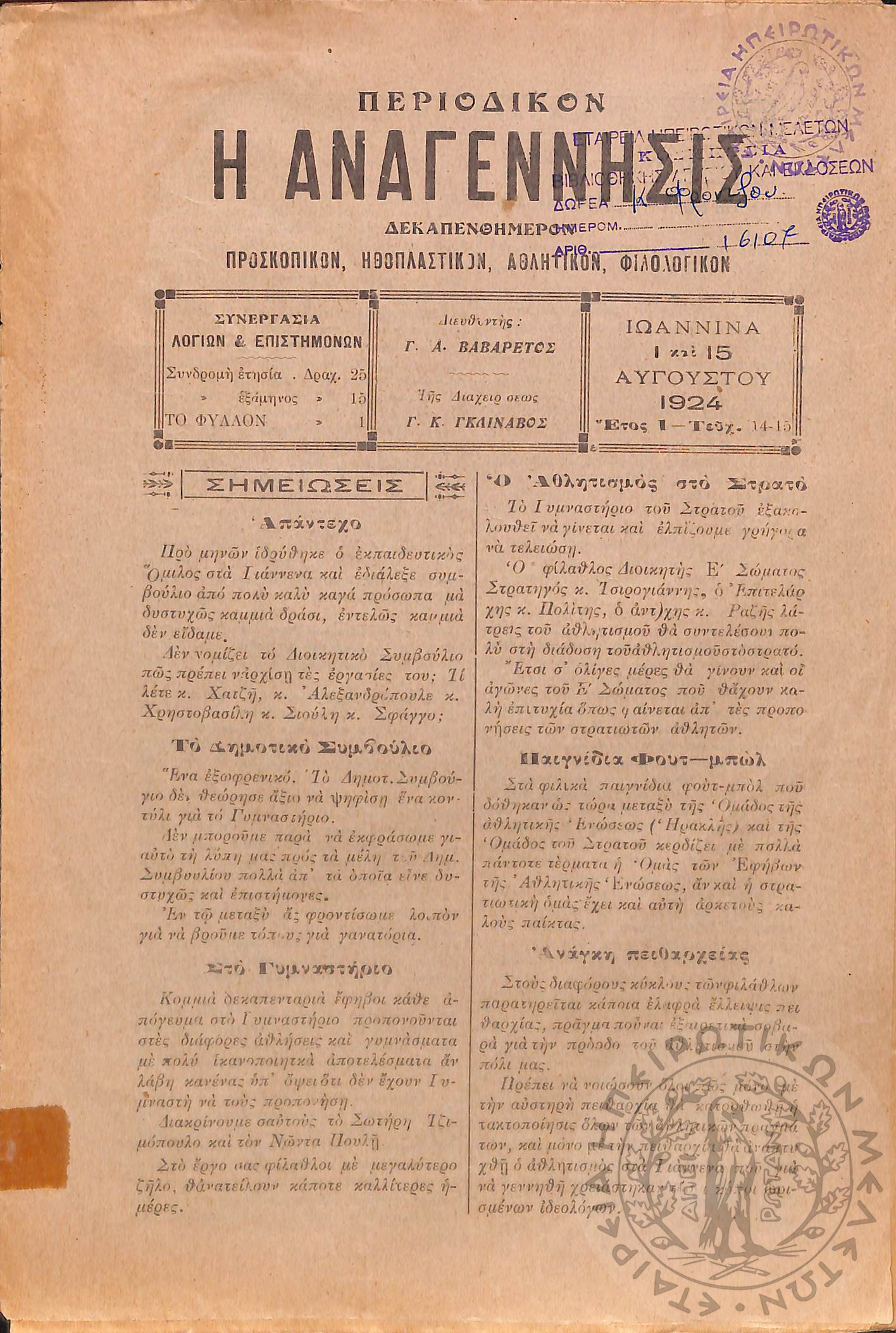 Η Αναγέννησις: δεκαπενθήμερον, προσκοπικόν, ηθοπλαστικόν, αθλητικόν, φιλολογικόν (τεύχ. 14-15)Έτος 1, τεύχ. 14-15...