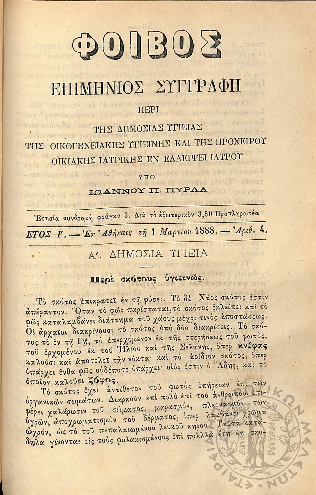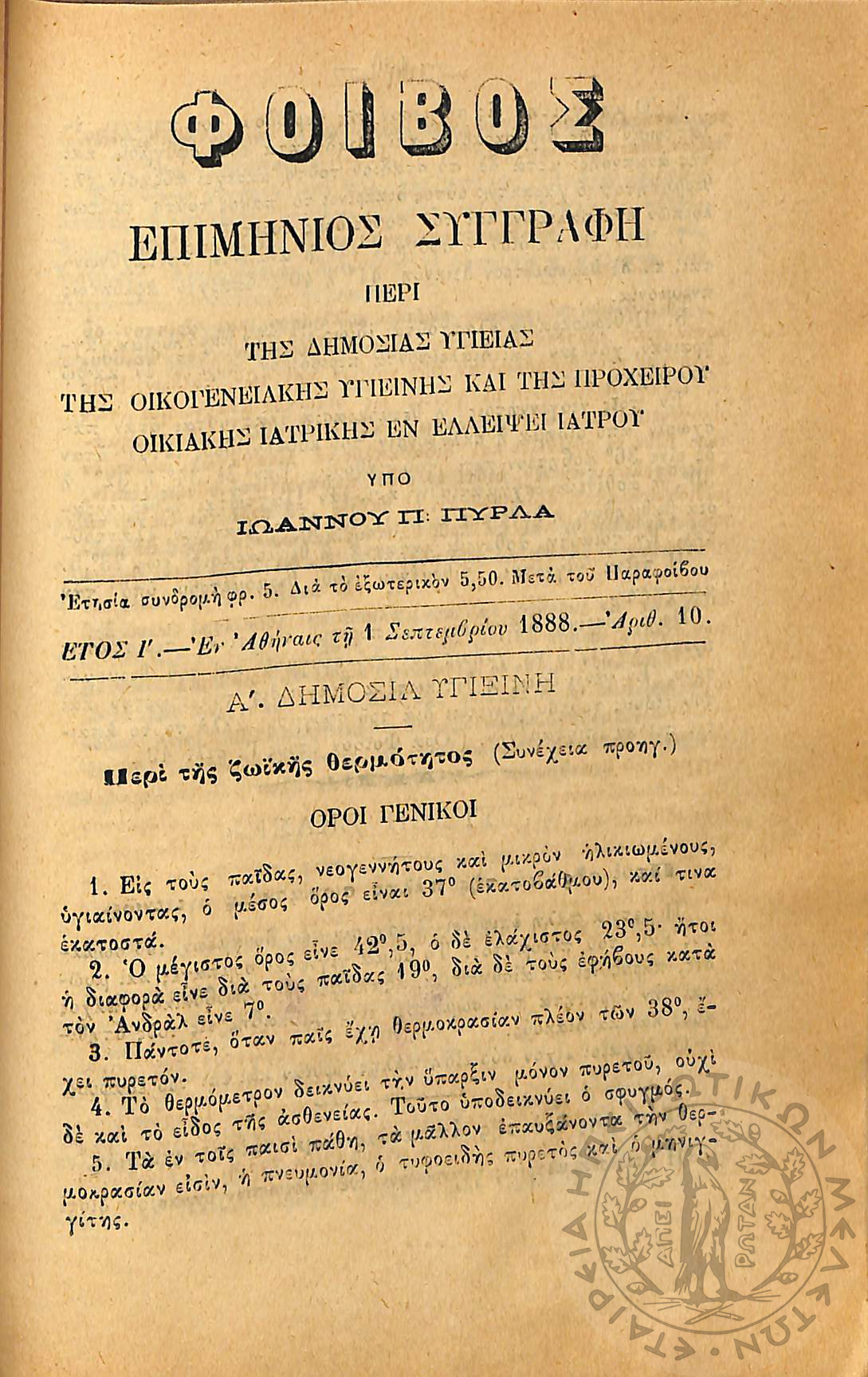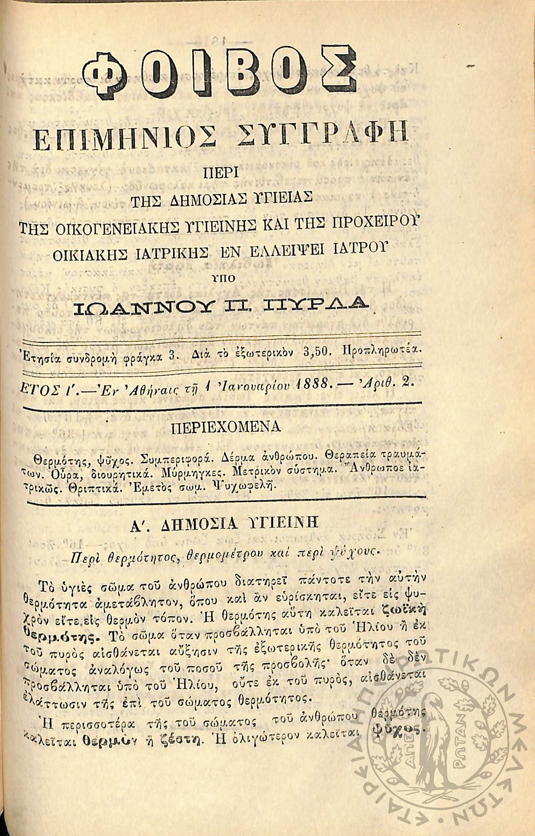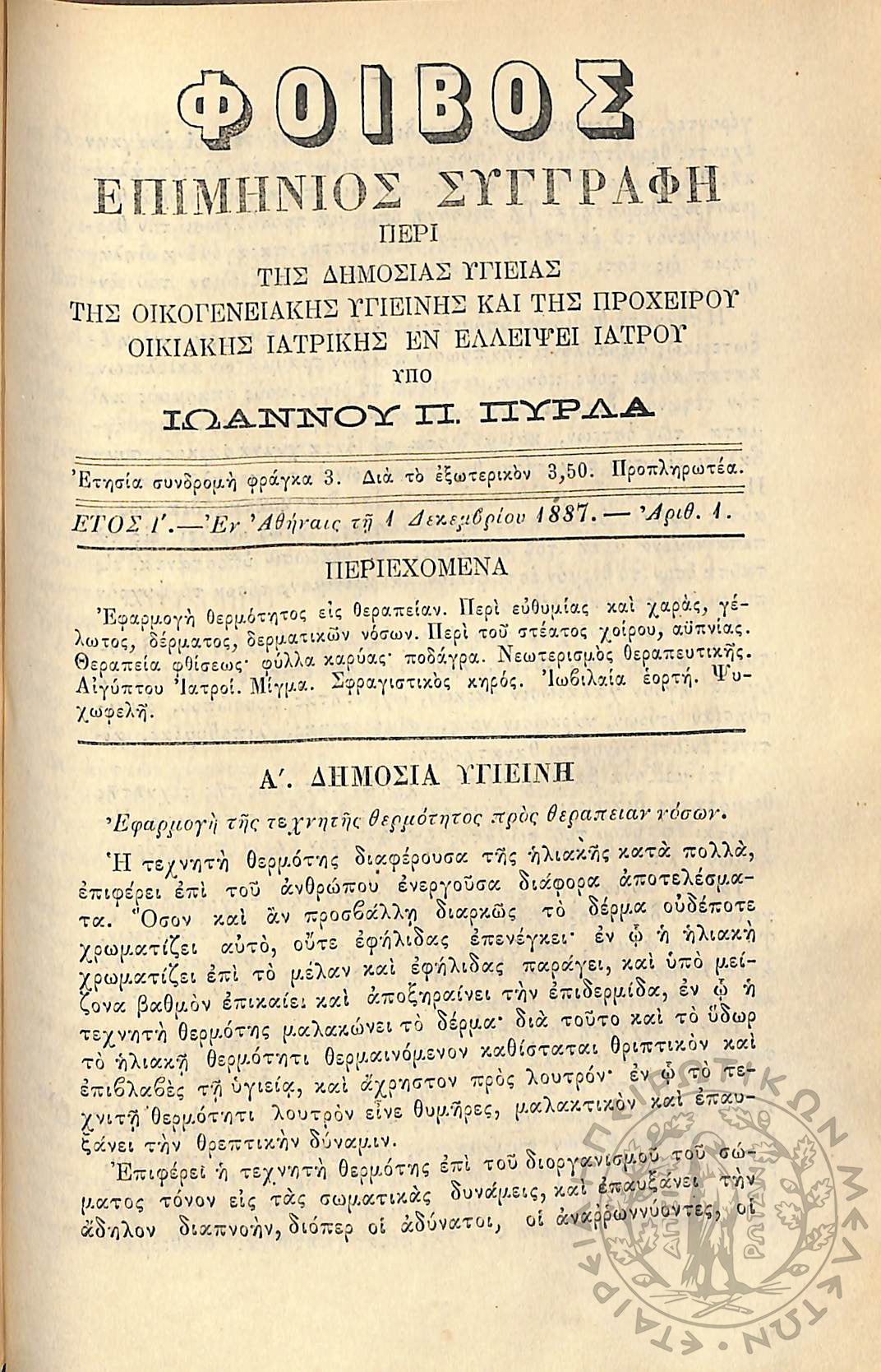 Φοίβος: επιμήνιος συγγραφή περί της δημοσίας υγείας, της οικογενειακής υγιεινής και της προχείρου οικιακής ιατρικής εν ελλείψει ιατρού (έτος I΄, αρ. 1)Έτος I΄, αρ. 1...