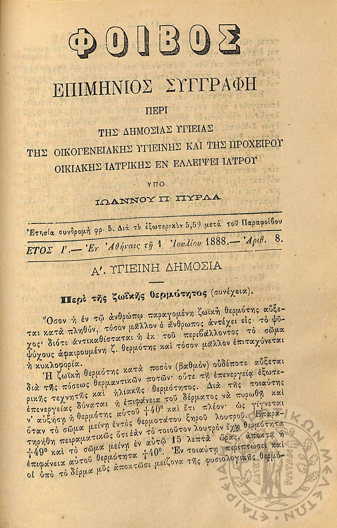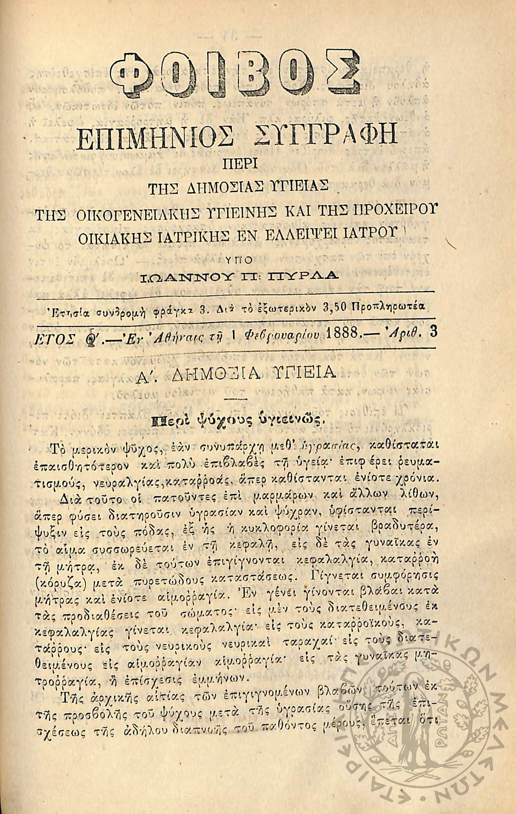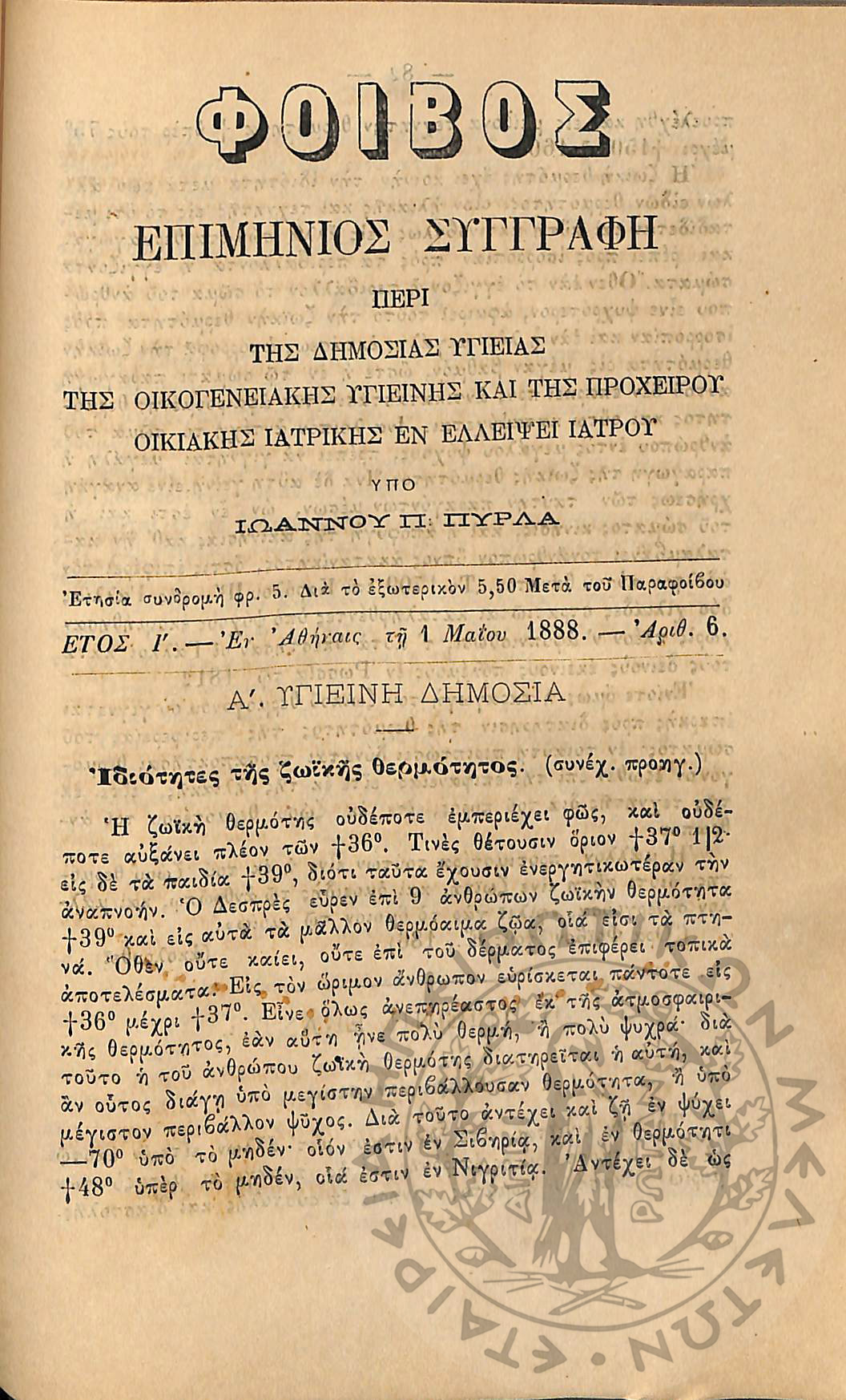 Φοίβος: επιμήνιος συγγραφή περί της δημοσίας υγείας, της οικογενειακής υγιεινής και της προχείρου οικιακής ιατρικής εν ελλείψει ιατρού (έτος I΄, αρ. 1)Έτος I΄, αρ. 1...
