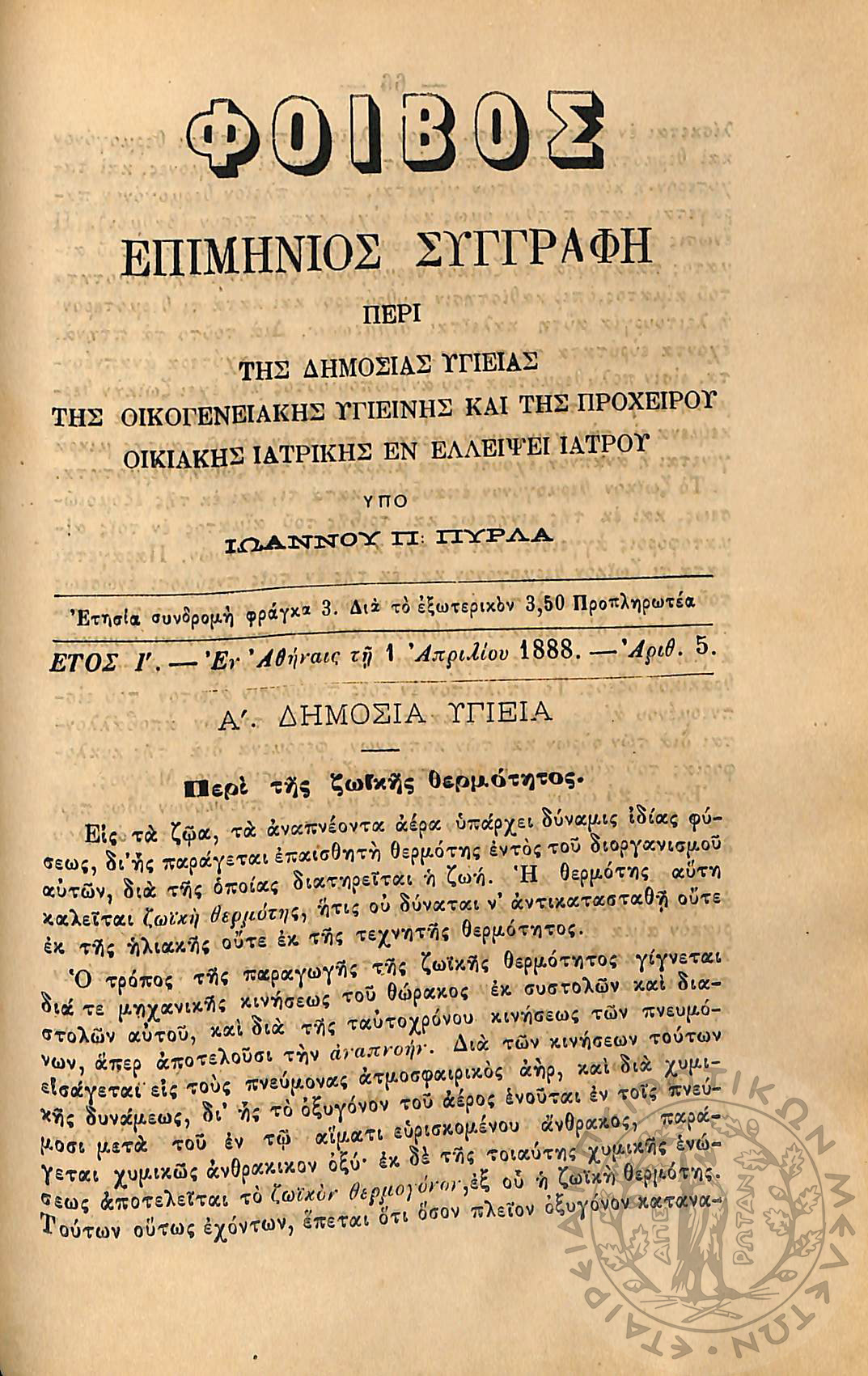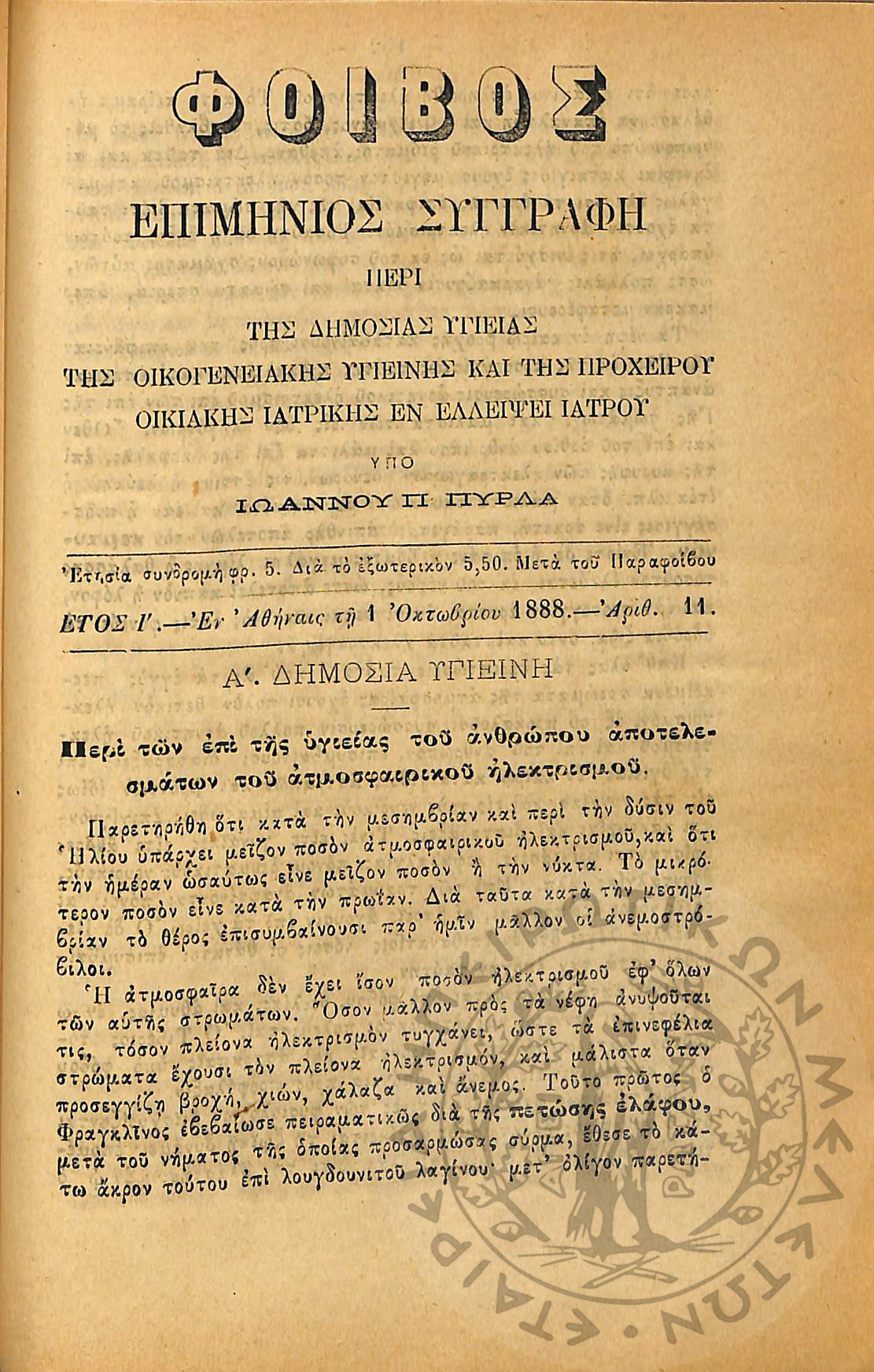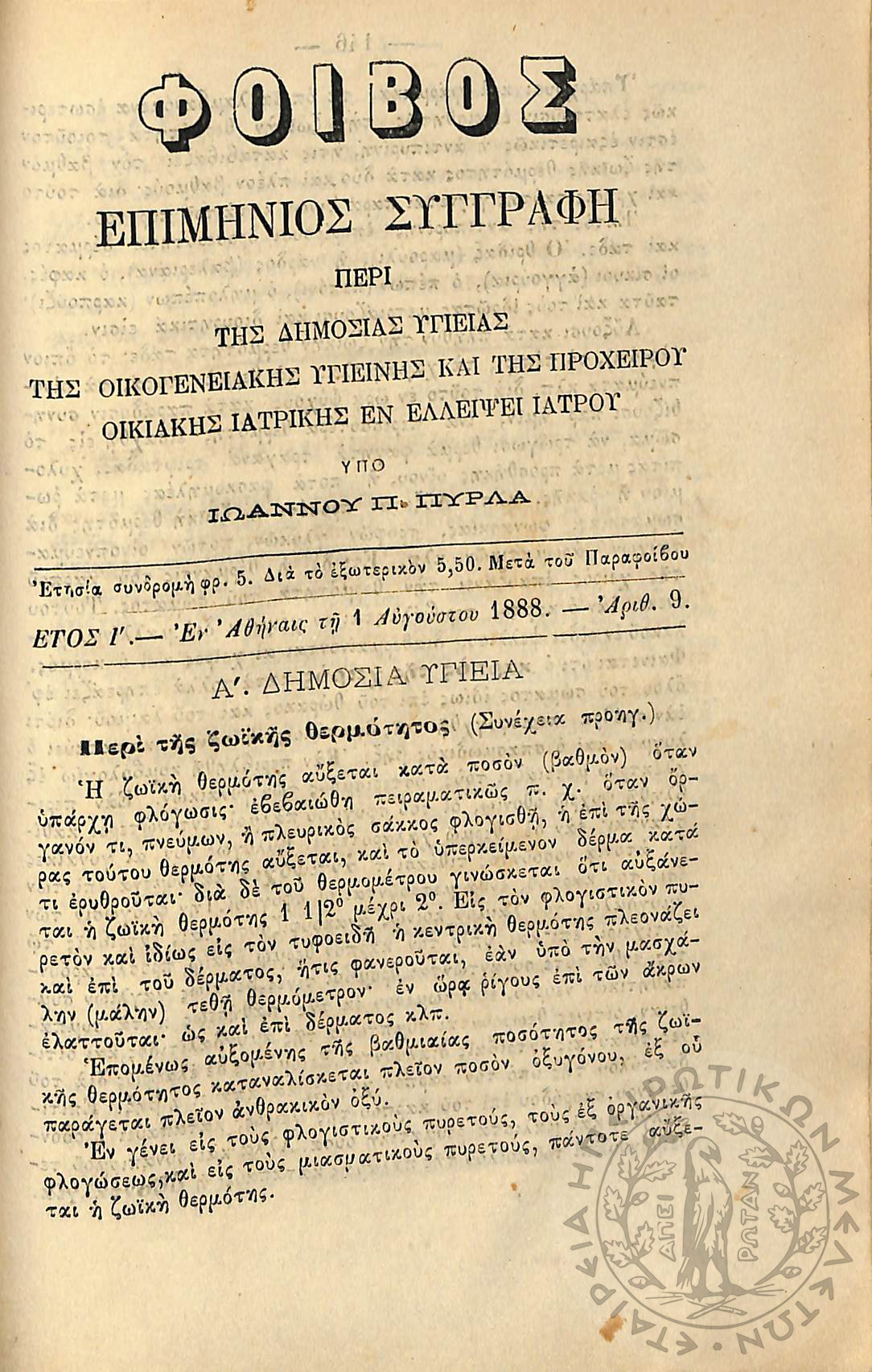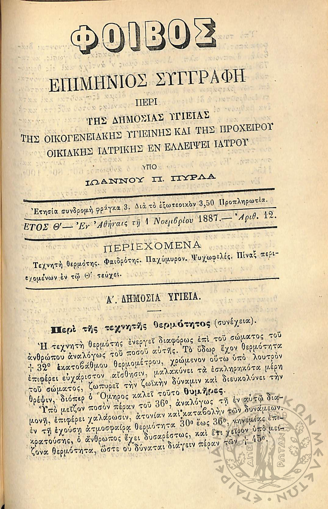 Φοίβος: επιμήνιος συγγραφή περί της δημοσίας υγείας, της οικογενειακής υγιεινής και της προχείρου οικιακής ιατρικής εν ελλείψει ιατρού (έτος I΄, αρ. 1)Έτος I΄, αρ. 1...