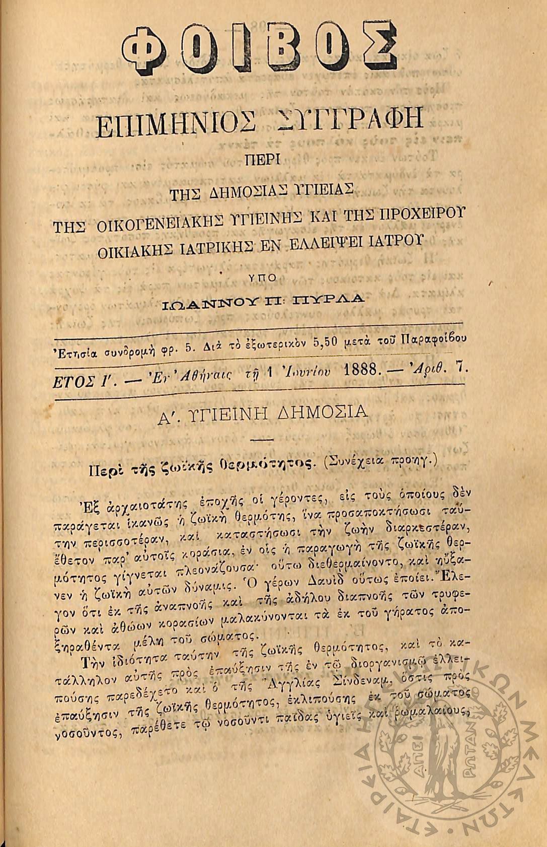 Φοίβος: επιμήνιος συγγραφή περί της δημοσίας υγείας, της οικογενειακής υγιεινής και της προχείρου οικιακής ιατρικής εν ελλείψει ιατρού (έτος I΄, αρ. 7)Έτος I΄, αρ. 7...