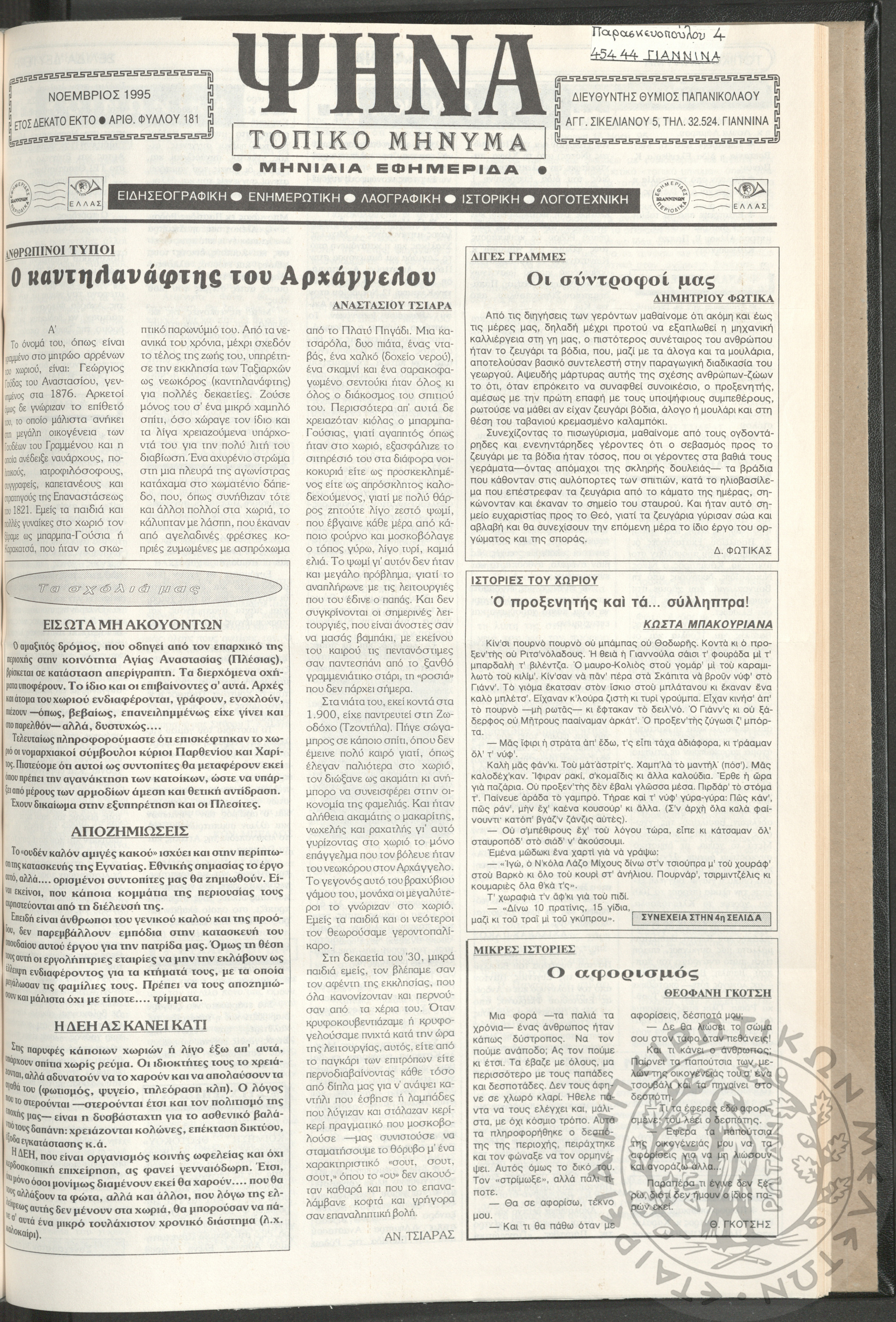 Ψήνα, τοπικό μήνυμα: μηνιαία εφημερίδα, 1995, φ. 181