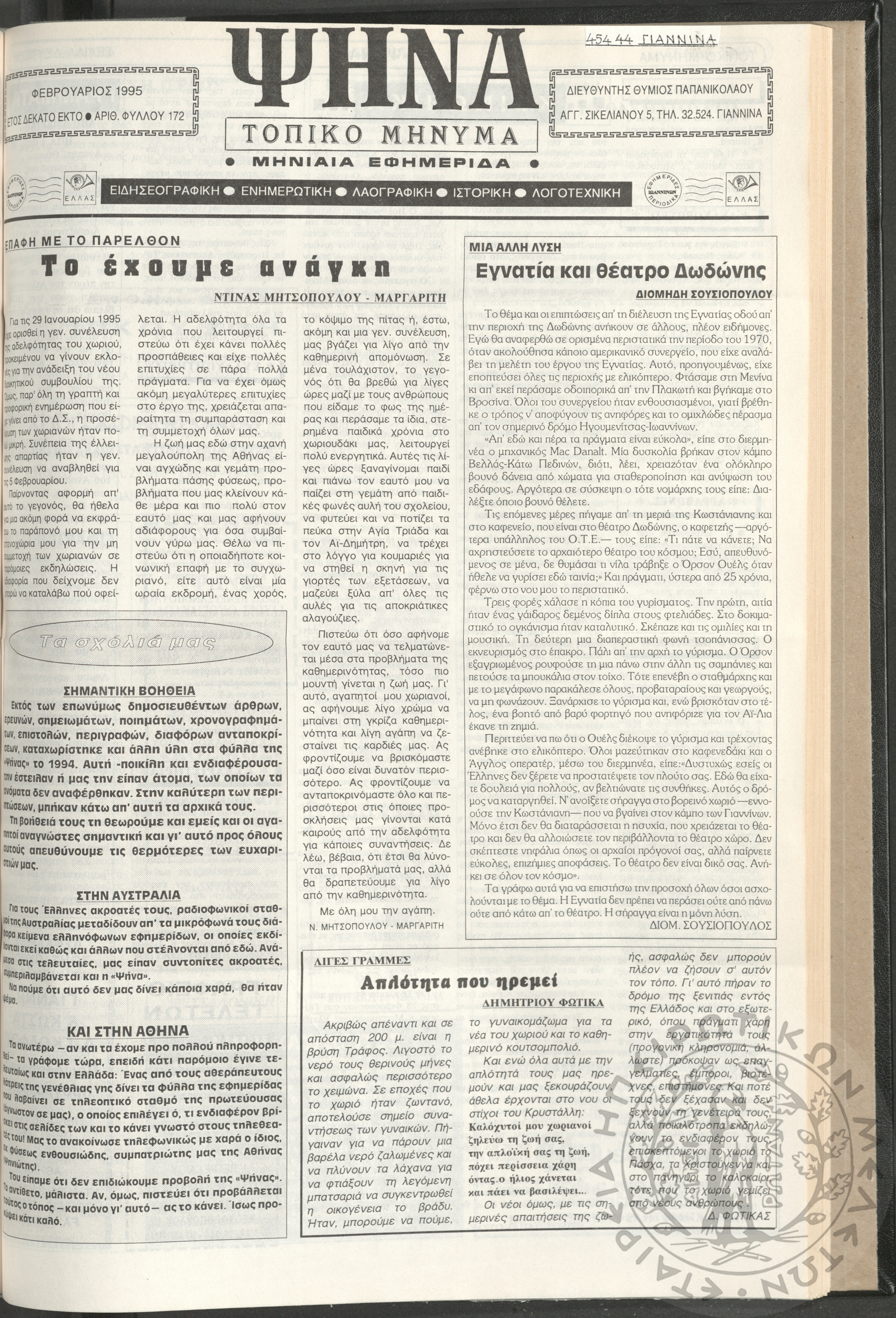 Ψήνα, τοπικό μήνυμα: μηνιαία εφημερίδα, 1995, φ. 172