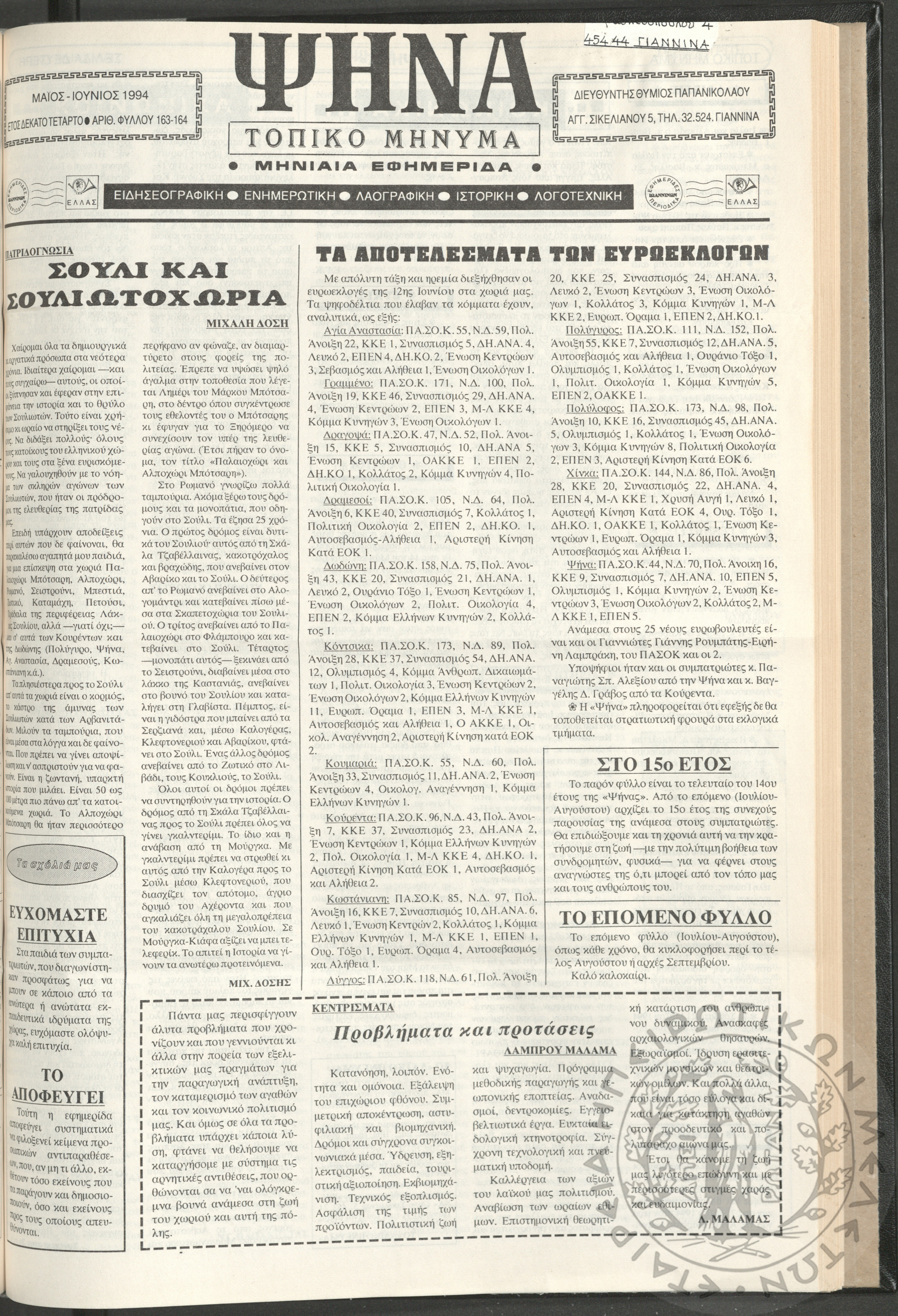 Ψήνα, τοπικό μήνυμα: μηνιαία εφημερίδα, 1994, φ. 163-164