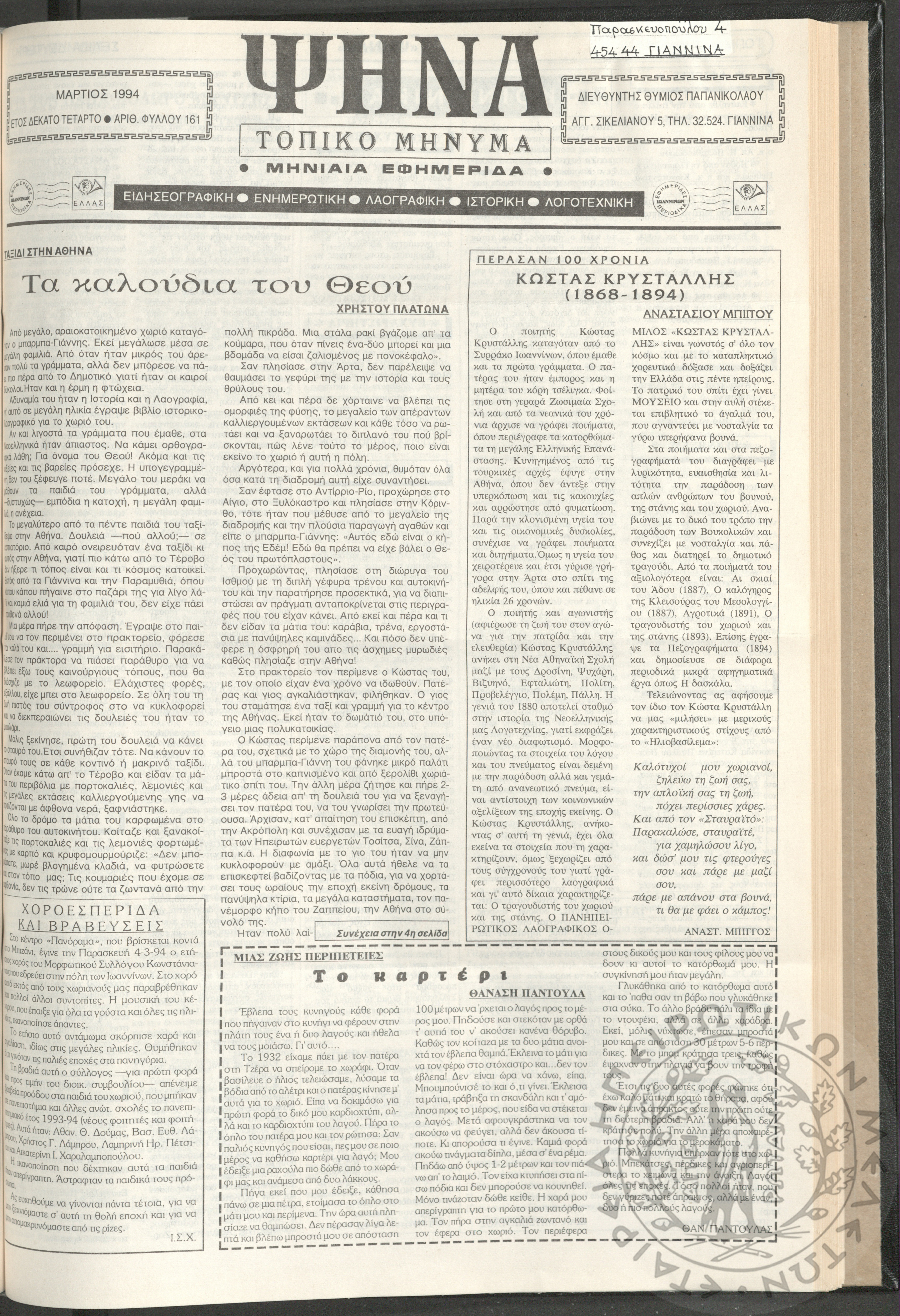 Ψήνα, τοπικό μήνυμα: μηνιαία εφημερίδα, 1994, φ. 161