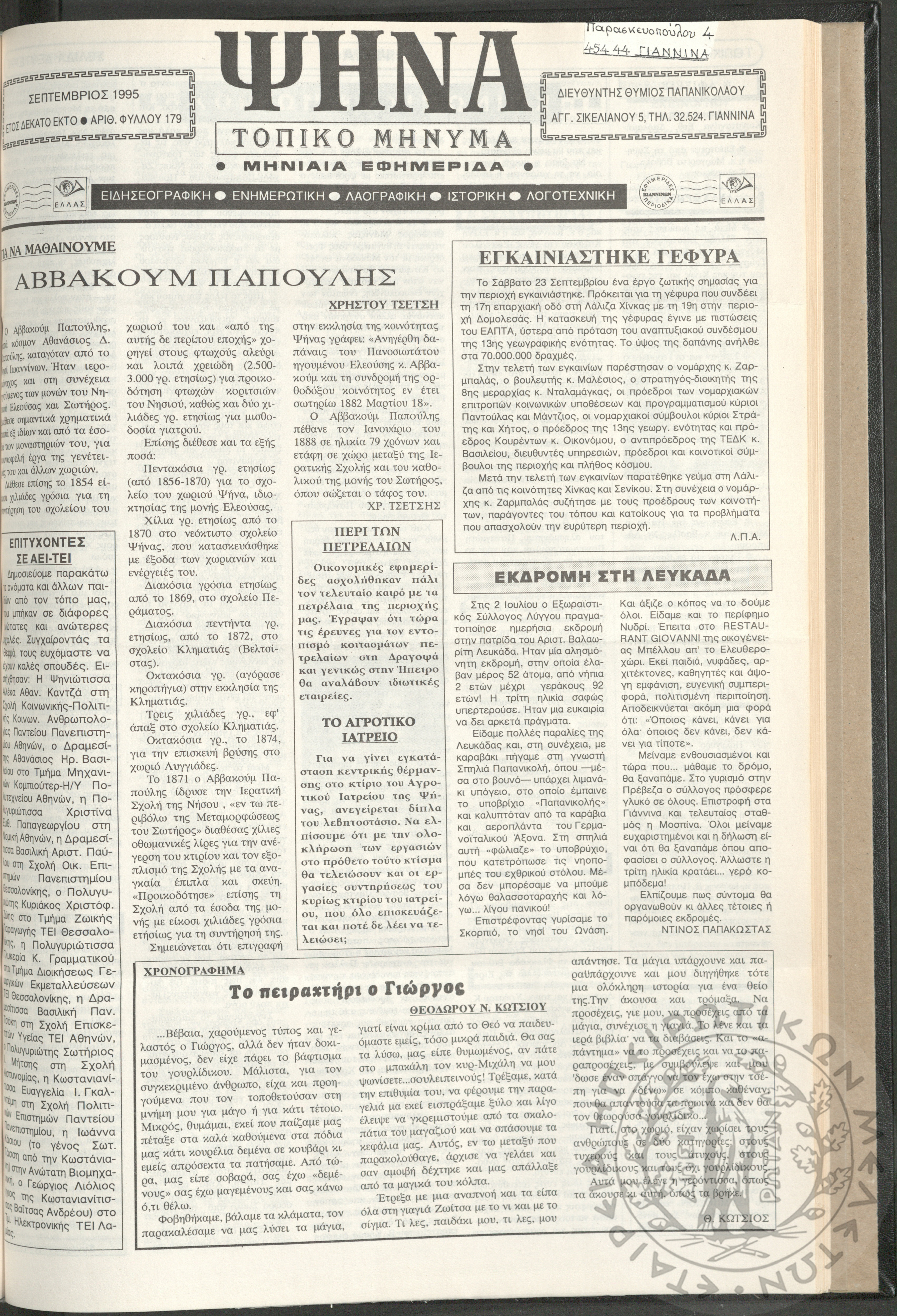 Ψήνα, τοπικό μήνυμα: μηνιαία εφημερίδα, 1995, φ. 179