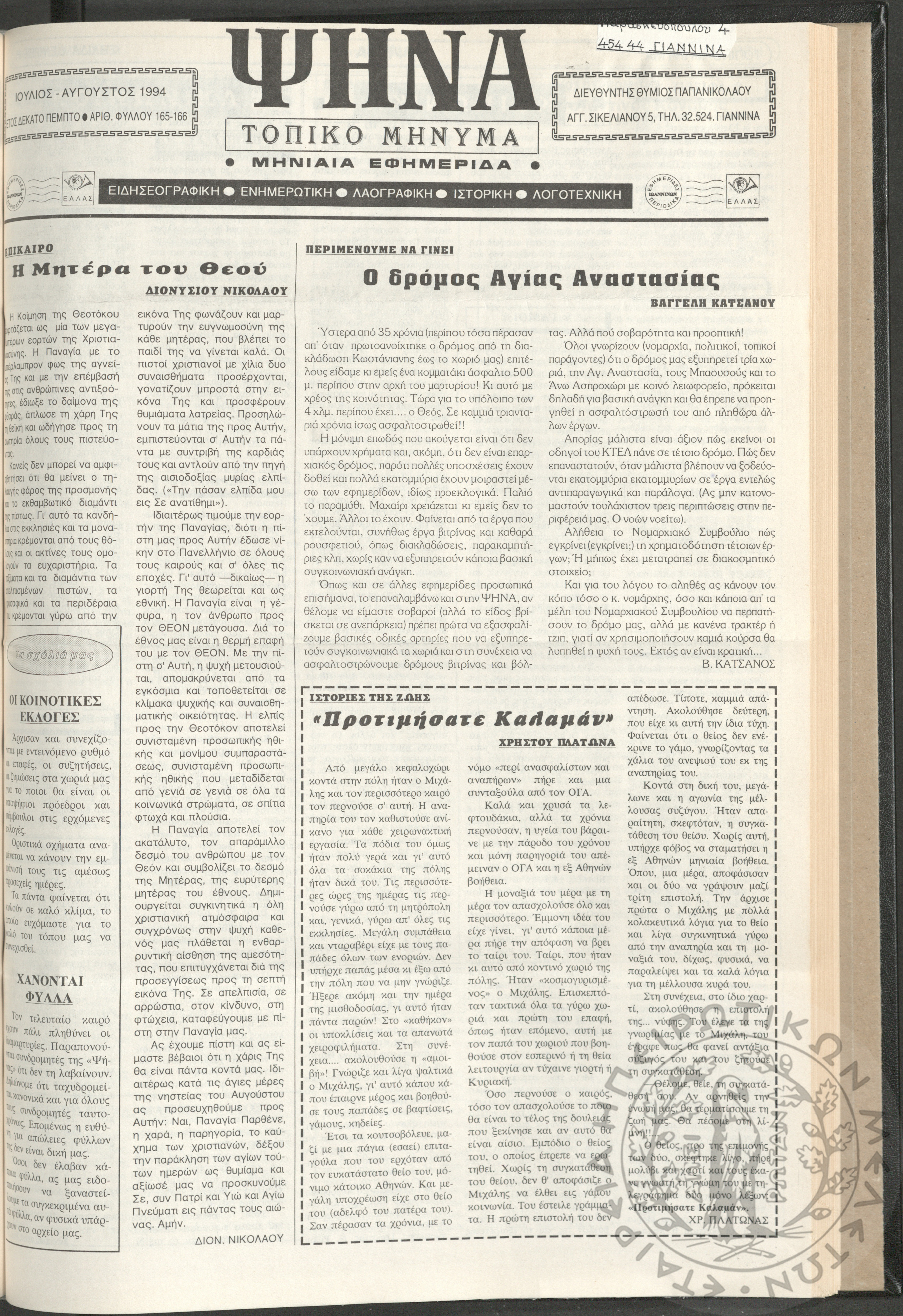 Ψήνα, τοπικό μήνυμα: μηνιαία εφημερίδα, 1994, φ. 165-166