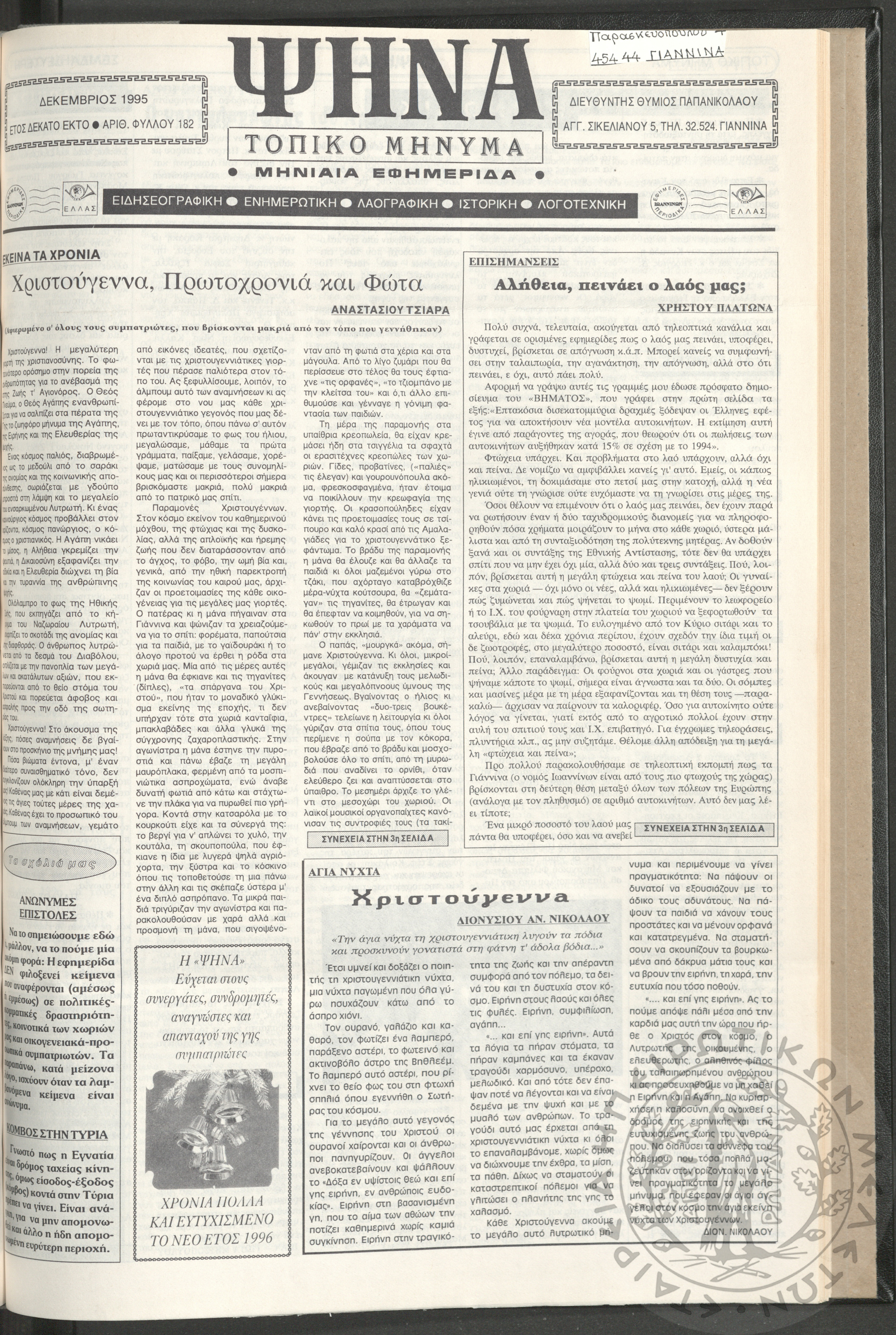 Ψήνα, τοπικό μήνυμα: μηνιαία εφημερίδα, 1995, φ. 182