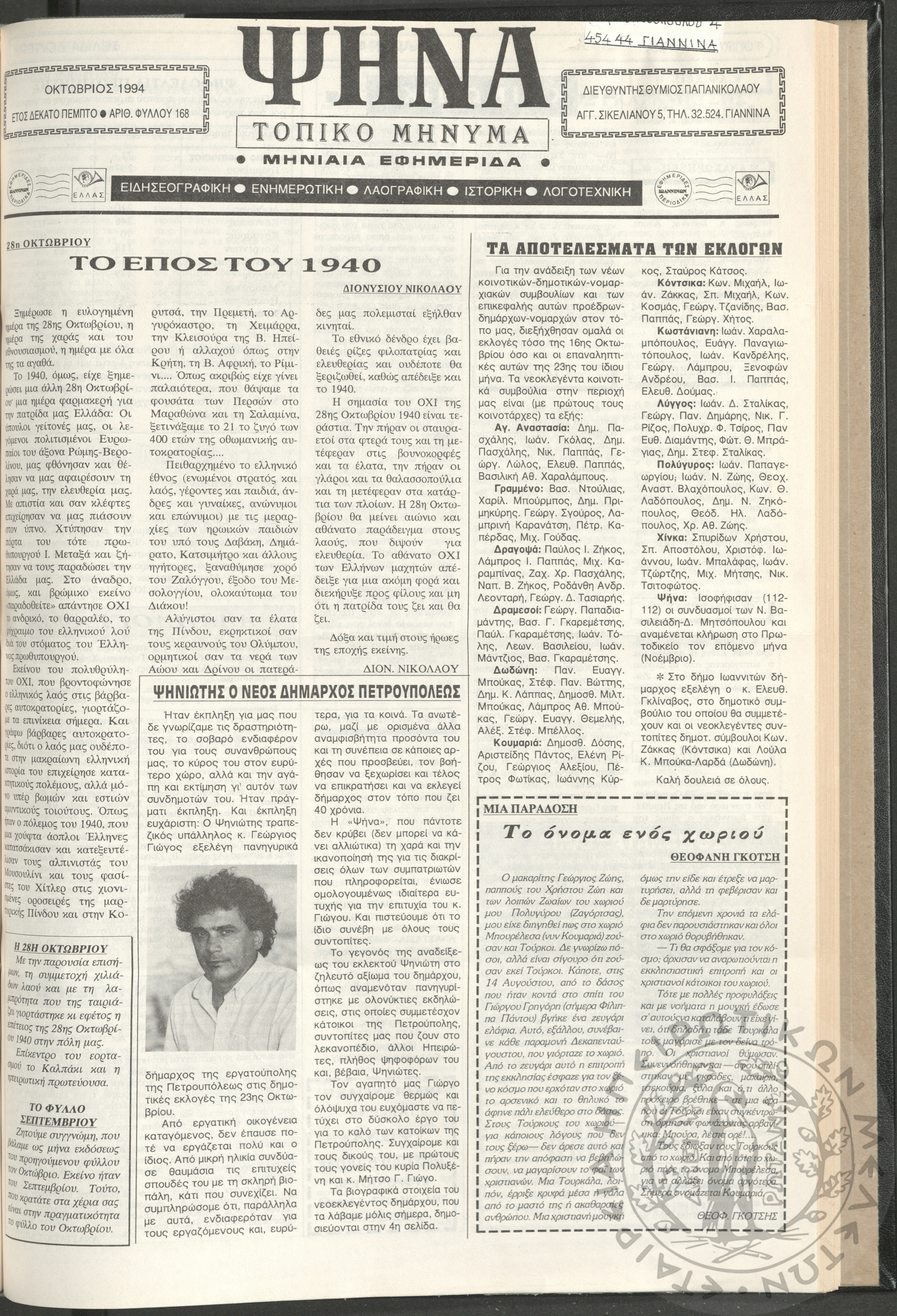 Ψήνα, τοπικό μήνυμα: μηνιαία εφημερίδα, 1994, φ. 168