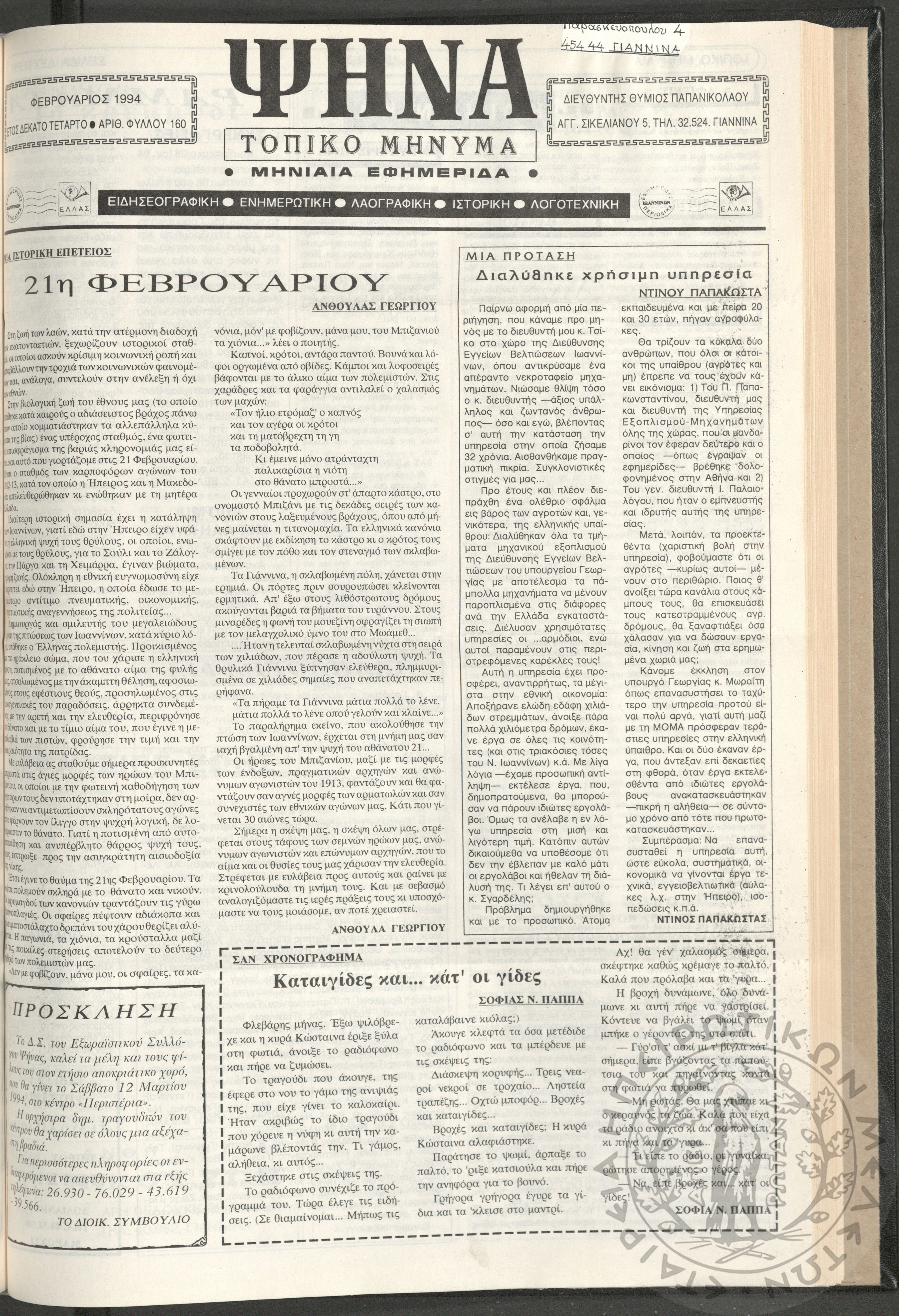 Ψήνα, τοπικό μήνυμα: μηνιαία εφημερίδα, 1994, φ. 160