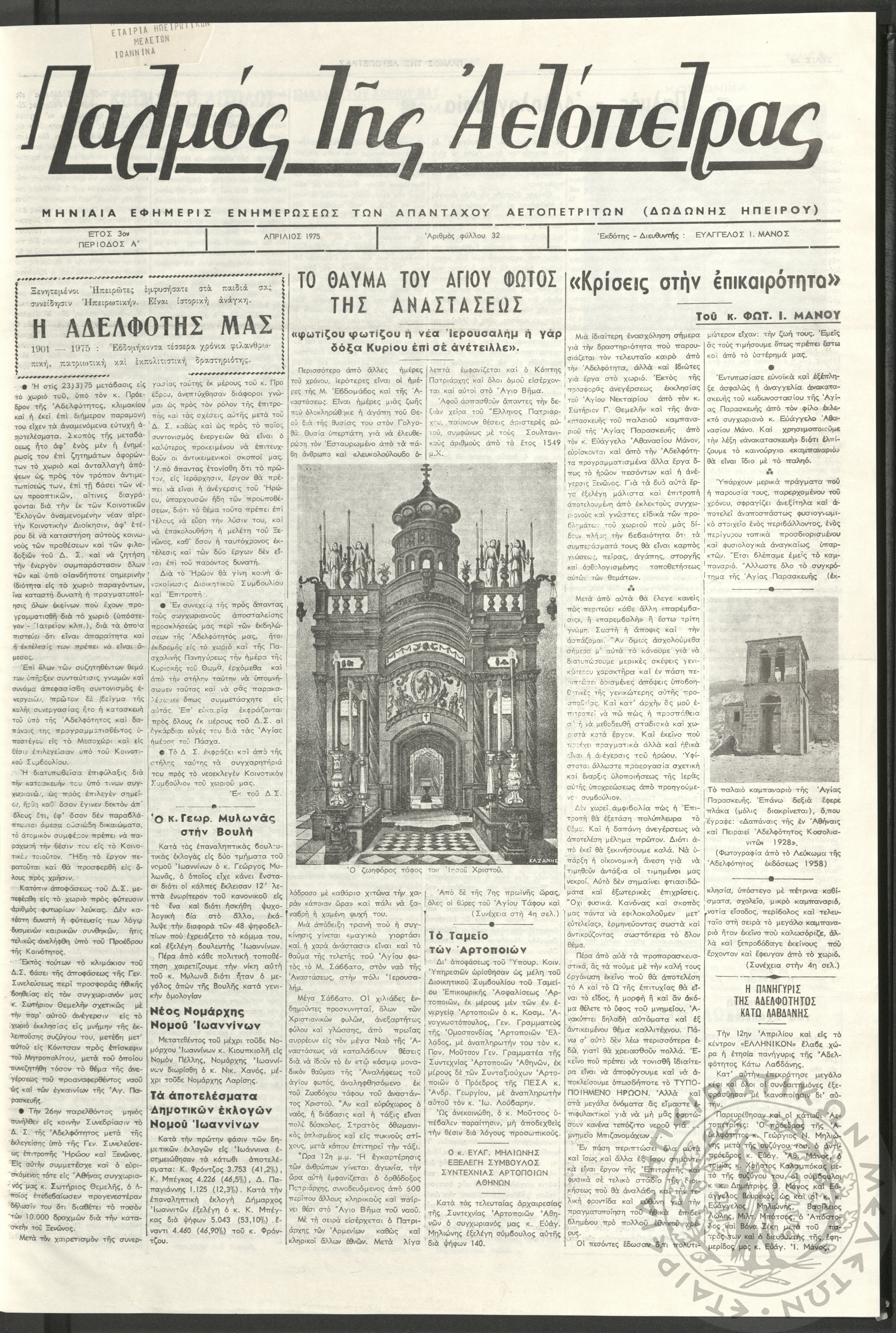 Παλμός της Αετόπετρας: Μηνιαία εφημερίς ενημερώσεως των απανταχού Αετοπετριτών (Δωδώνης Ηπείρου), 1975, φ. 32Έτος 3, φ. 32...