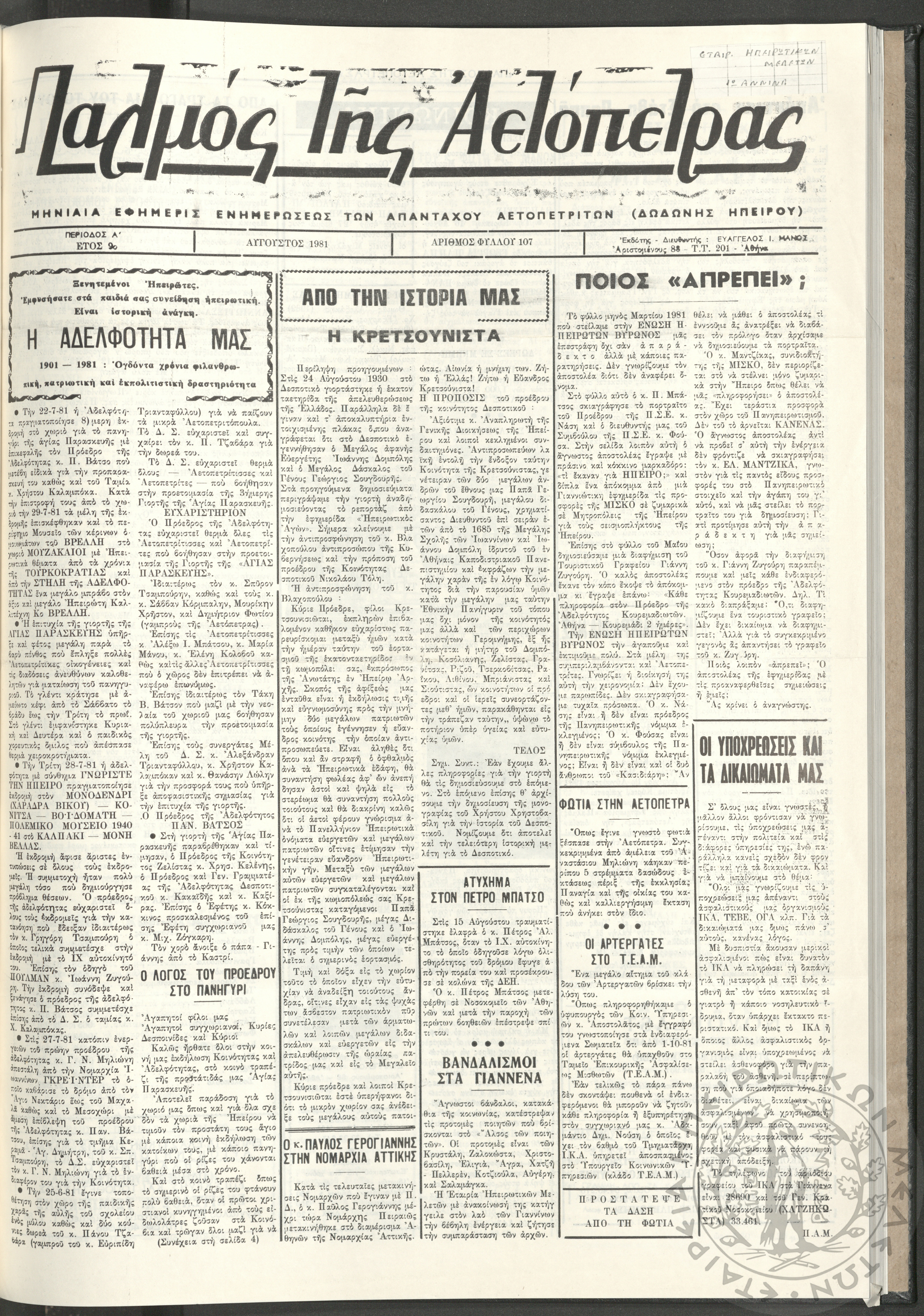 Παλμός της Αετόπετρας: Μηνιαία εφημερίς ενημερώσεως των απανταχού Αετοπετριτών (Δωδώνης Ηπείρου), 1981, φ. 107Έτος 9, φ. 107...