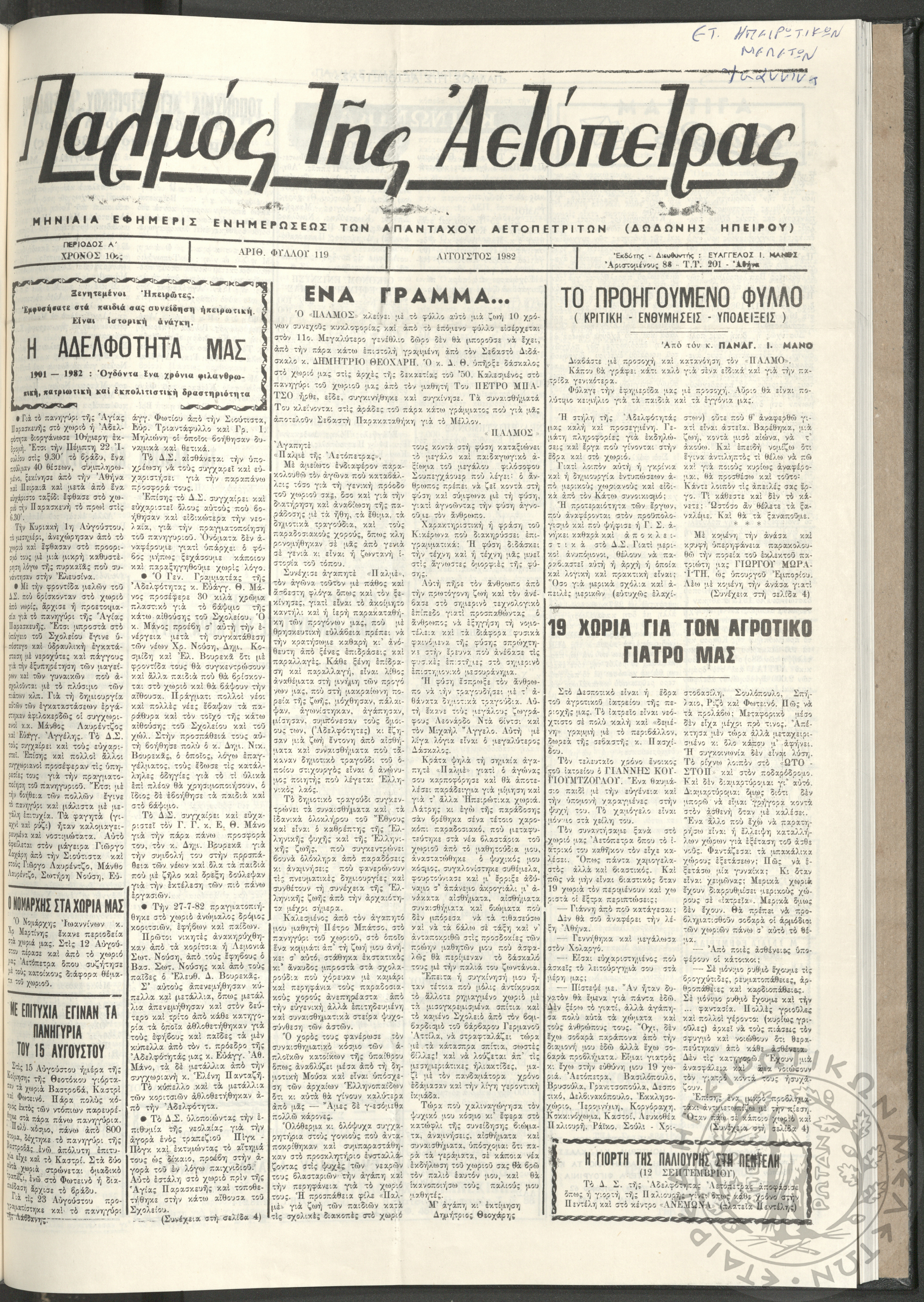 Παλμός της Αετόπετρας: Μηνιαία εφημερίς ενημερώσεως των απανταχού Αετοπετριτών (Δωδώνης Ηπείρου), 1982, φ. 119Έτος 10, φ. 119...