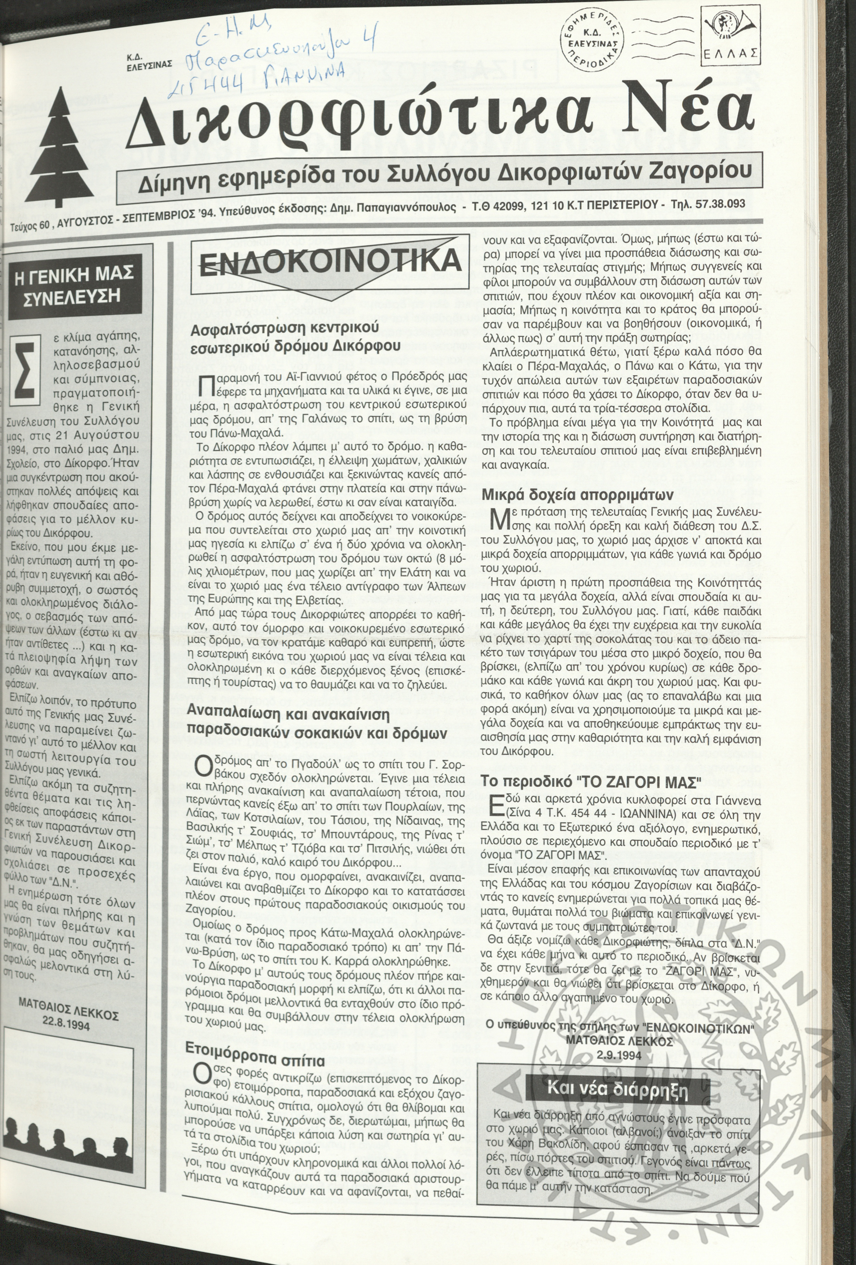 Δικορφιώτικα νέα: Δίμηνη εφημερίδα του Συλλόγου Δικορφιωτών Ζαγορίου, 1994, φ. 60