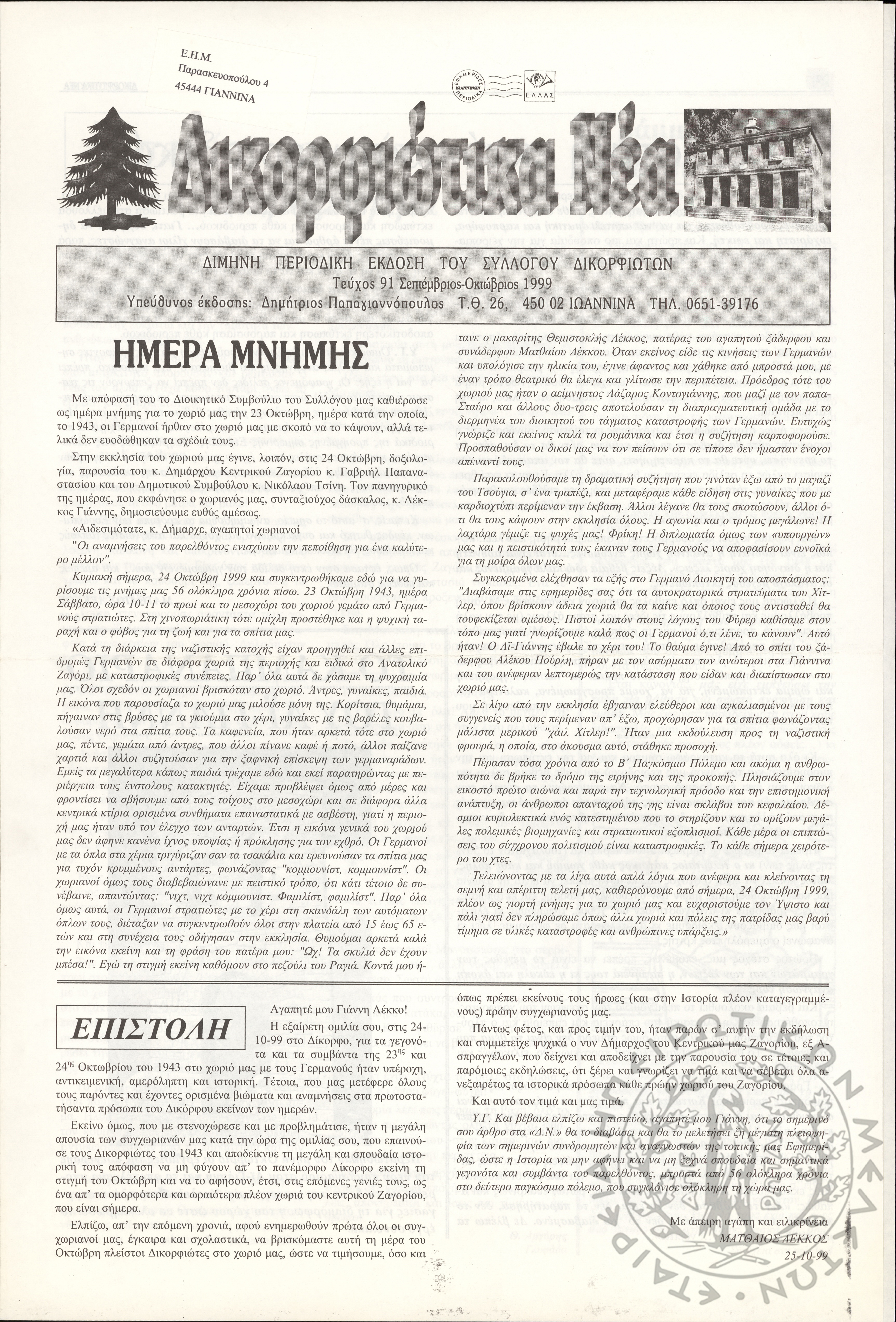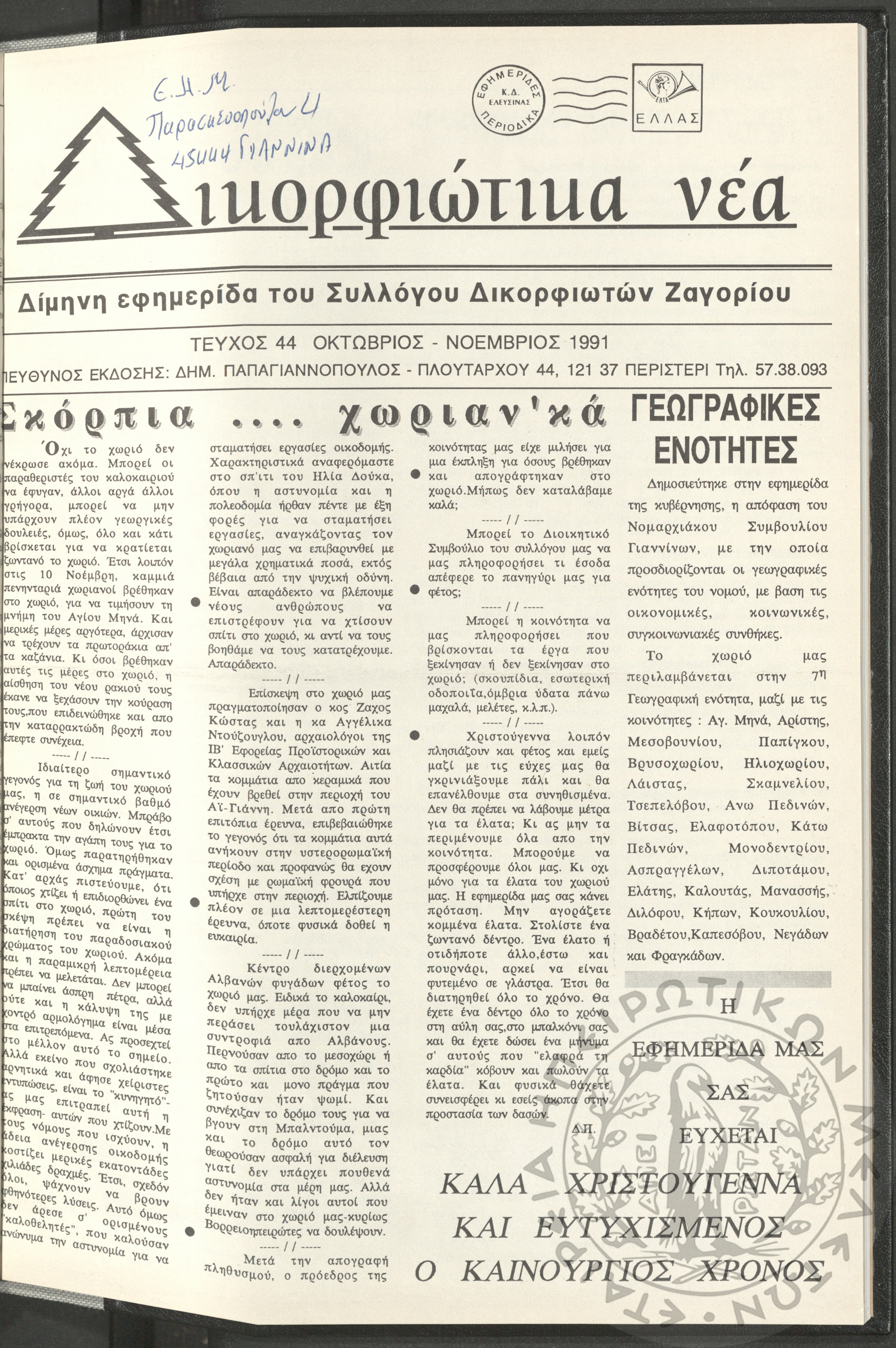 Δικορφιώτικα νέα: Δίμηνη εφημερίδα του Συλλόγου Δικορφιωτών Ζαγορίου, 1991, φ. 44