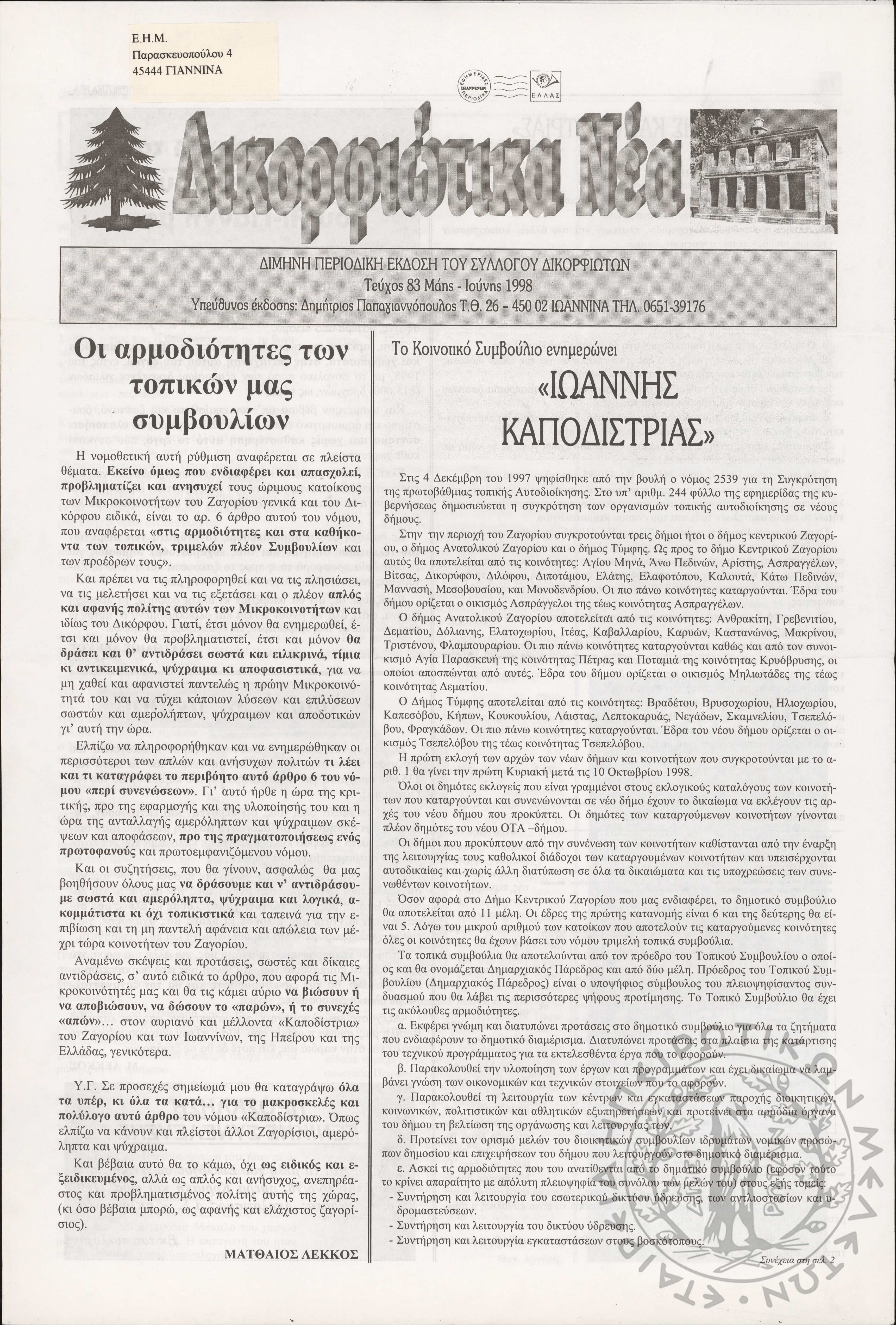 Δικορφιώτικα νέα: Δίμηνη περιοδική έκδοση του Συλλόγου Δικορφιωτών, 1998, φ. 83