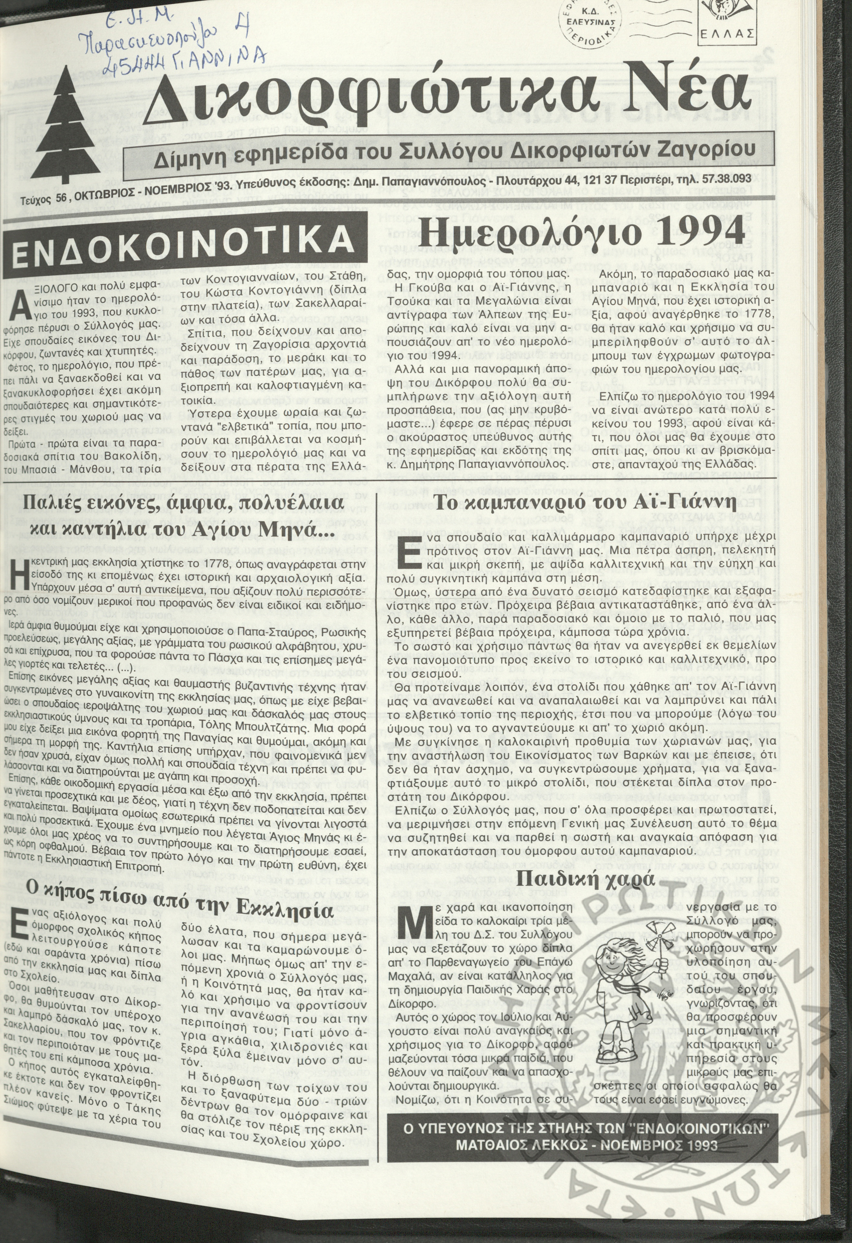 Δικορφιώτικα νέα: Δίμηνη εφημερίδα του Συλλόγου Δικορφιωτών Ζαγορίου, 1993, φ. 56