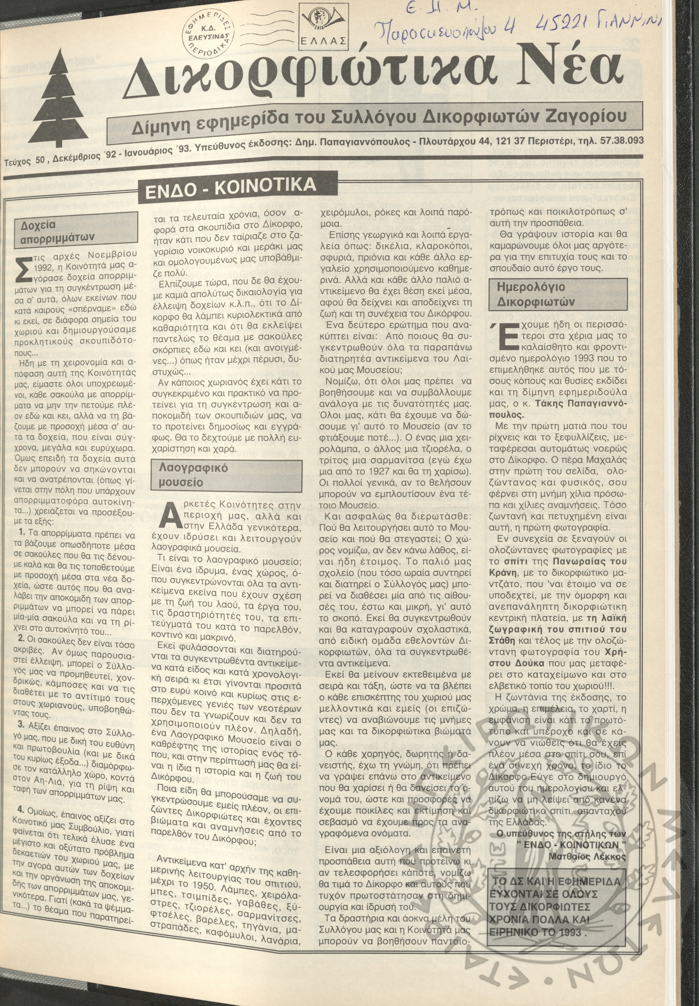 Δικορφιώτικα νέα: Δίμηνη εφημερίδα του Συλλόγου Δικορφιωτών Ζαγορίου, 1992-1993, φ. 50