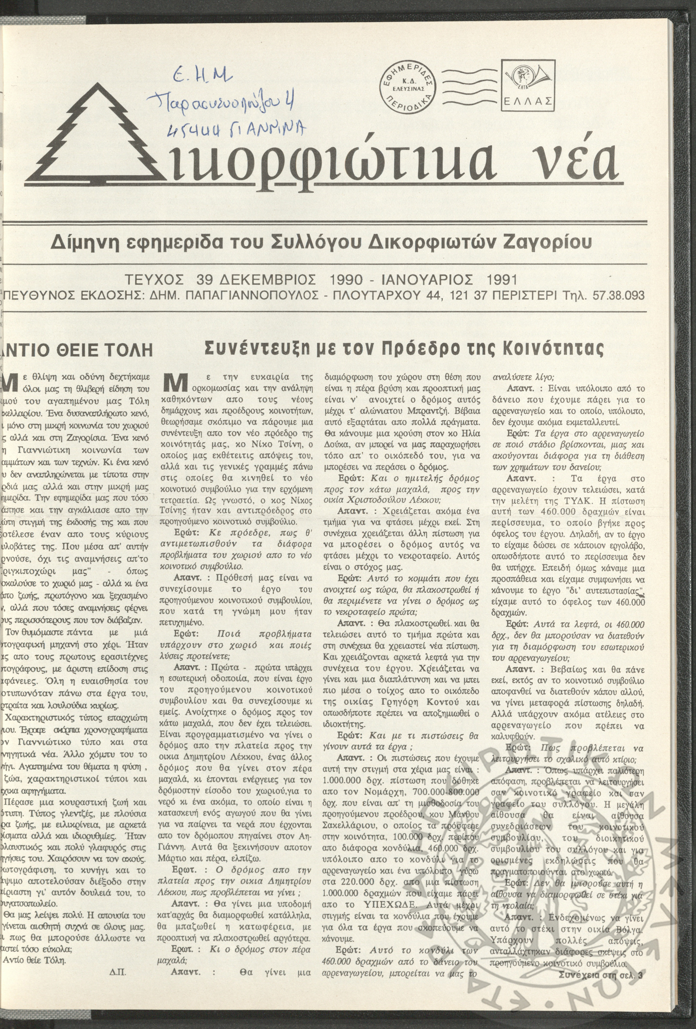 Δικορφιώτικα νέα: Δίμηνη εφημερίδα του Συλλόγου Δικορφιωτών Ζαγορίου, 1990-1991, φ. 39