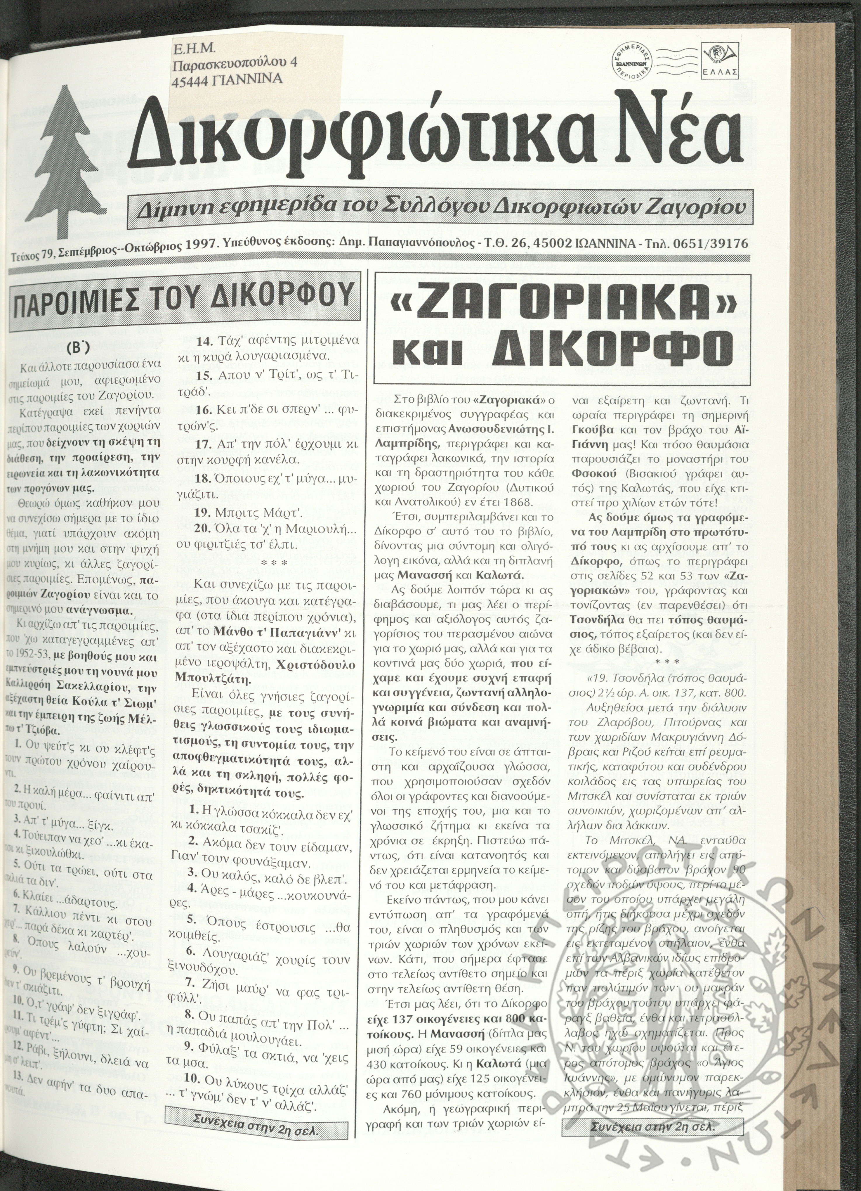 Δικορφιώτικα νέα: Δίμηνη εφημερίδα του Συλλόγου Δικορφιωτών Ζαγορίου, 1997, φ. 79