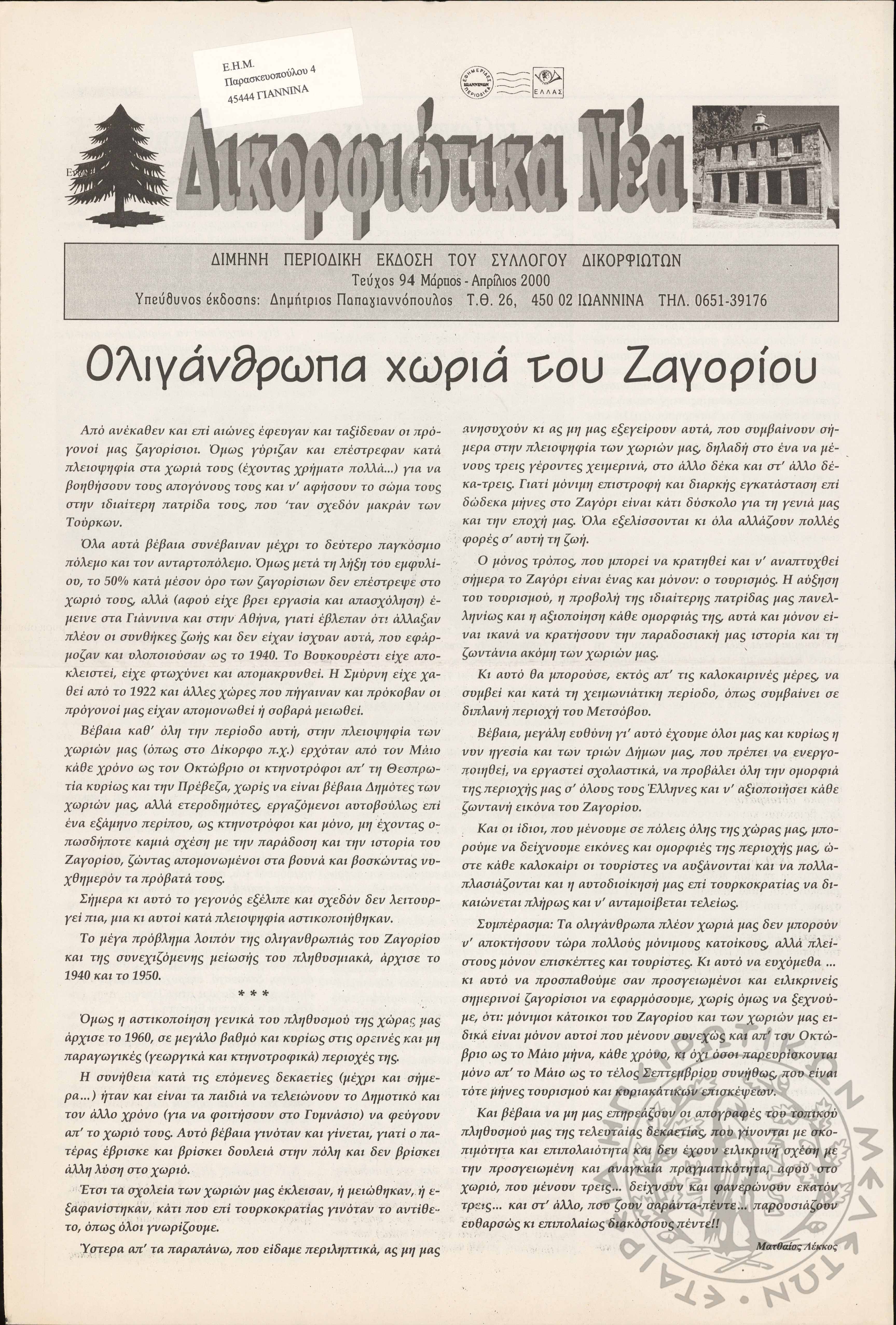 Δικορφιώτικα νέα: Δίμηνη περιοδική έκδοση του Συλλόγου Δικορφιωτών, 2000, φ. 94