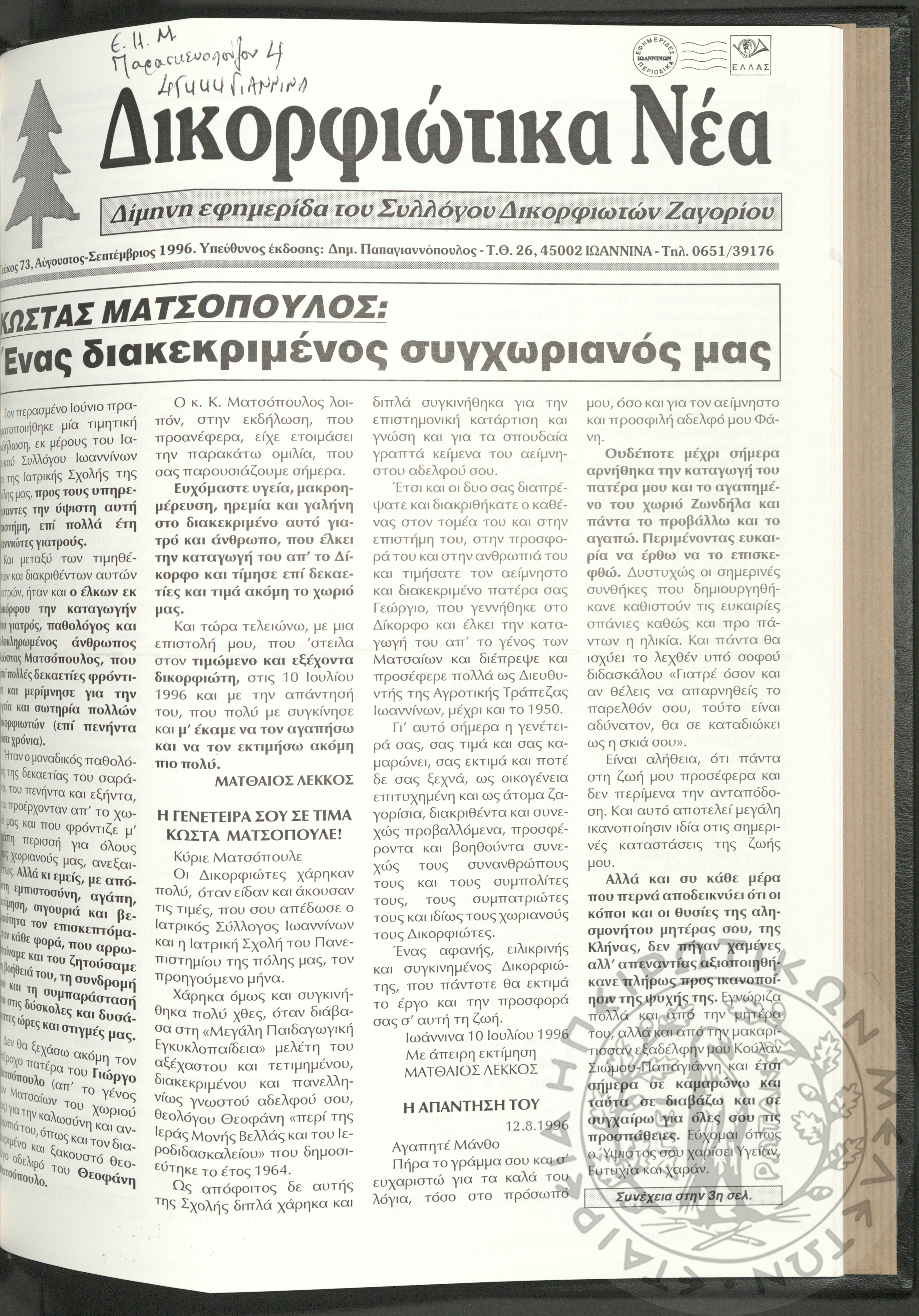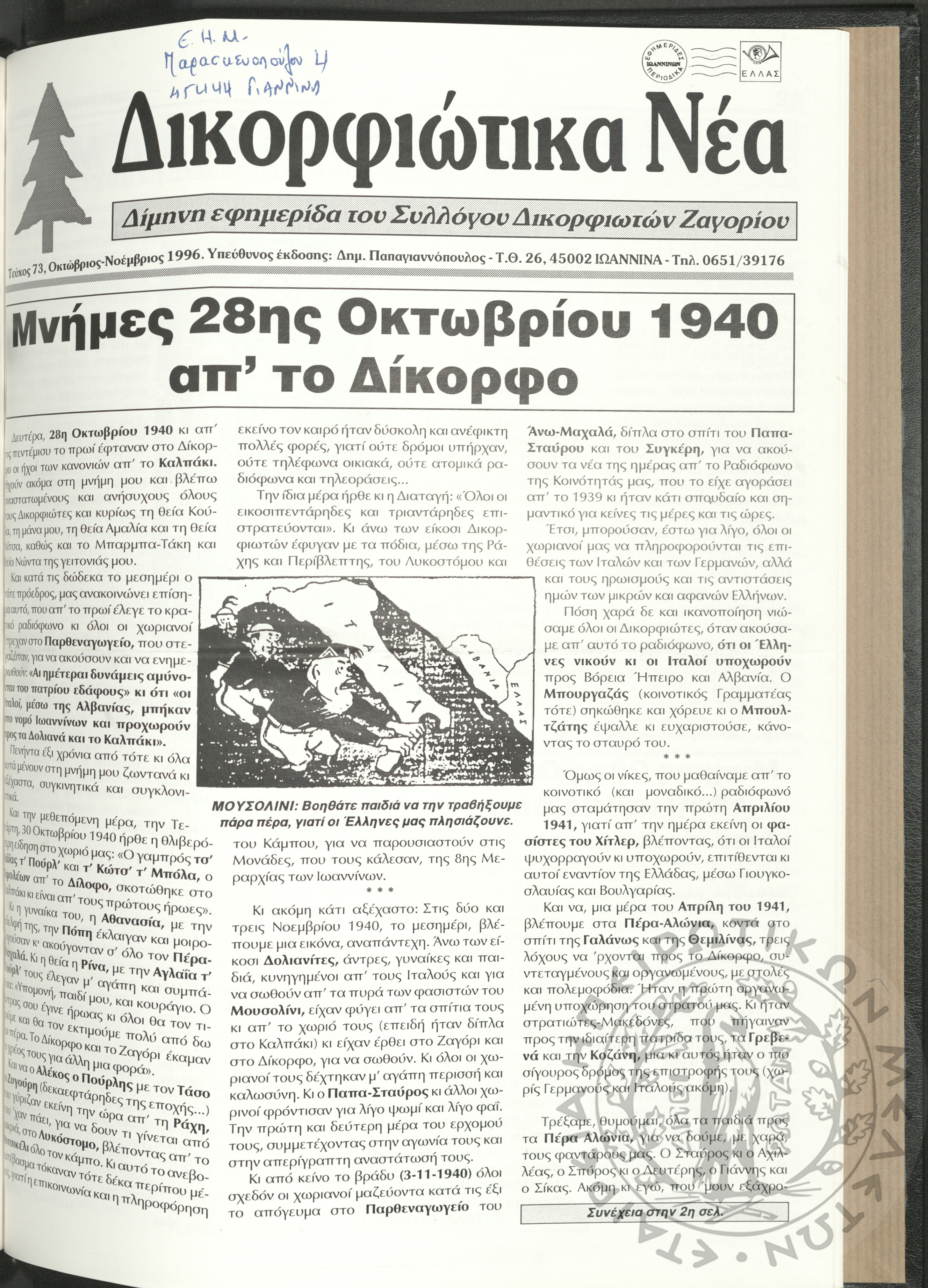 Δικορφιώτικα νέα: Δίμηνη εφημερίδα του Συλλόγου Δικορφιωτών Ζαγορίου, 1996, φ. 73