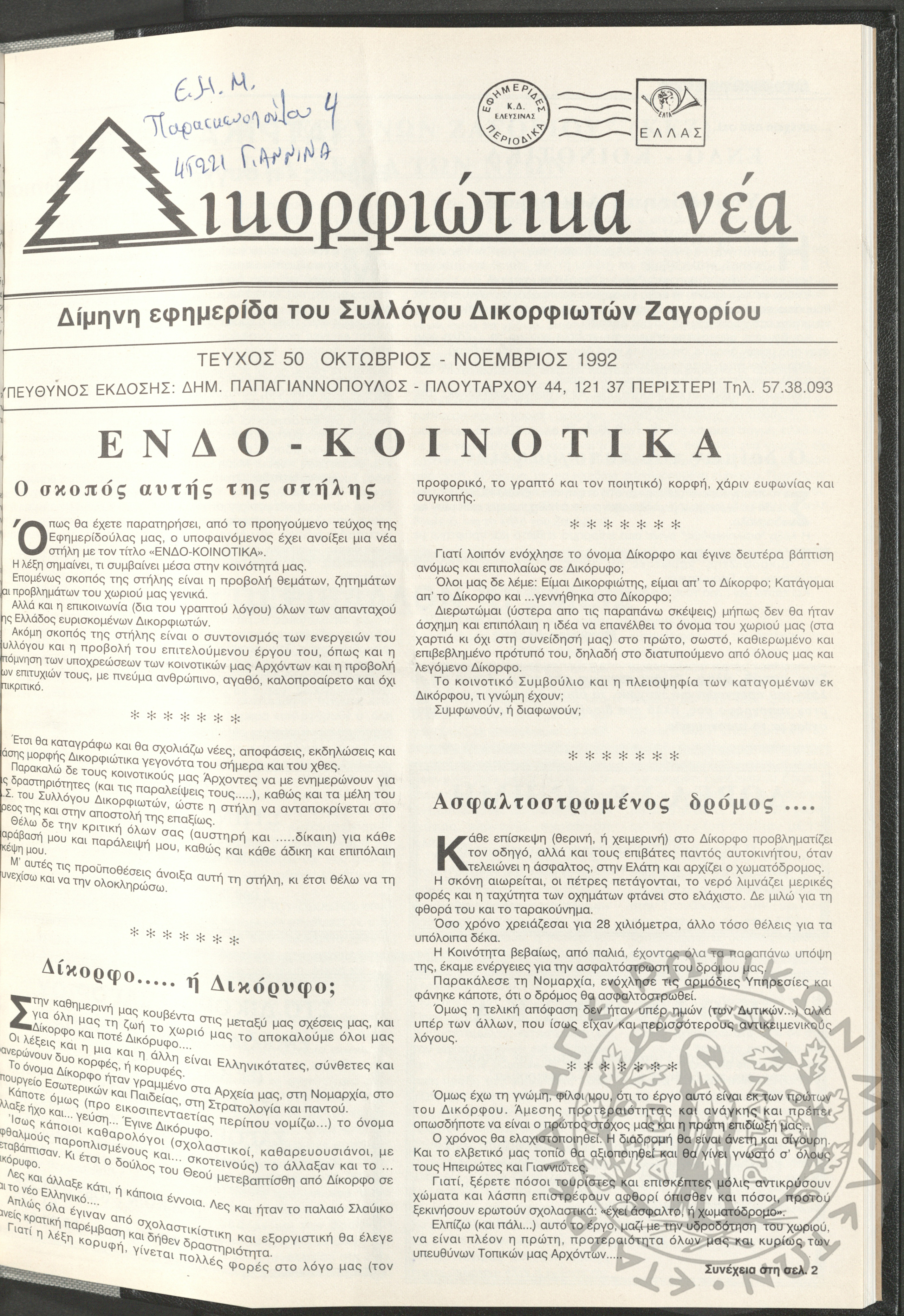 Δικορφιώτικα νέα: Δίμηνη εφημερίδα του Συλλόγου Δικορφιωτών Ζαγορίου, 1992, φ. 50