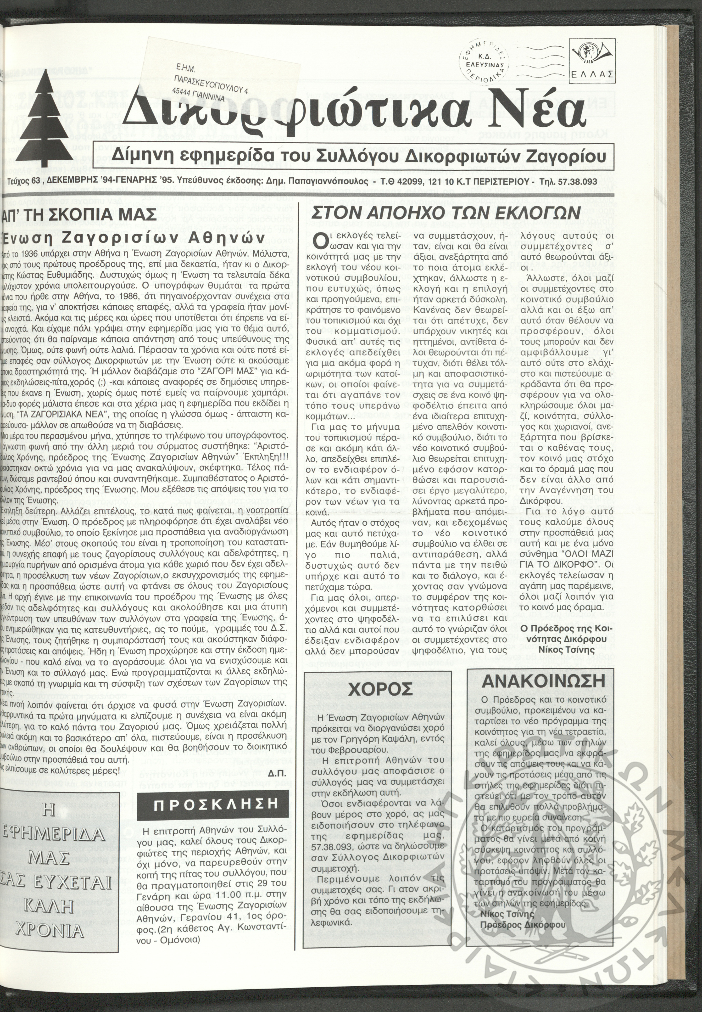 Δικορφιώτικα νέα: Δίμηνη εφημερίδα του Συλλόγου Δικορφιωτών Ζαγορίου, 1994-1995, φ. 63