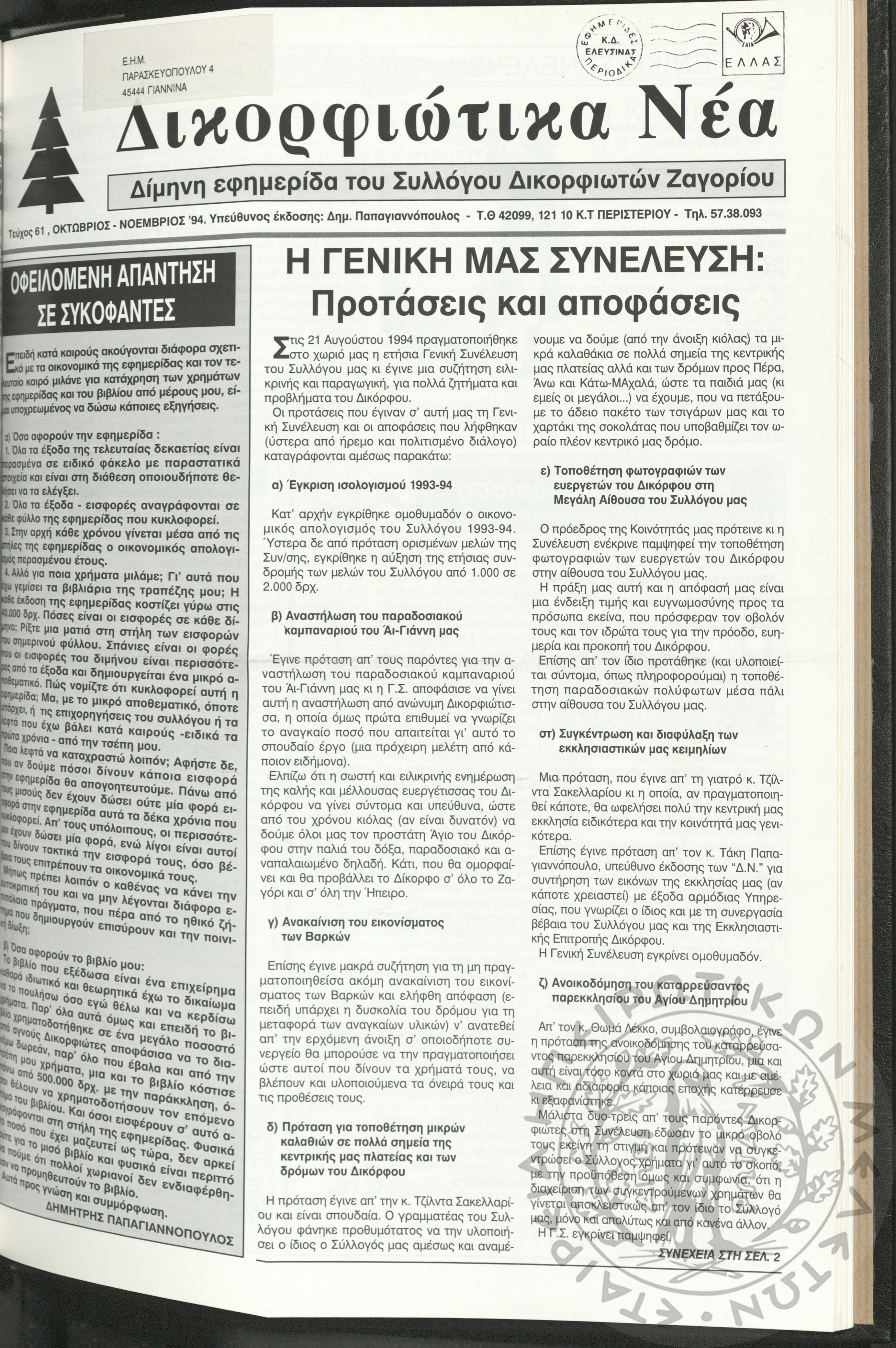 Δικορφιώτικα νέα: Δίμηνη εφημερίδα του Συλλόγου Δικορφιωτών Ζαγορίου, 1994, φ. 61