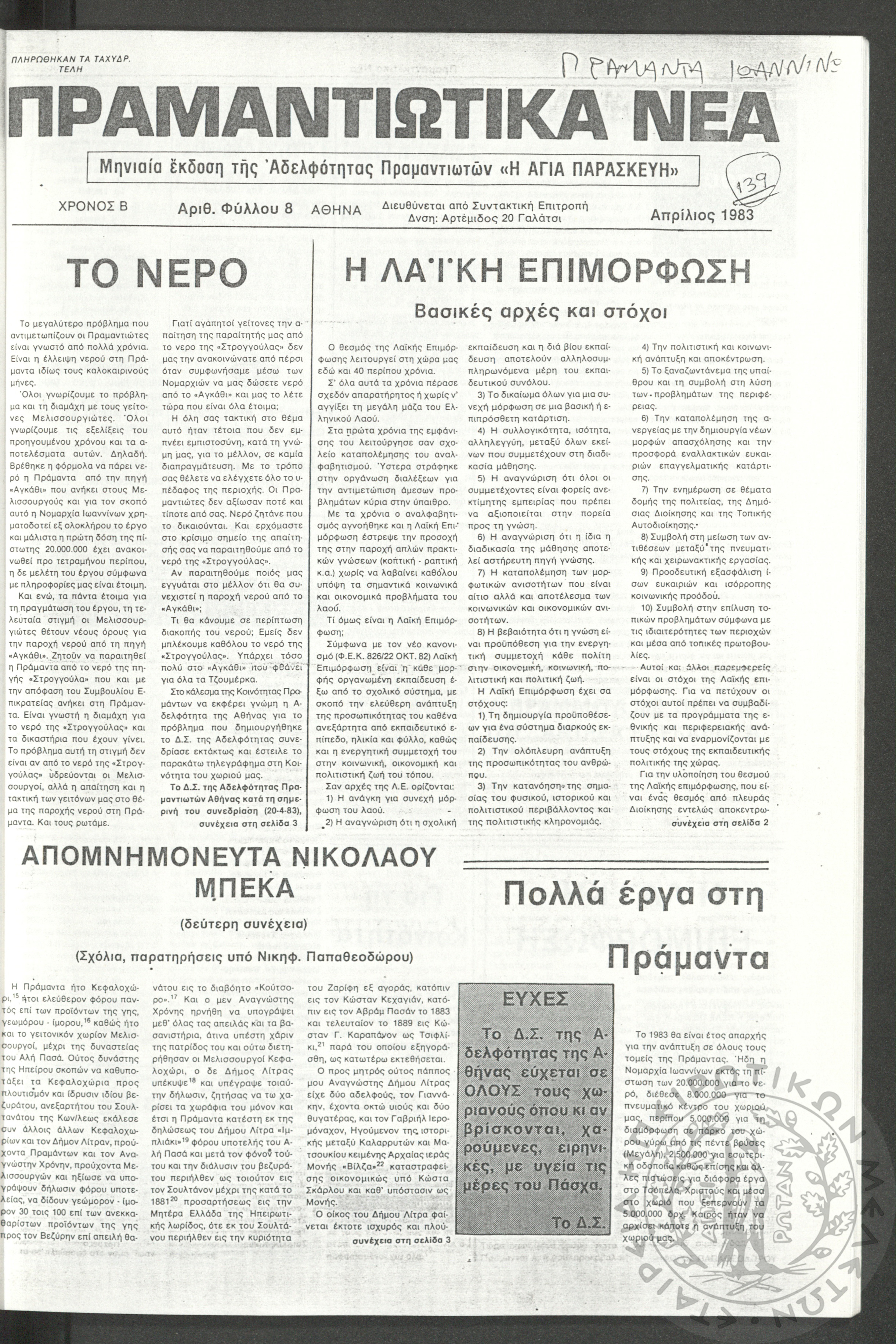 Πραμαντιώτικα Νέα: μηνιαία έκδοση της Αδελφότητας Πραμαντιωτών "Η Αγία Παρασκευή", 1983, φ. 8Έτος Β΄, αρ. φ. 8...