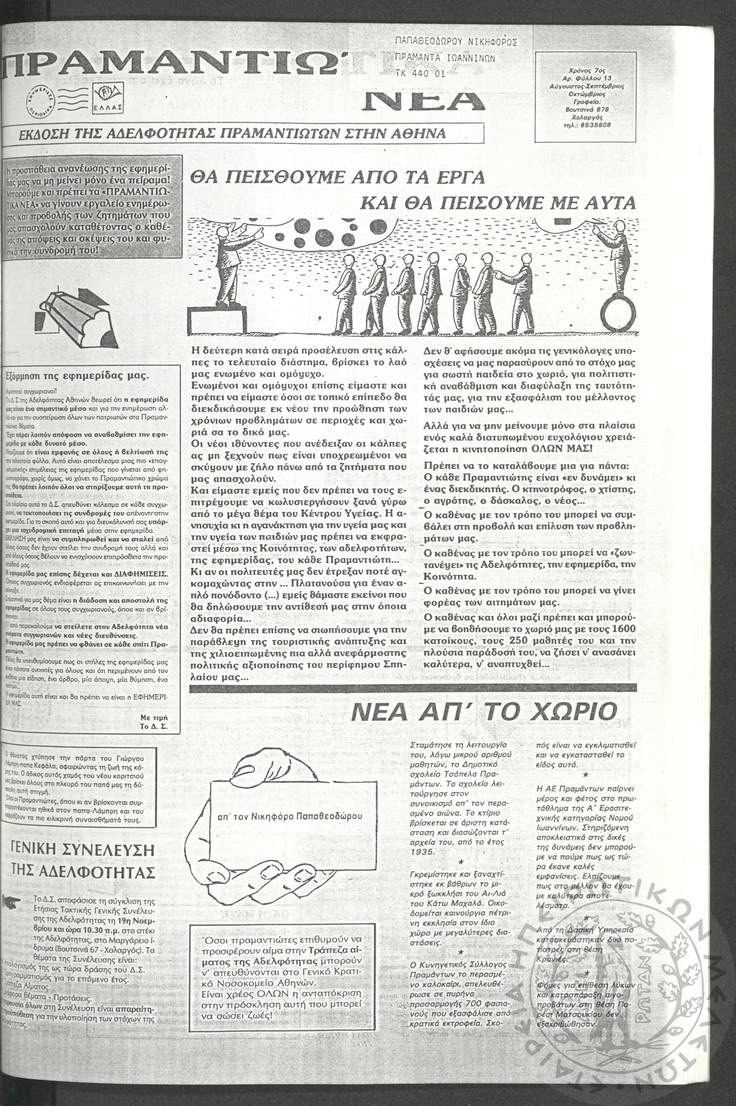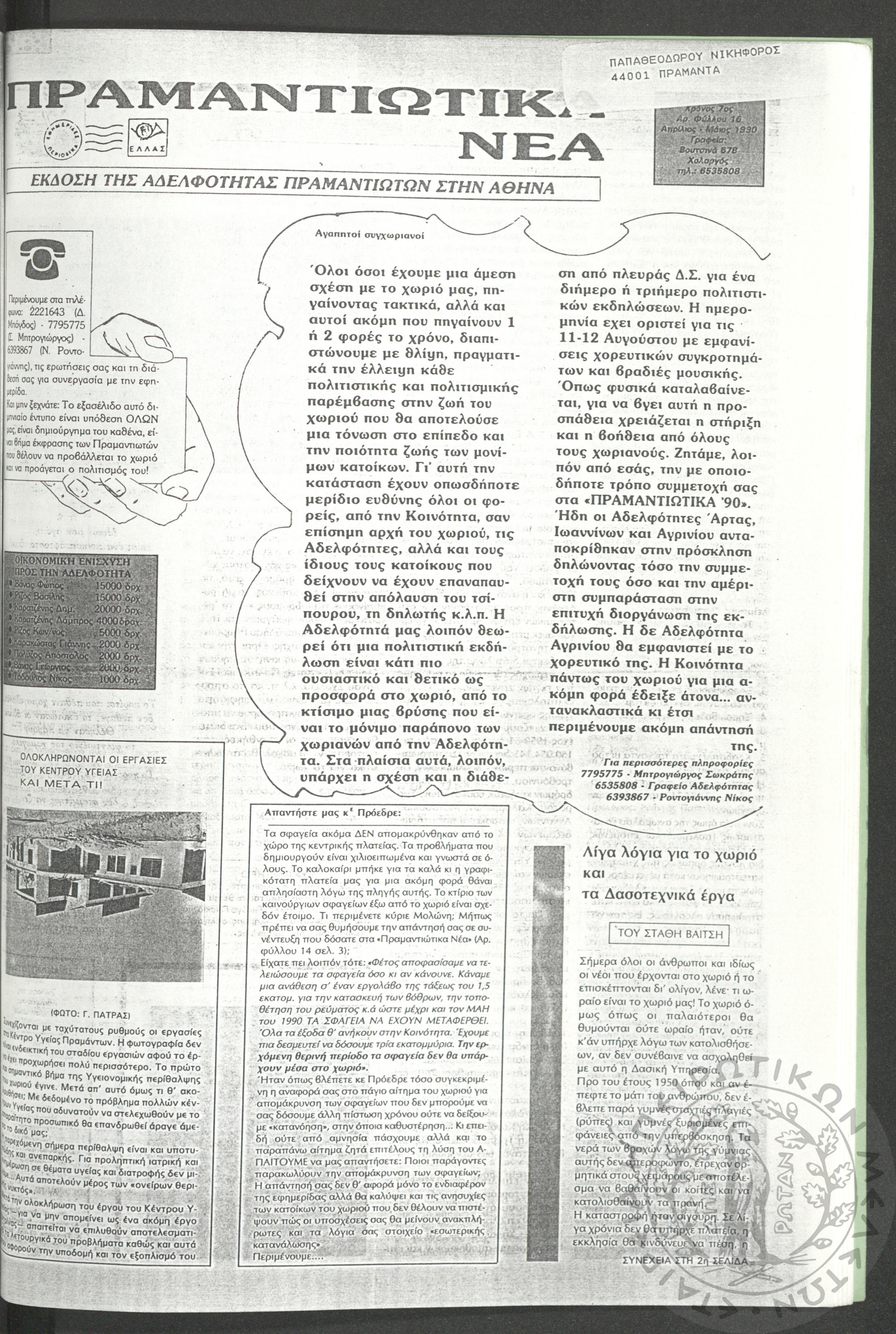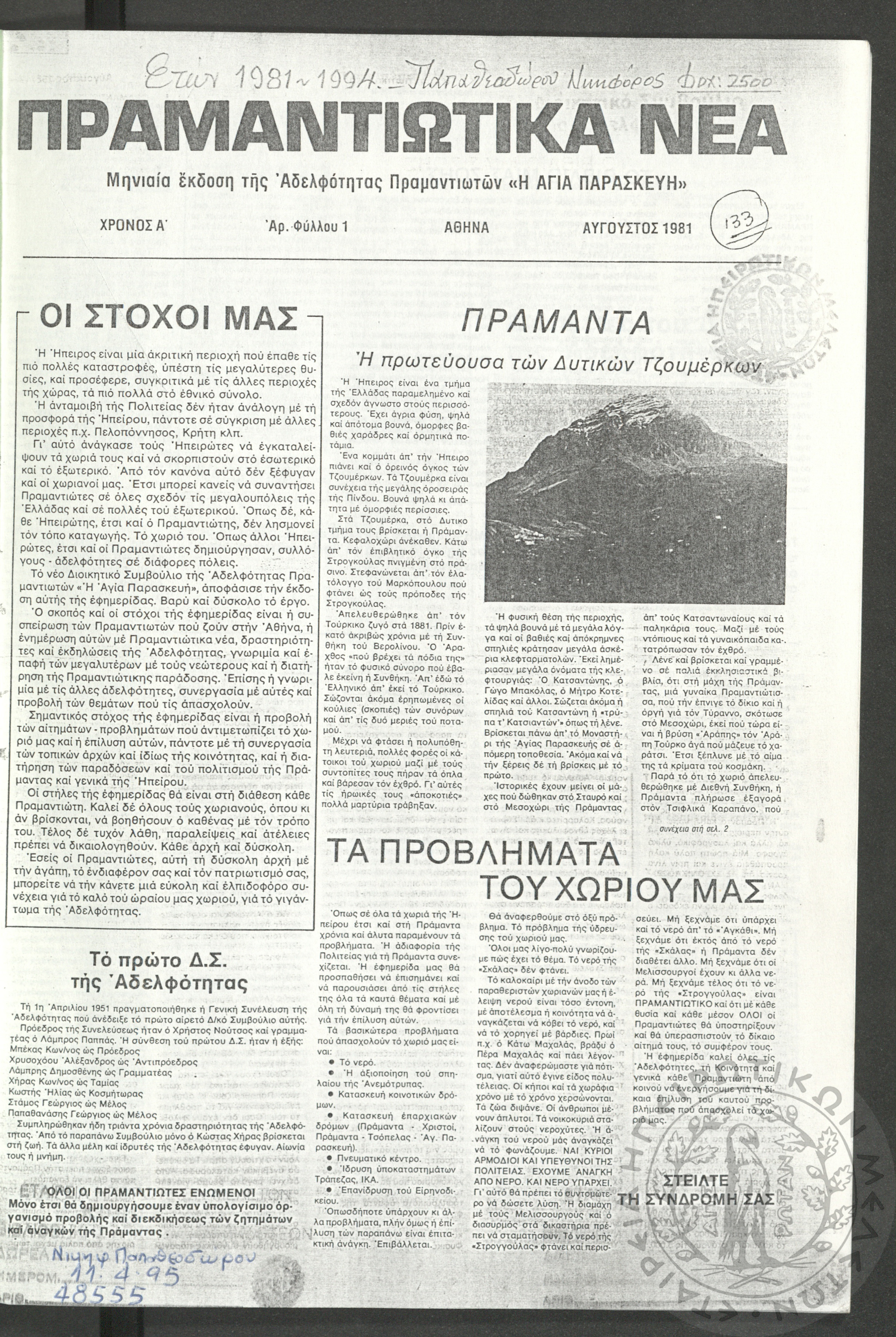 Πραμαντιώτικα Νέα: μηνιαία έκδοση της Αδελφότητας Πραμαντιωτών "Η Αγία Παρασκευή", 1981, φ. 1Έτος Α΄, αρ. φ. 1...