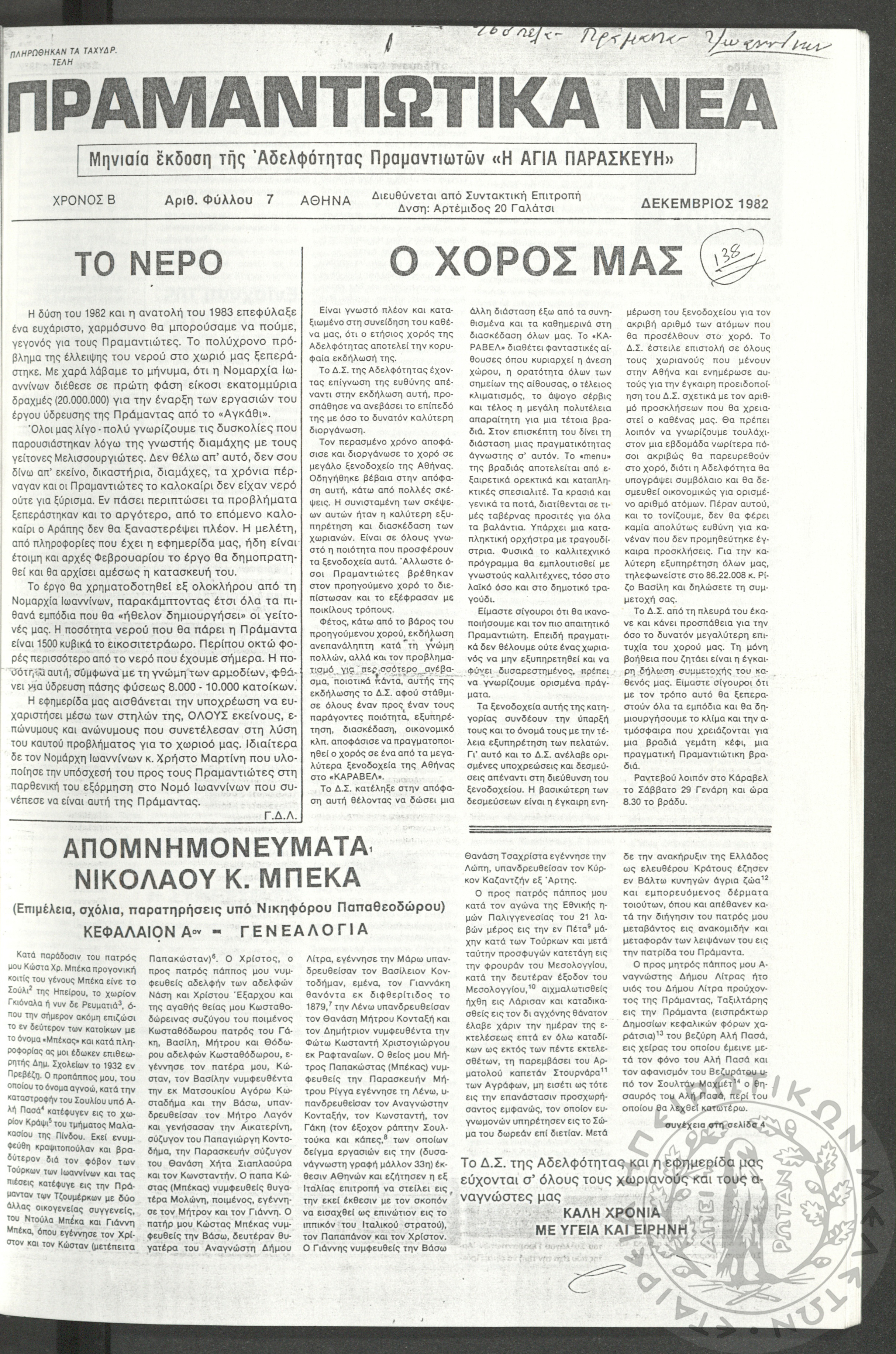 Πραμαντιώτικα Νέα: μηνιαία έκδοση της Αδελφότητας Πραμαντιωτών "Η Αγία Παρασκευή", 1982, φ. 7Έτος Β΄, αρ. φ. 7...