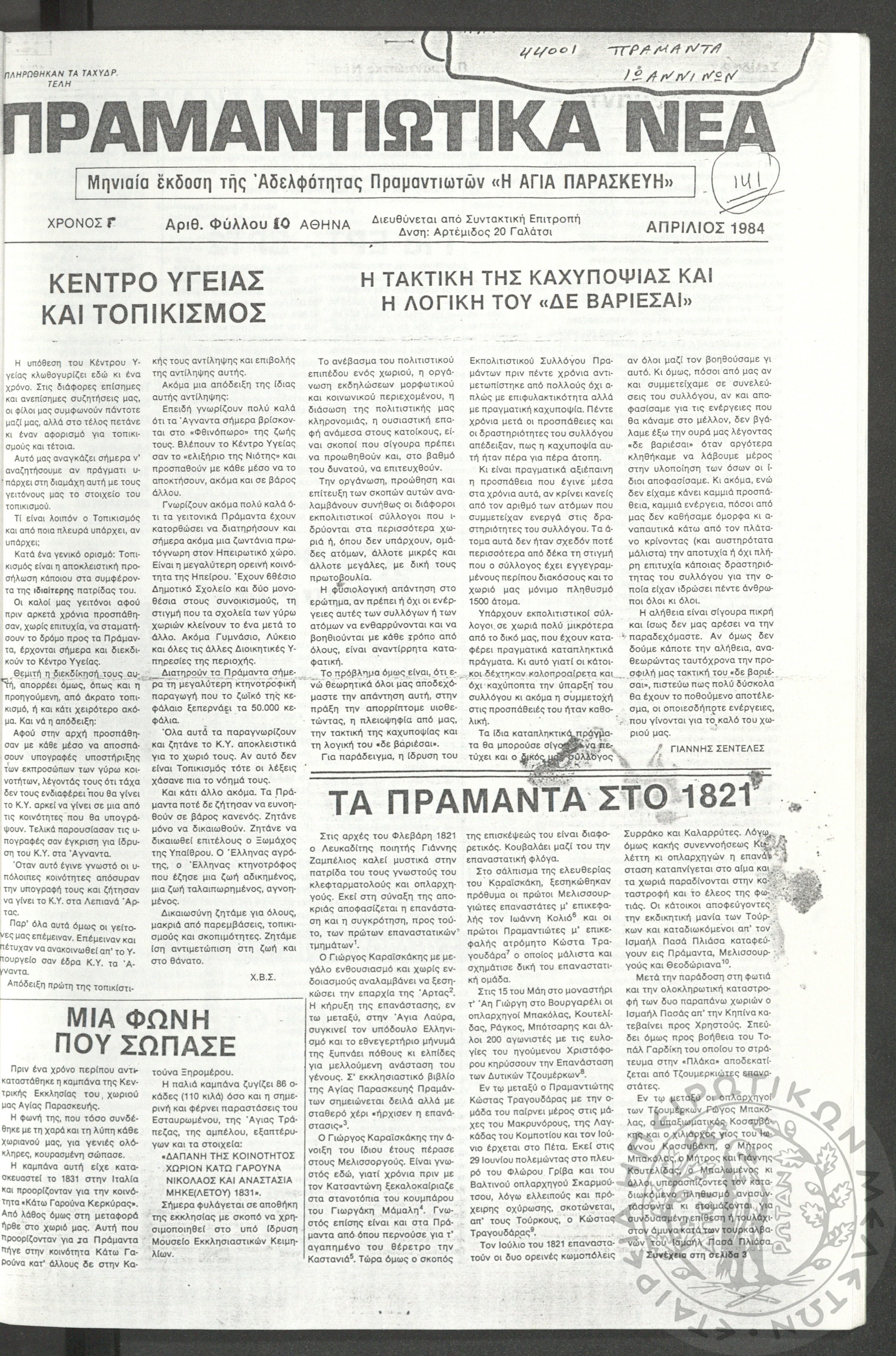 Πραμαντιώτικα Νέα: μηνιαία έκδοση της Αδελφότητας Πραμαντιωτών "Η Αγία Παρασκευή", 1984, φ. 10Έτος Γ΄, αρ. φ. 10...