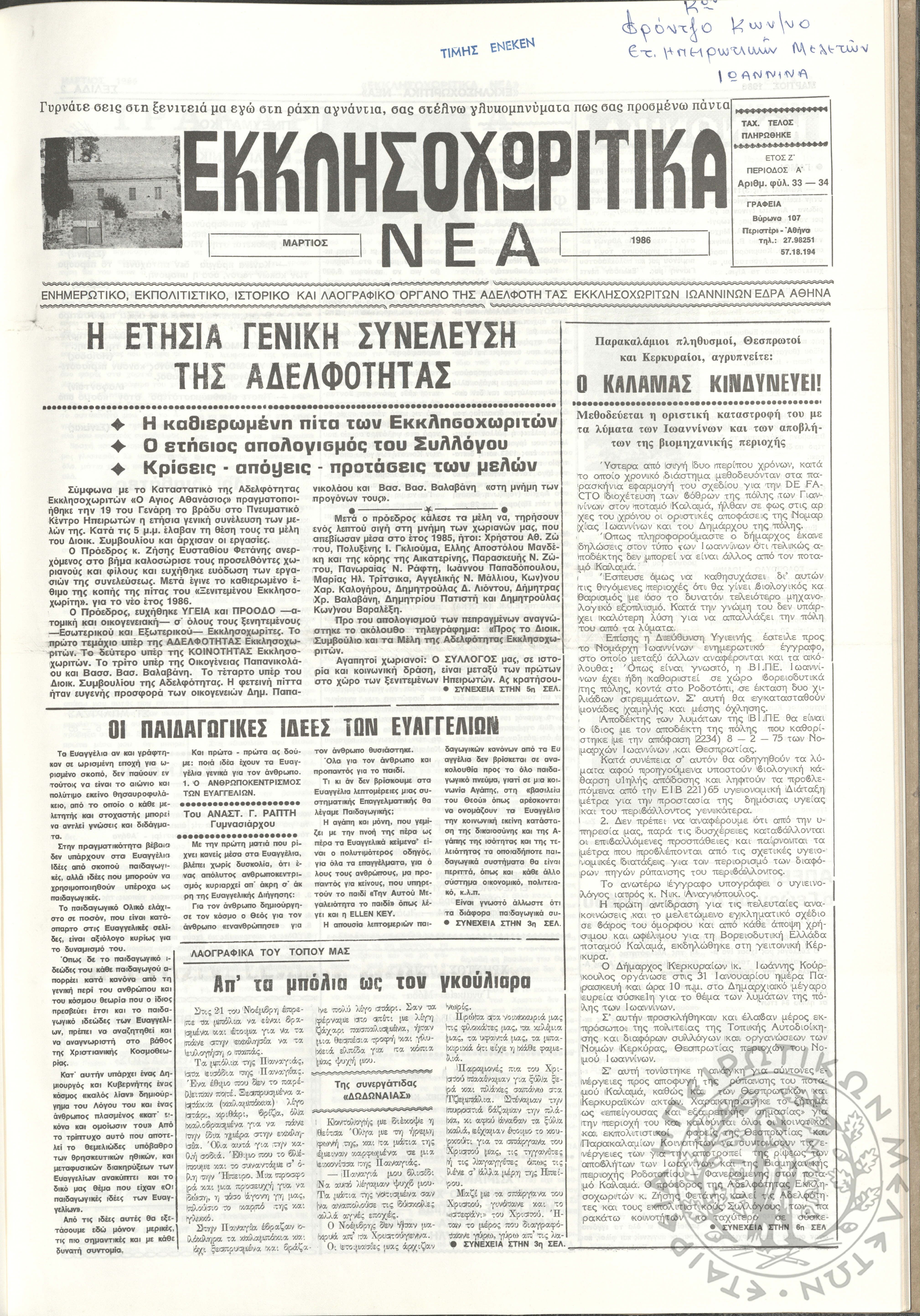 Εκκλησοχωρίτικα Νέα: Ενημερωτικό, εκπολιτιστικό, ιστορικό και λαογραφικό όργανο της Αδελφότητας Εκκλησοχωριτών Ηπείρου, 1986, φ. 33-34Έτος Ζ', φ. 33-34...