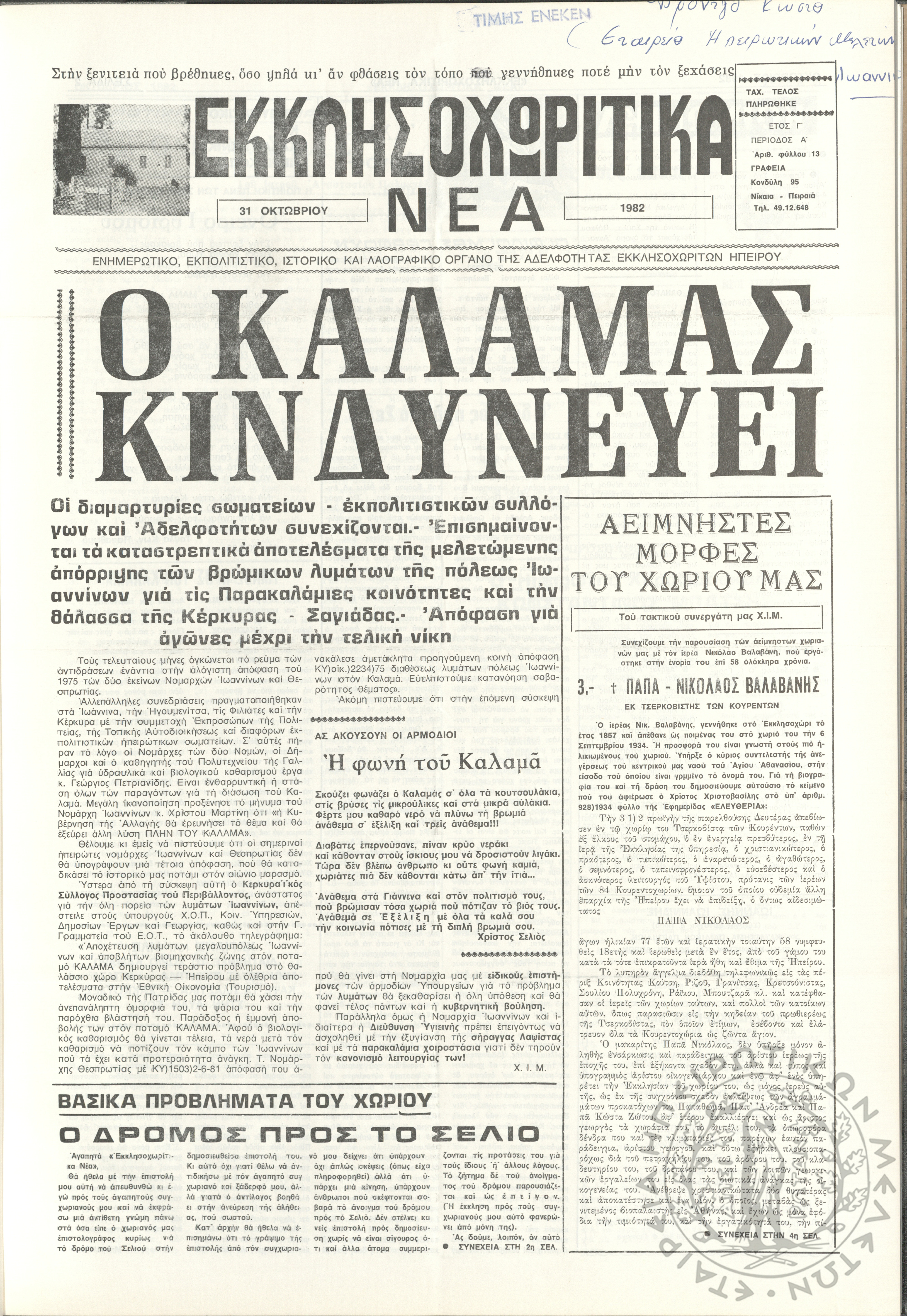 Εκκλησοχωρίτικα Νέα: Ενημερωτικό, εκπολιτιστικό, ιστορικό και λαογραφικό όργανο της Αδελφότητας Εκκλησοχωριτών Ηπείρου, 1982, φ. 13Έτος Γ', φ. 13...