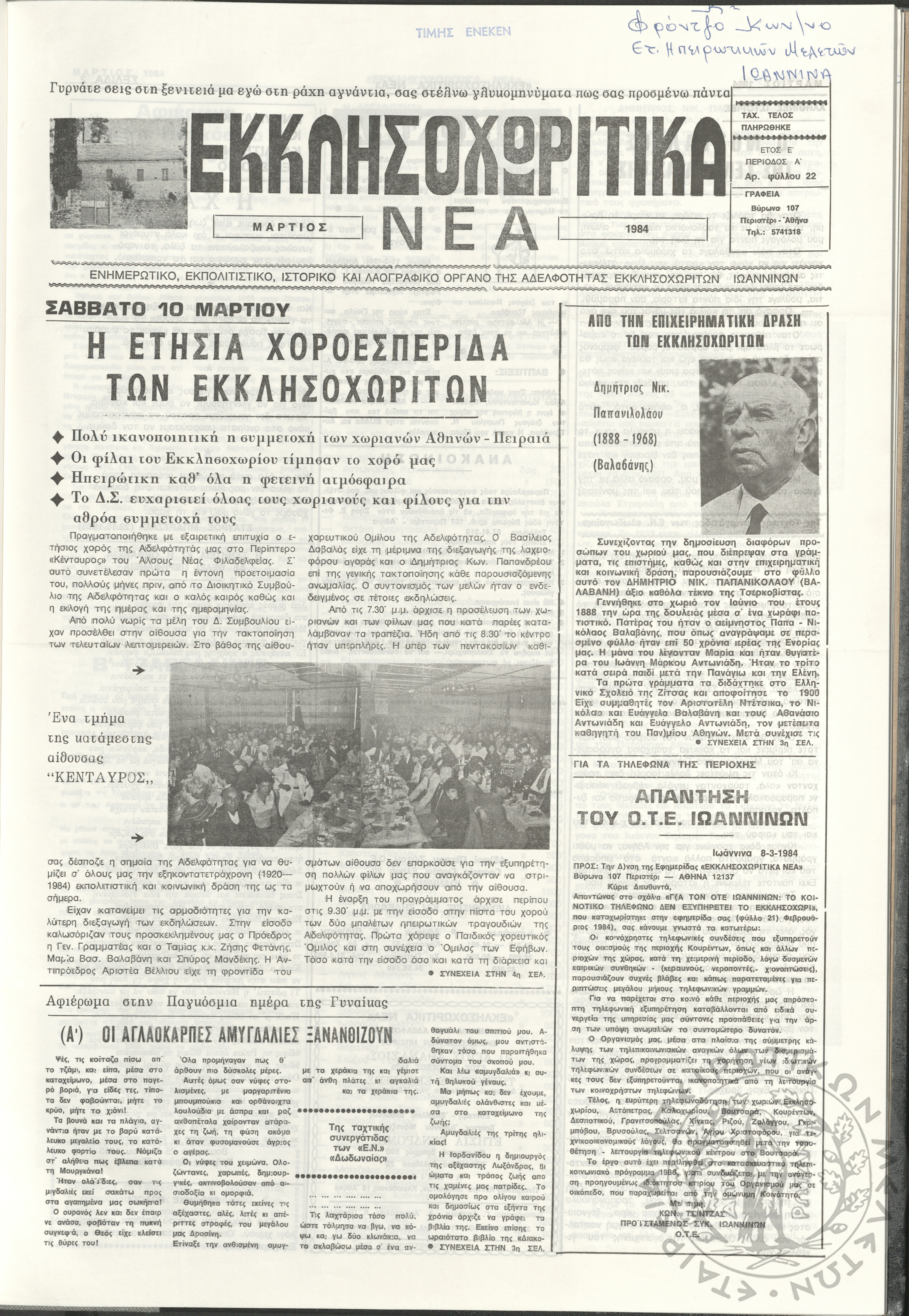 Εκκλησοχωρίτικα Νέα: Ενημερωτικό, εκπολιτιστικό, ιστορικό και λαογραφικό όργανο της Αδελφότητας Εκκλησοχωριτών Ηπείρου, 1984, φ. 22Έτος Ε', φ. 22...