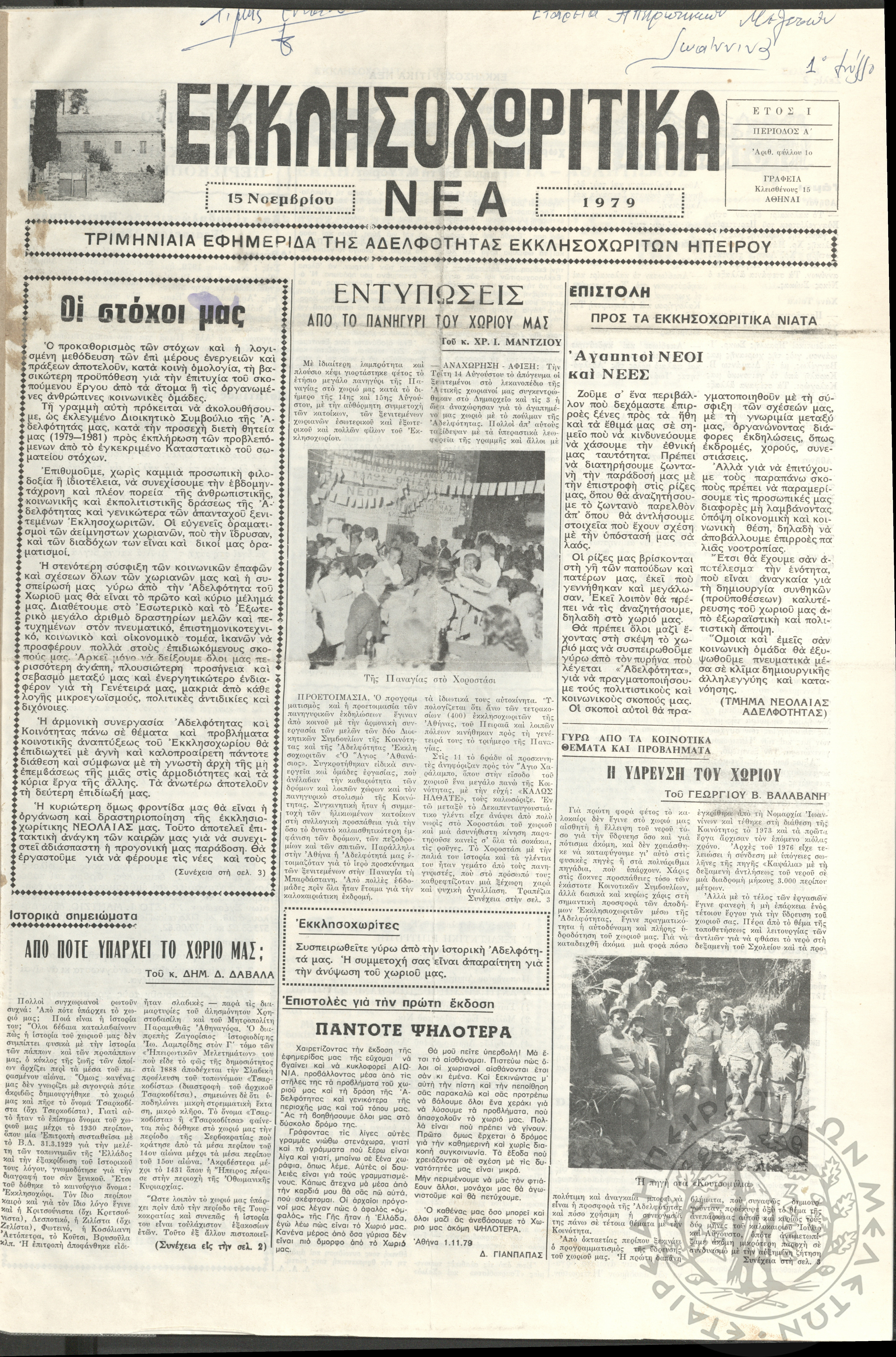 Εκκλησοχωρίτικα Νέα: Τριμηνιαία εφημεριδα της Αδελφότητας Εκκλησοχωριτών Ηπείρου, 1979, φ. 1Έτος Ι', φ. 1...