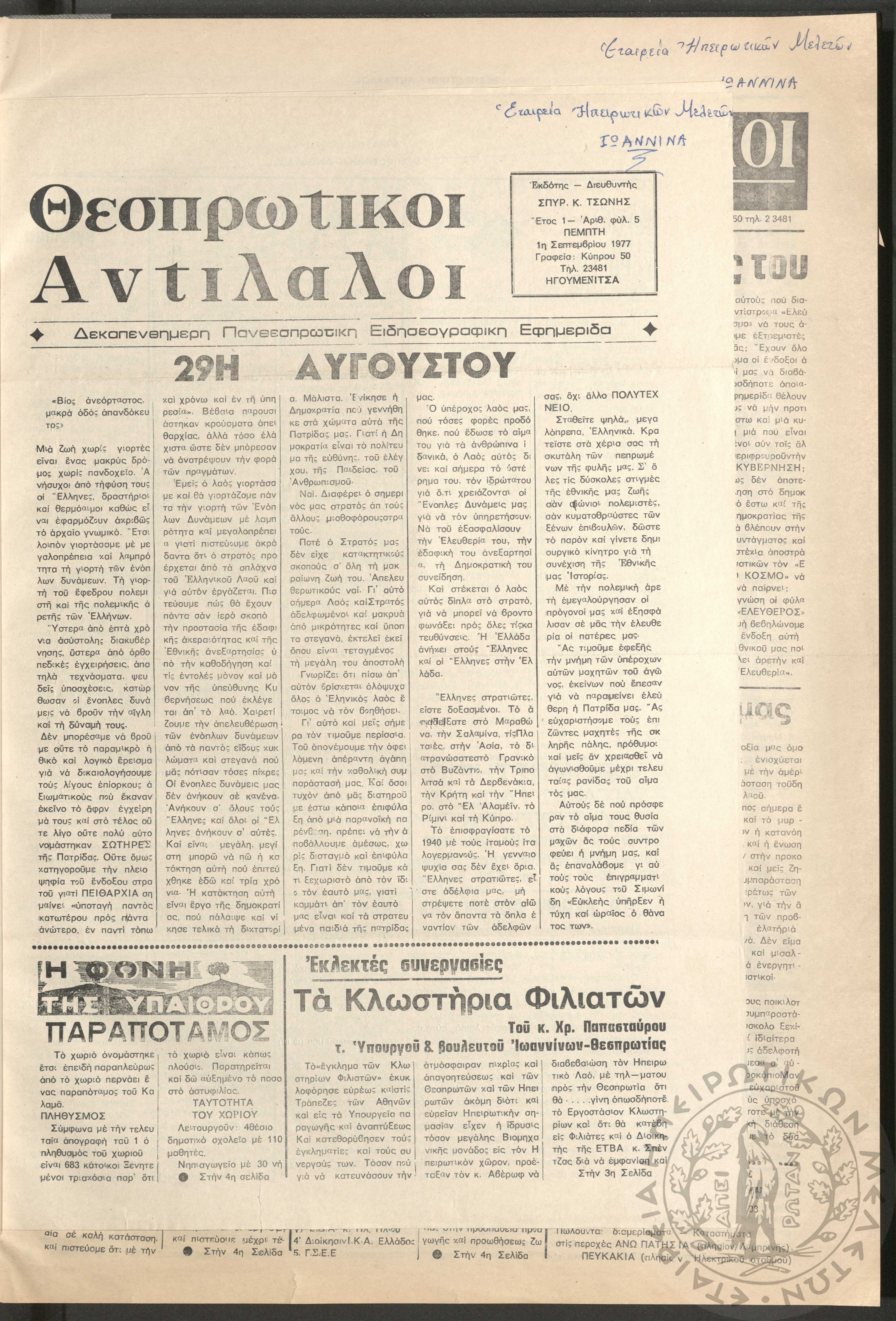 Θεσπρωτικοί Αντίλαλοι: Δεκαπενθήμερη Πανθεσπρωτική Ειδησεογραφική Εφημερίδα, 1977, φ. 5Έτος 1, φ. 5...