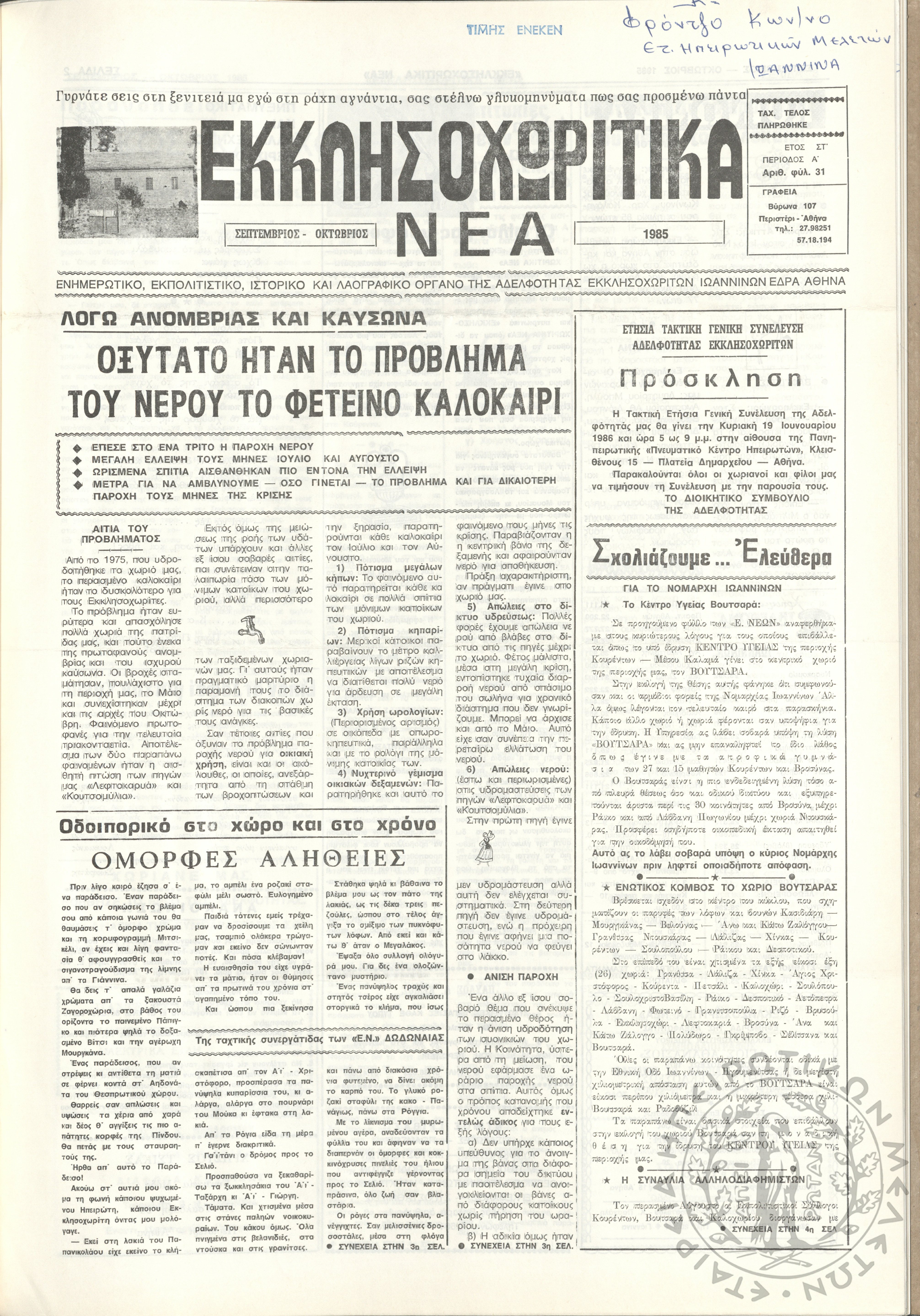 Εκκλησοχωρίτικα Νέα: Ενημερωτικό, εκπολιτιστικό, ιστορικό και λαογραφικό όργανο της Αδελφότητας Εκκλησοχωριτών Ηπείρου, 1985, φ. 31Έτος ΣΤ', φ. 31...