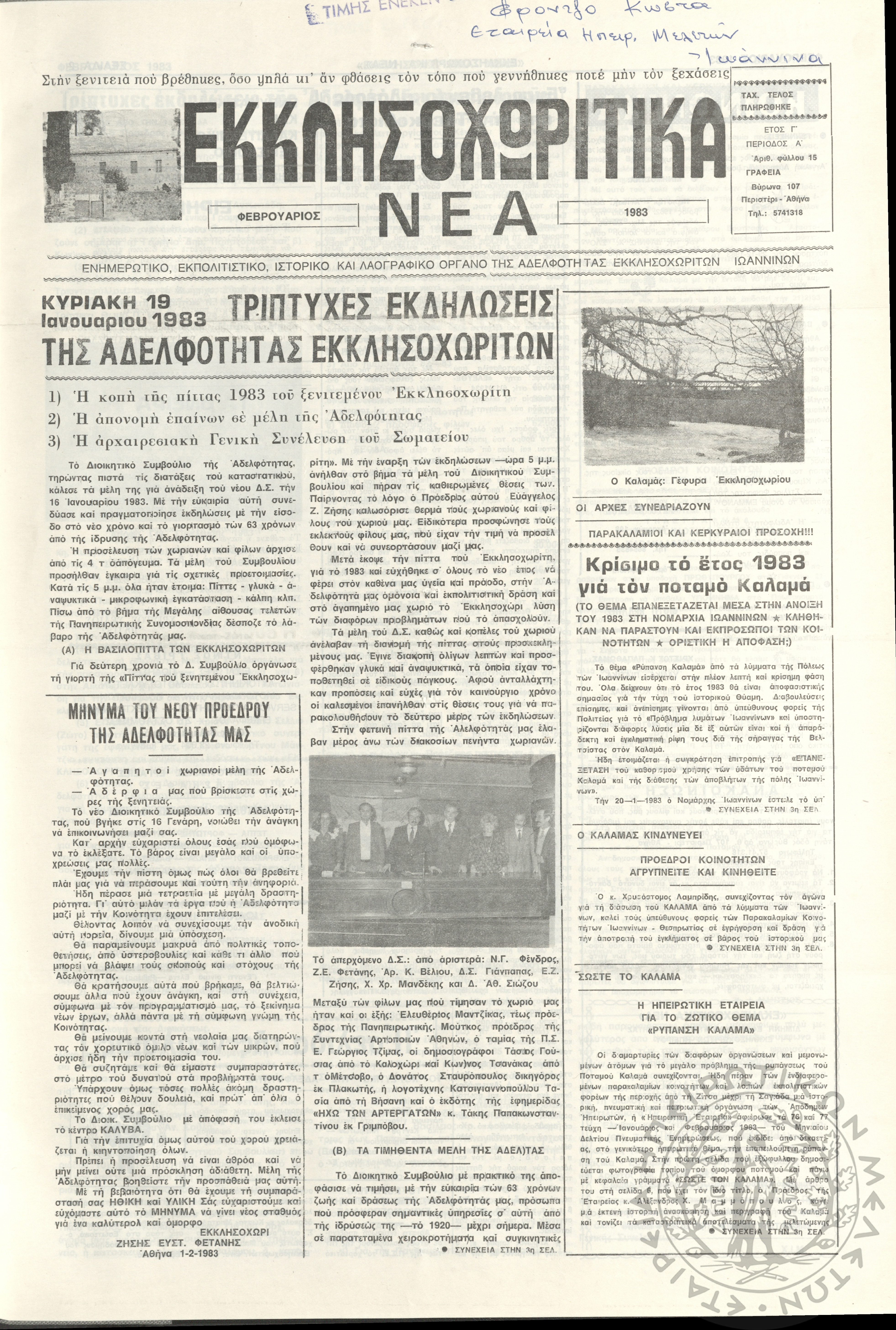 Εκκλησοχωρίτικα Νέα: Ενημερωτικό, εκπολιτιστικό, ιστορικό και λαογραφικό όργανο της Αδελφότητας Εκκλησοχωριτών Ιωαννίνων, 1983, φ. 15Έτος Γ', φ. 15...