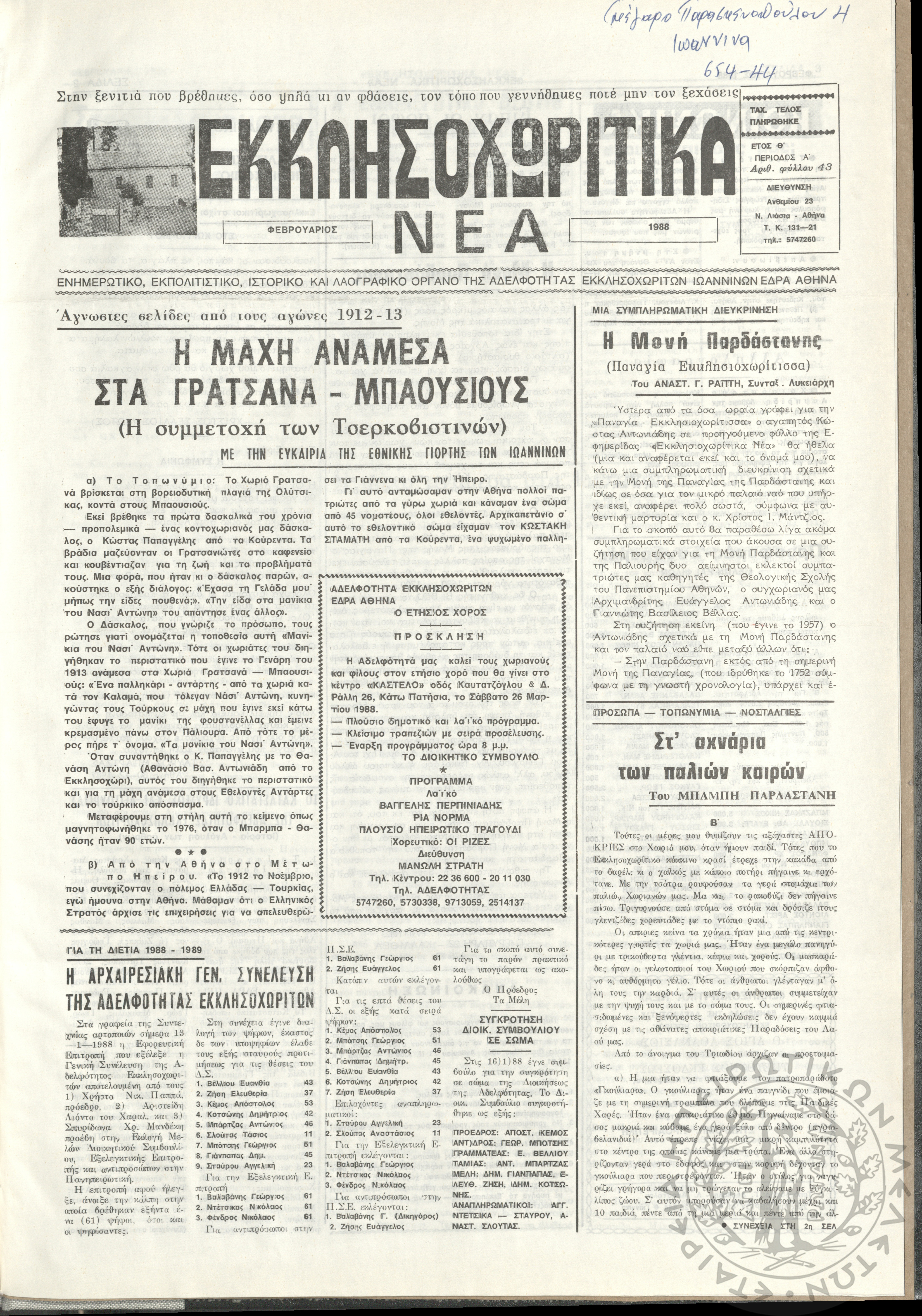Εκκλησοχωρίτικα Νέα: Ενημερωτικό, εκπολιτιστικό, ιστορικό και λαογραφικό όργανο της Αδελφότητας Εκκλησοχωριτών Ιωαννίνων, 1988, φ. 43Έτος Θ', φ. 43...