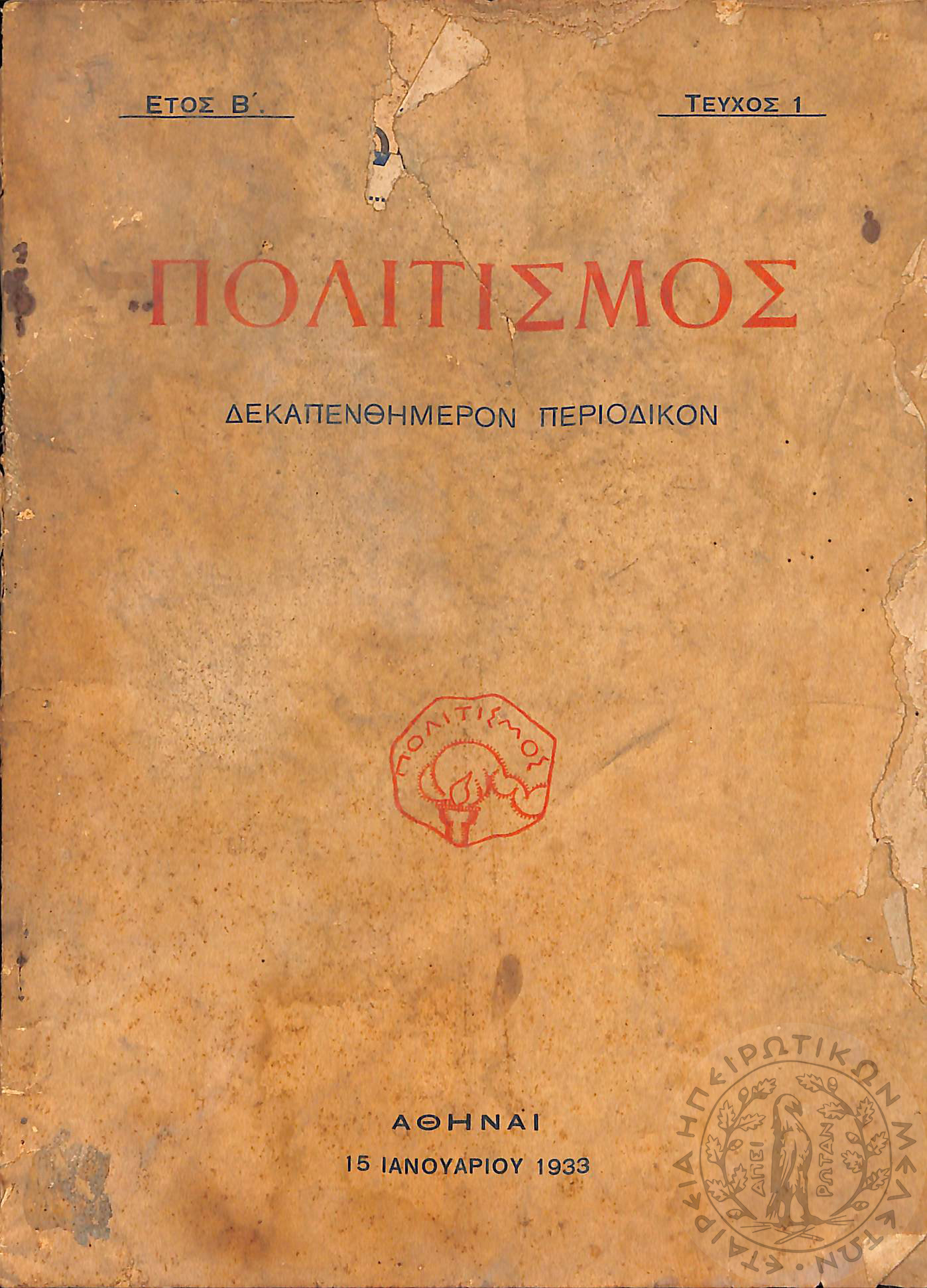 Πολιτισμός : δεκαπενθήμερον γενικόν περιοδικόν - πολιτισμός, κοινωνιολογία, οικονομολογία, επιστήμαι, γράμματα και τέχναι (τεύχ. 1)Έτος Β', τεύχ. 1...