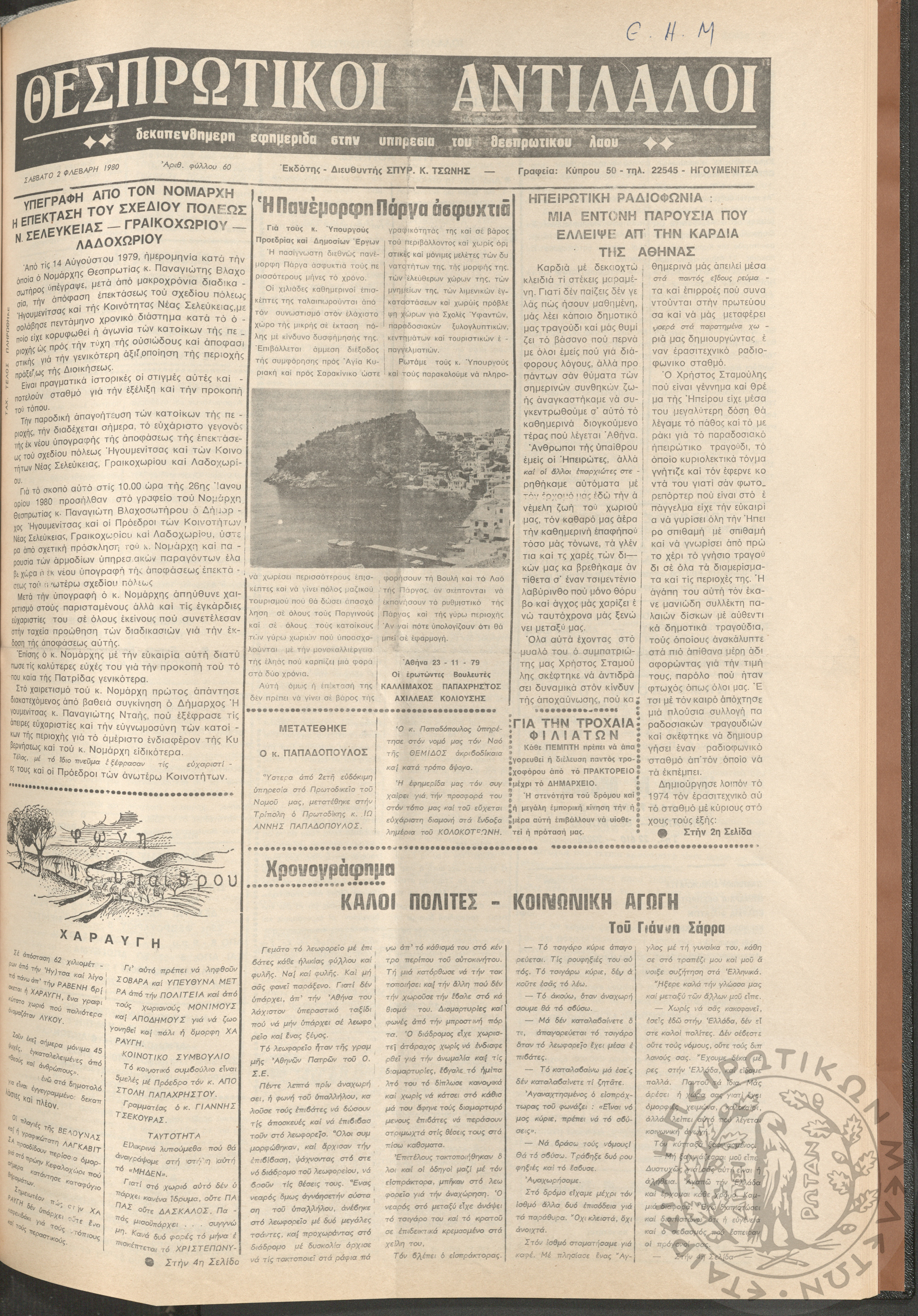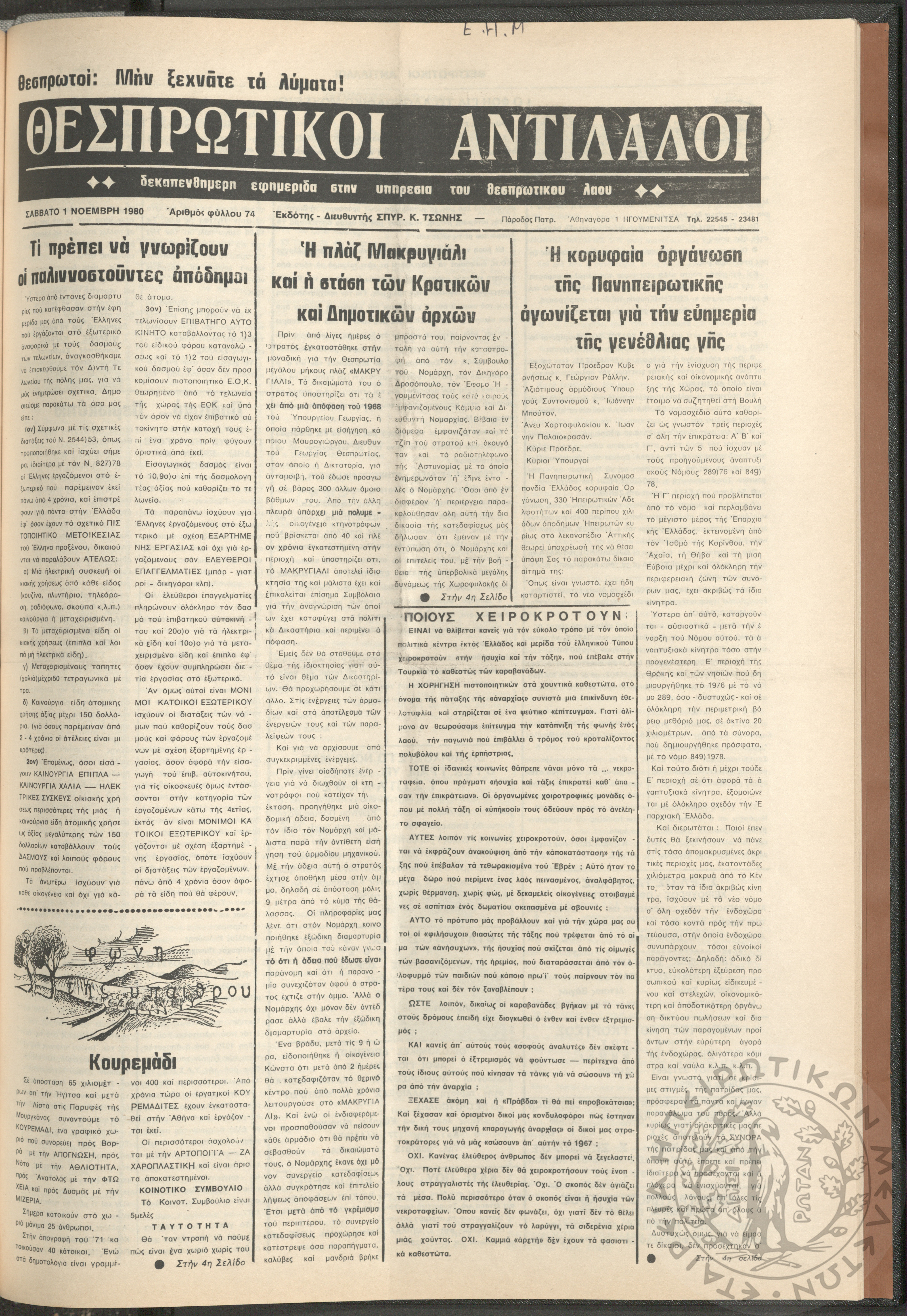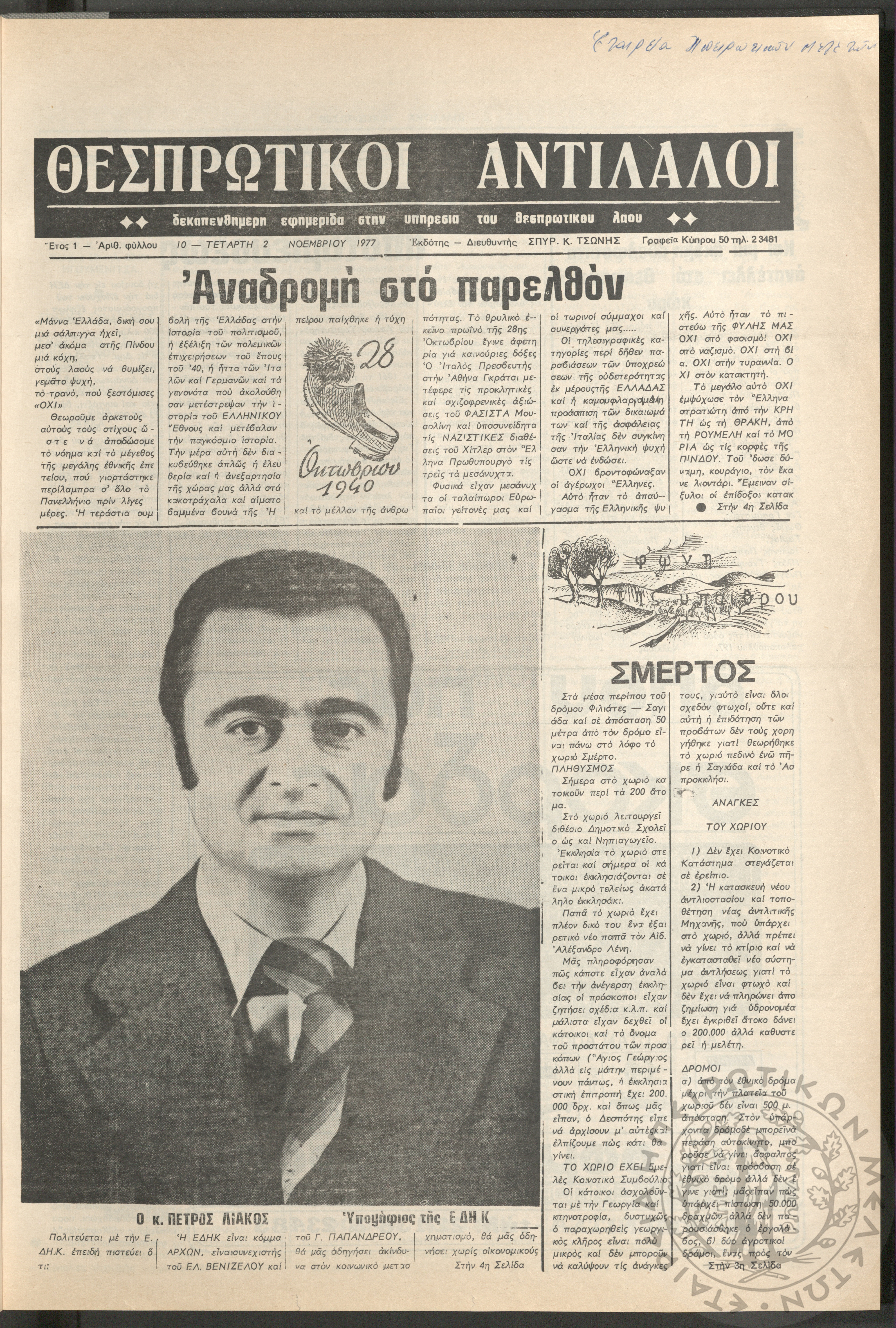 Θεσπρωτικοί Αντίλαλοι: Δεκαπενθήμερη εφημερίδα στην υπηρεσία του Θεσπρωτικού λαού, 1977, φ. 10Έτος 1, φ. 10...